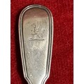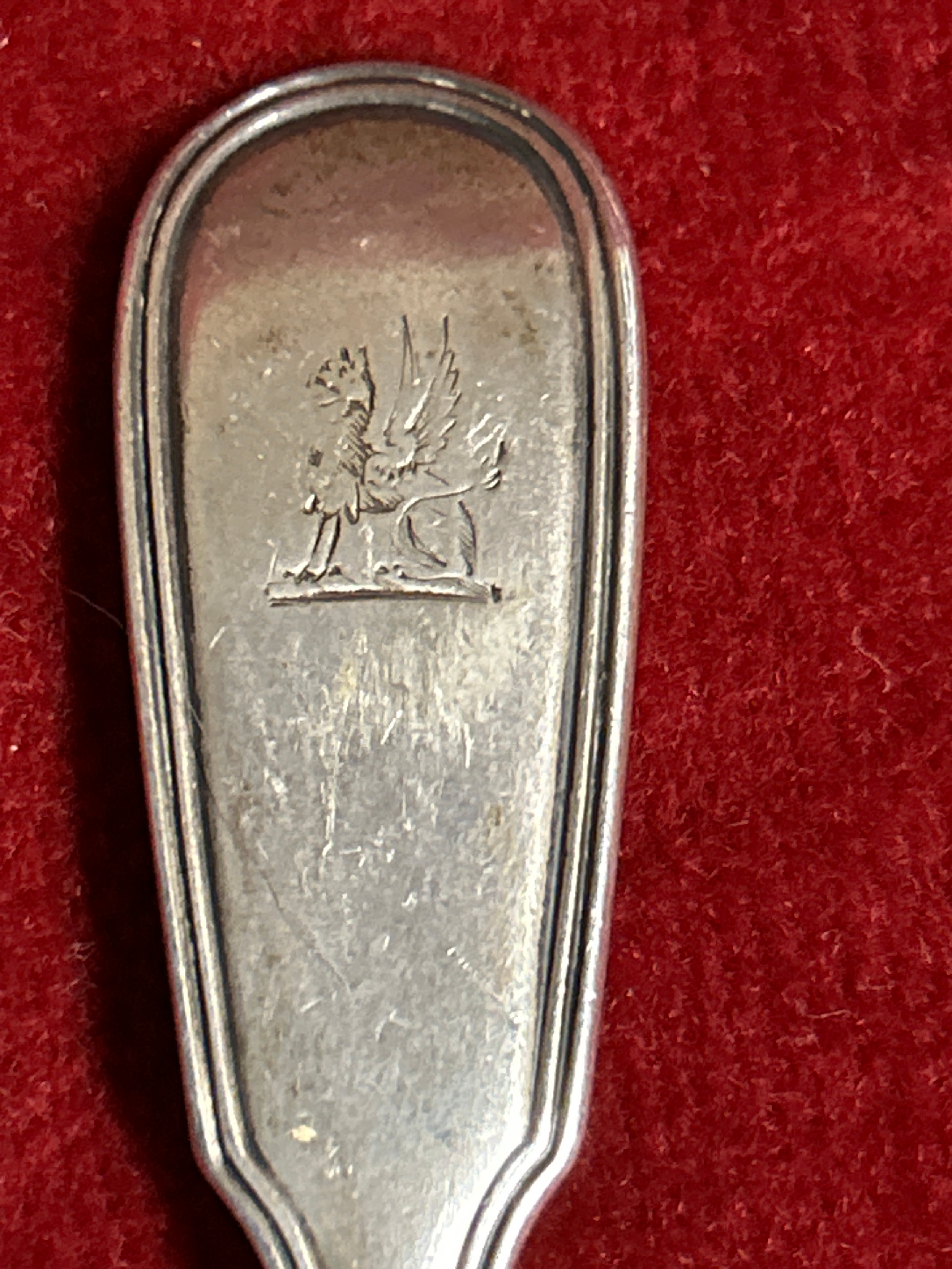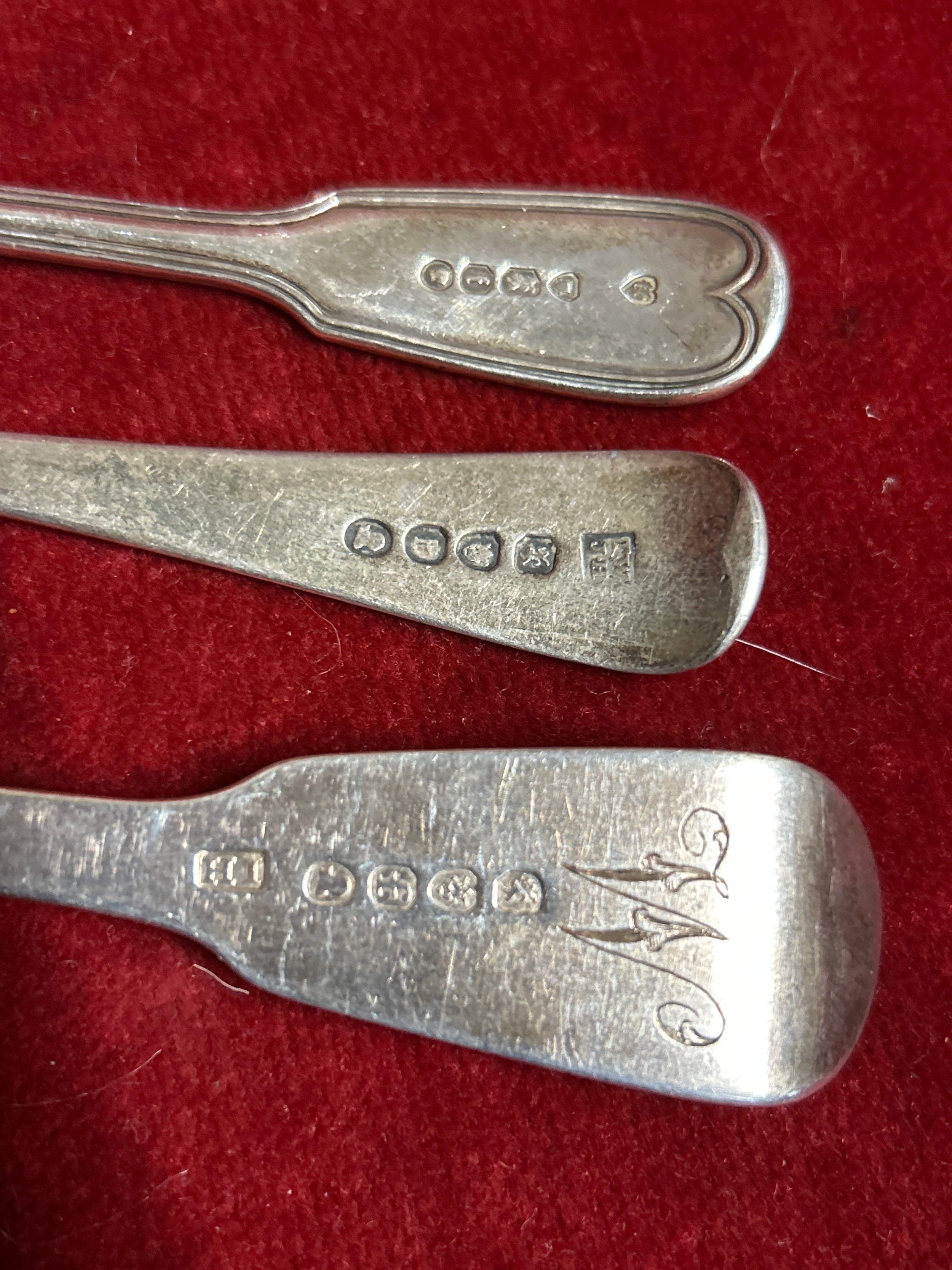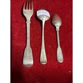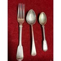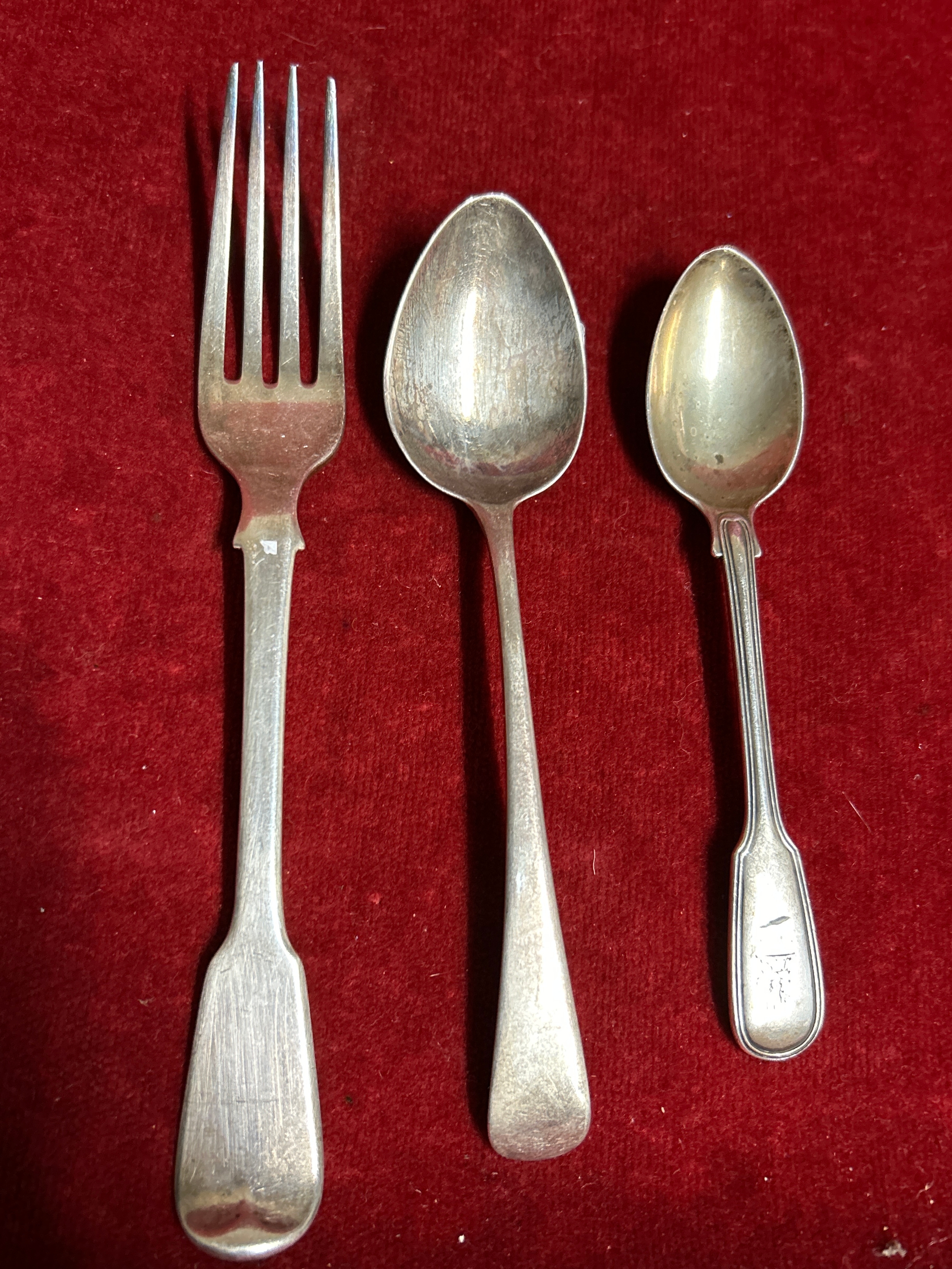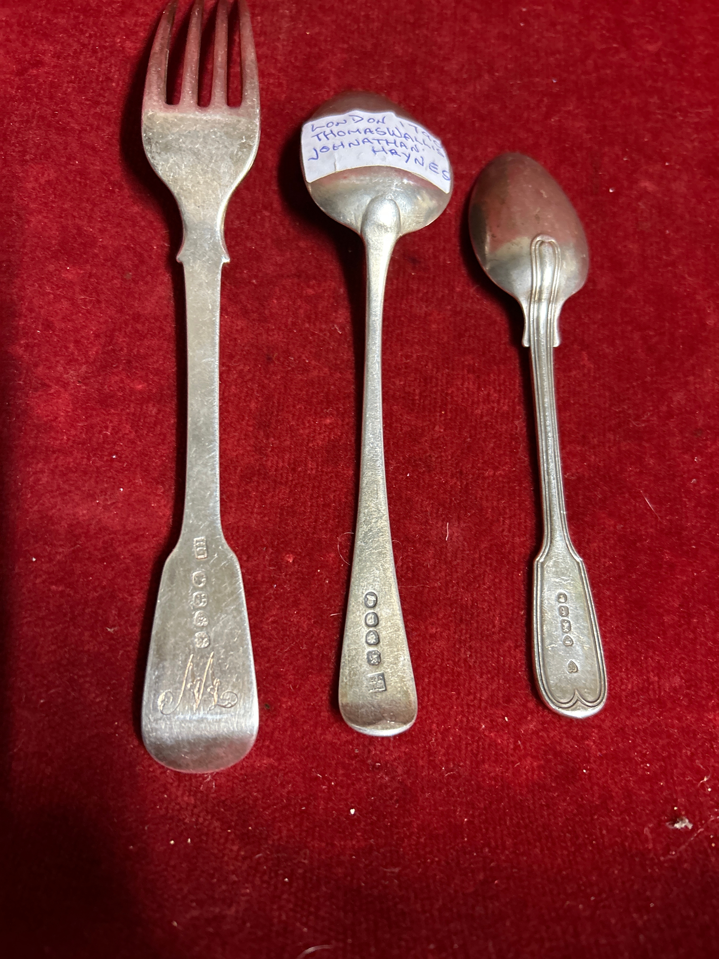 Georgian & Victorian sterling silver flatware to include a table fork, London 1821 by John Hawkins with “W” monogram, small dessert spoon London 1790 by Thos Wallis & Jonathan Hayes and a teaspoon London 1861, by Francis Higgins, the Portland Company with a crest of a griffin. Gross weight 120 grams