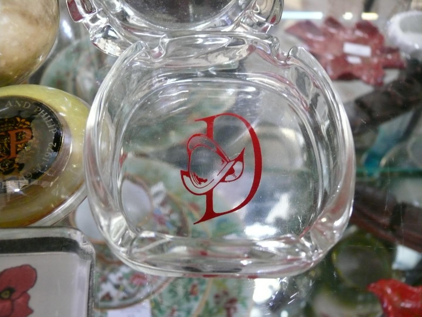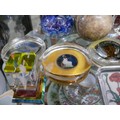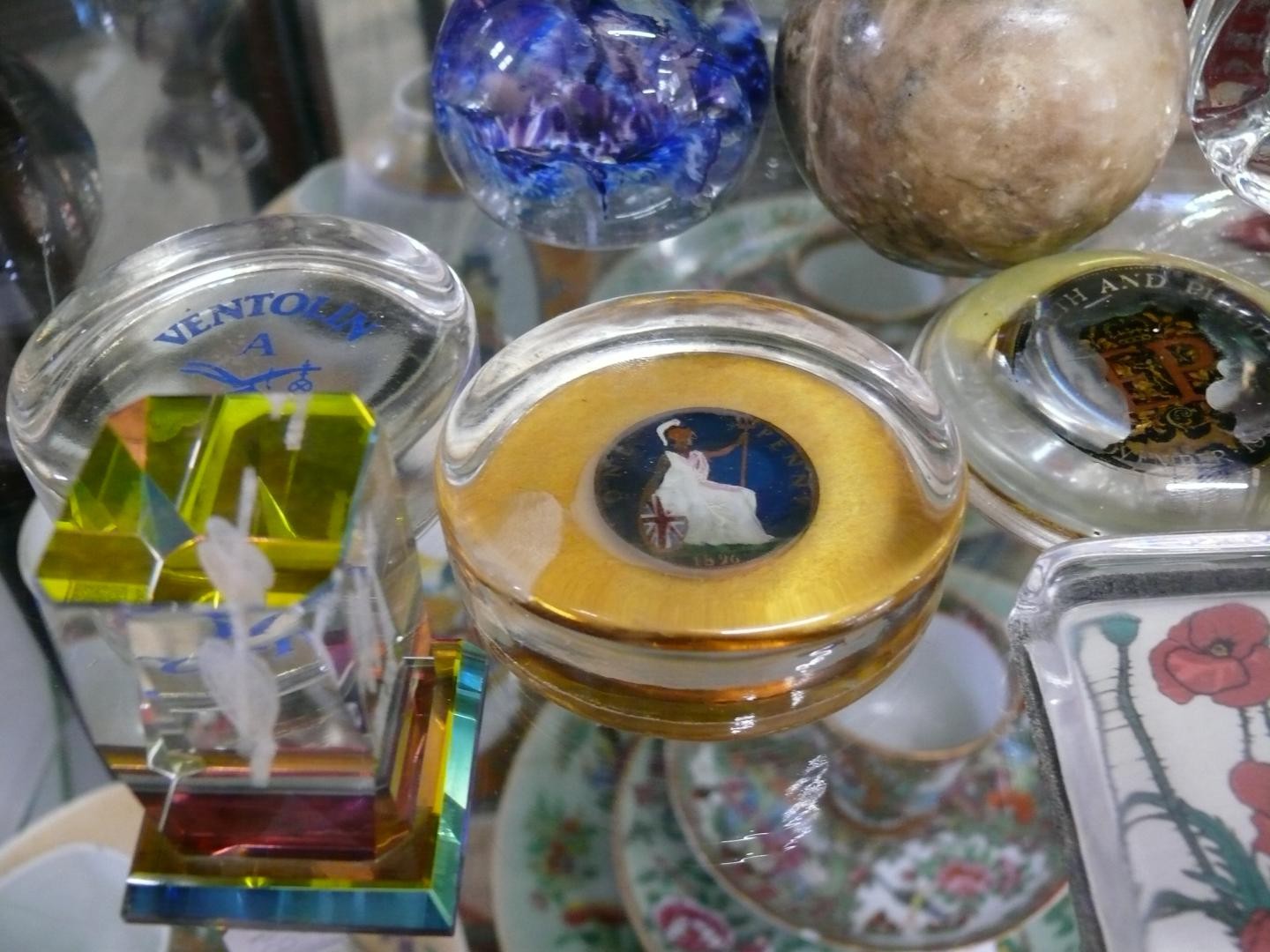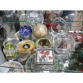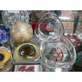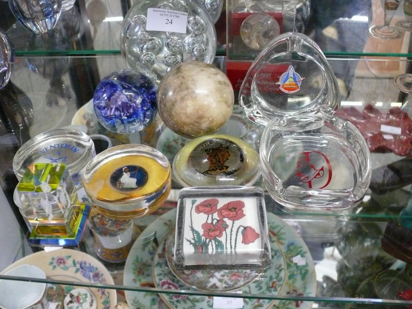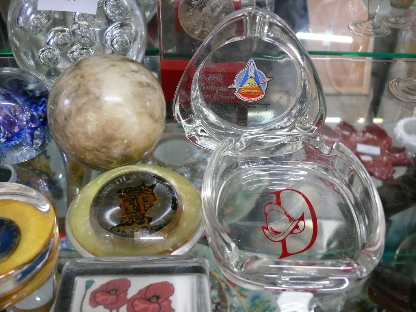 COLLECTION OF PAPERWEIGHTS AND ASHTRAYS. INCLUDING GENUINE HAND CARVED ALABASTER BALL, BUBBLE GLASS BALL, BLUE SWIRL BALL, 2X YARNAMELL HANDPAINTED COINS IN PYREX, 40TH ANNIVERSARY CROWN AND OTHERS. ALSO 2X GLASS ASHTRAYS, ONE FOR KENNEDY SPACE CENTRE.