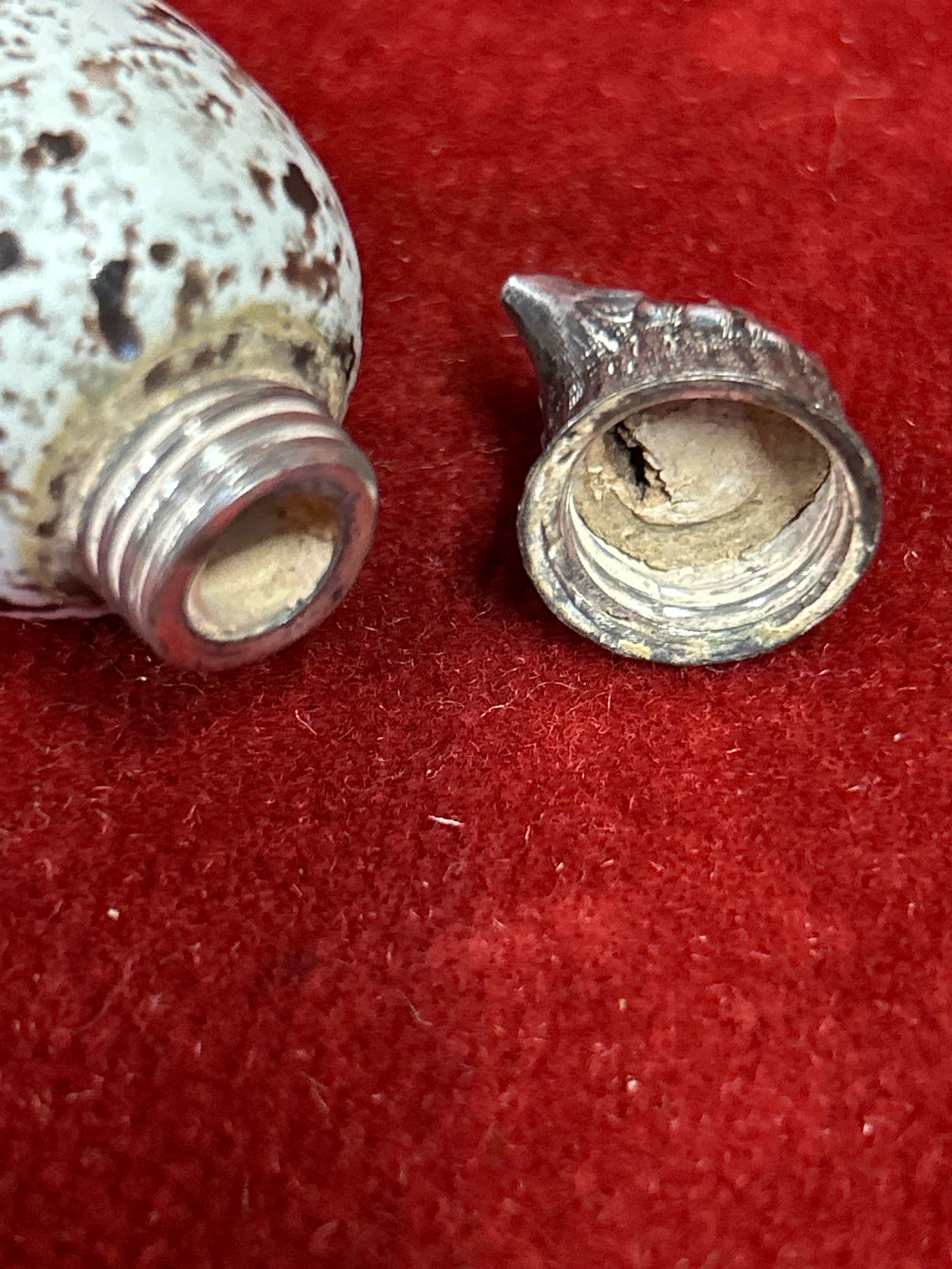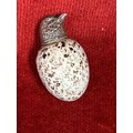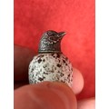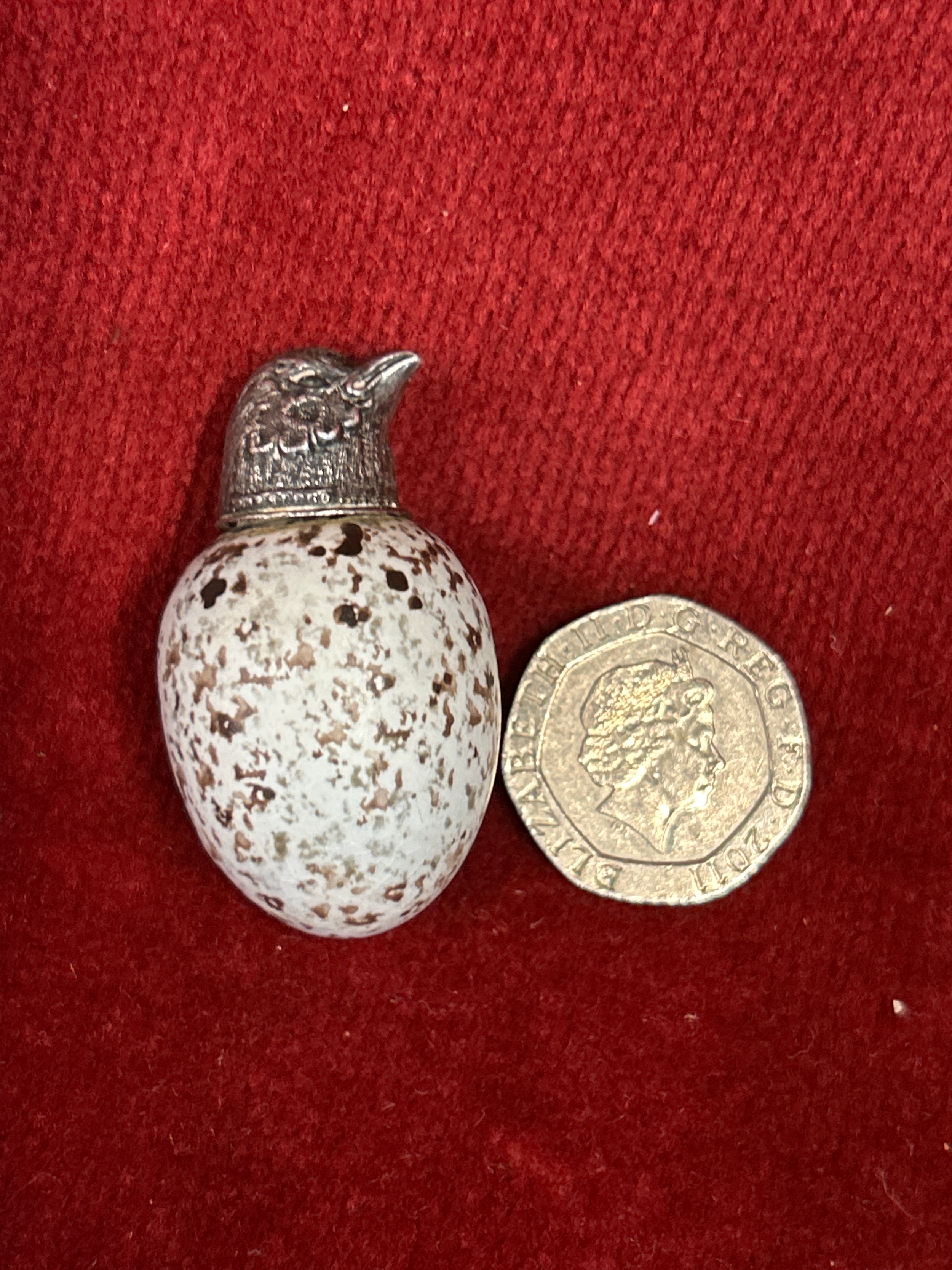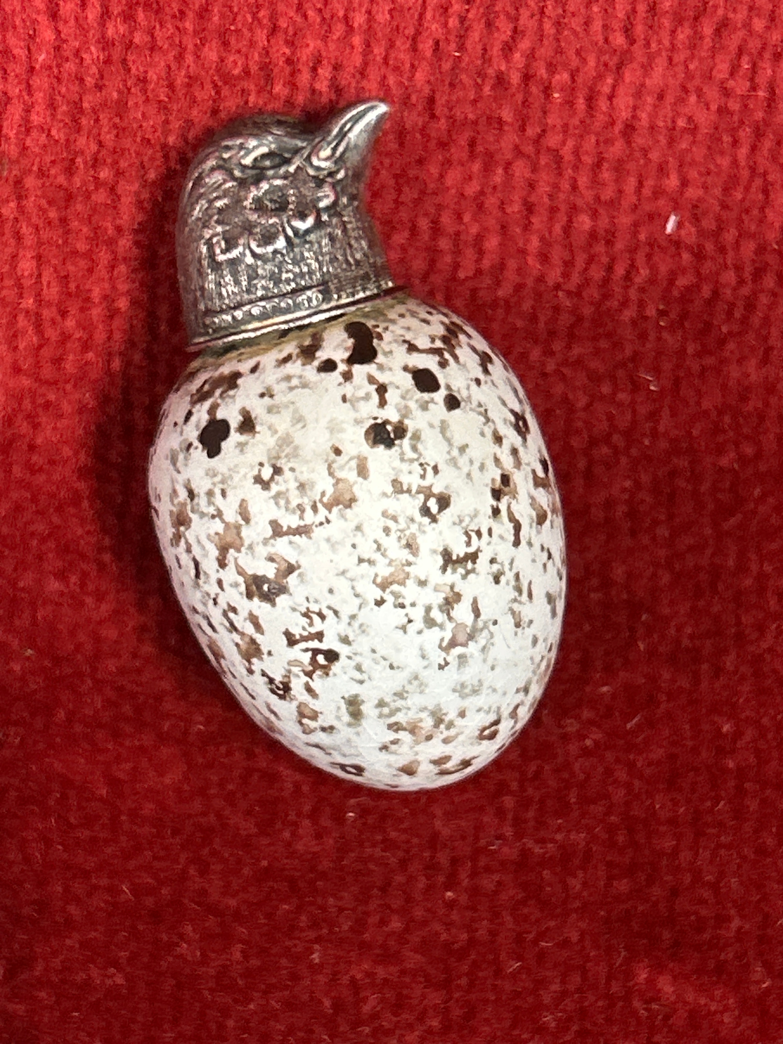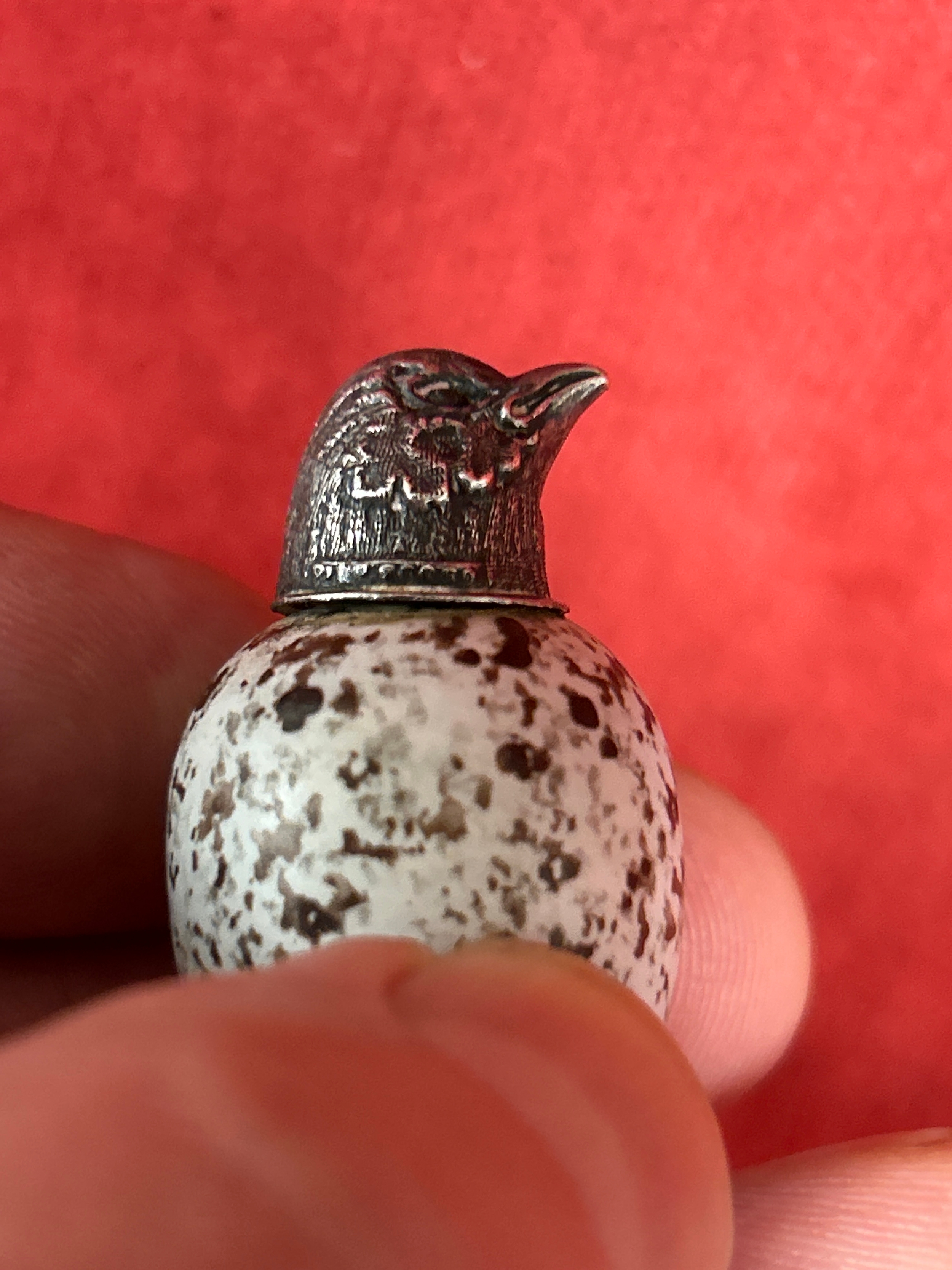 A beautiful Victorian ceramic bird egg scent bottle with silver top. The egg with registered design number 20772 which was registered to Mackintyres of Burslem. The bird head likely silver with no hallmark but also with a registered design number (illegible).