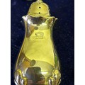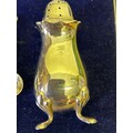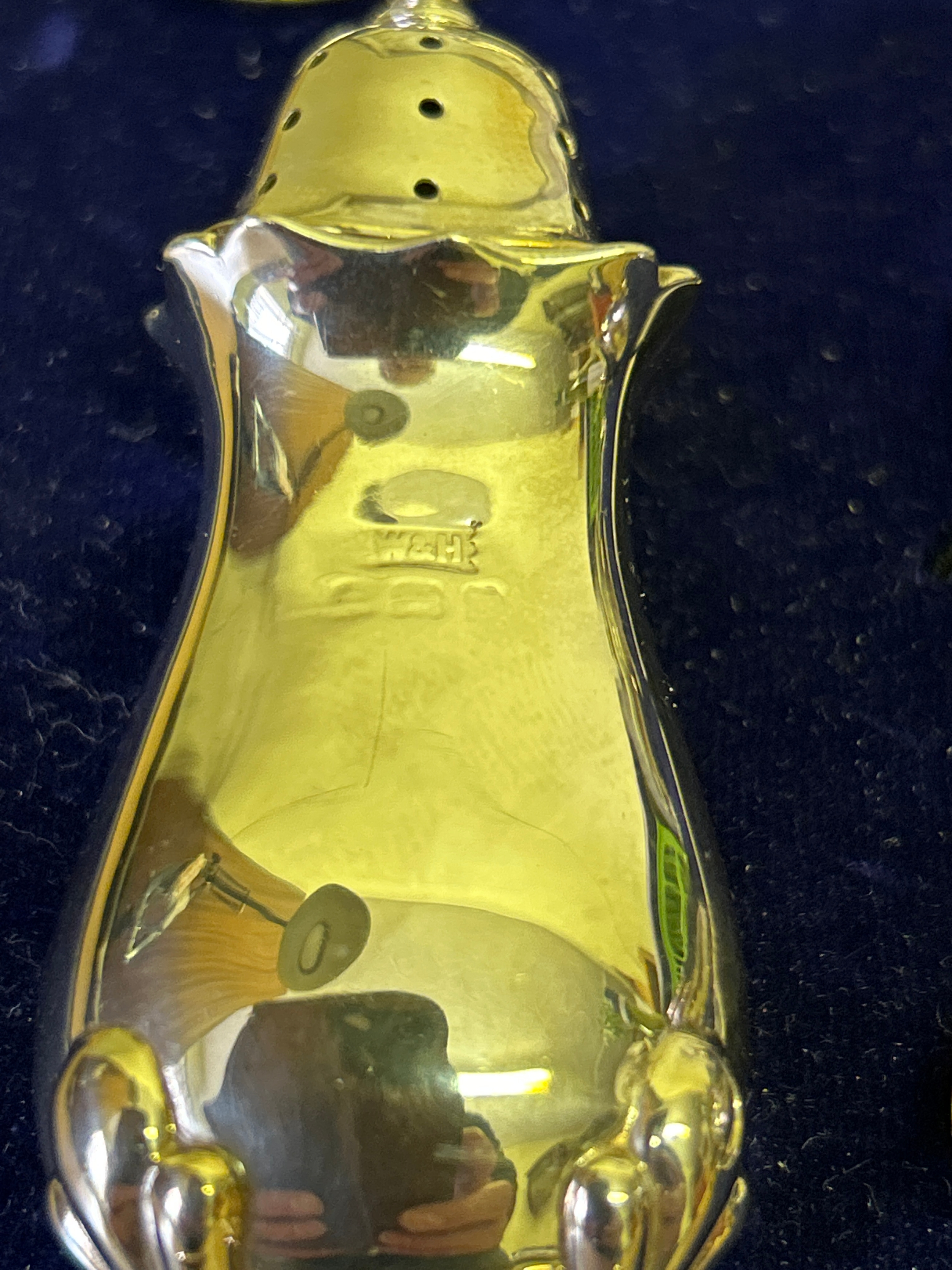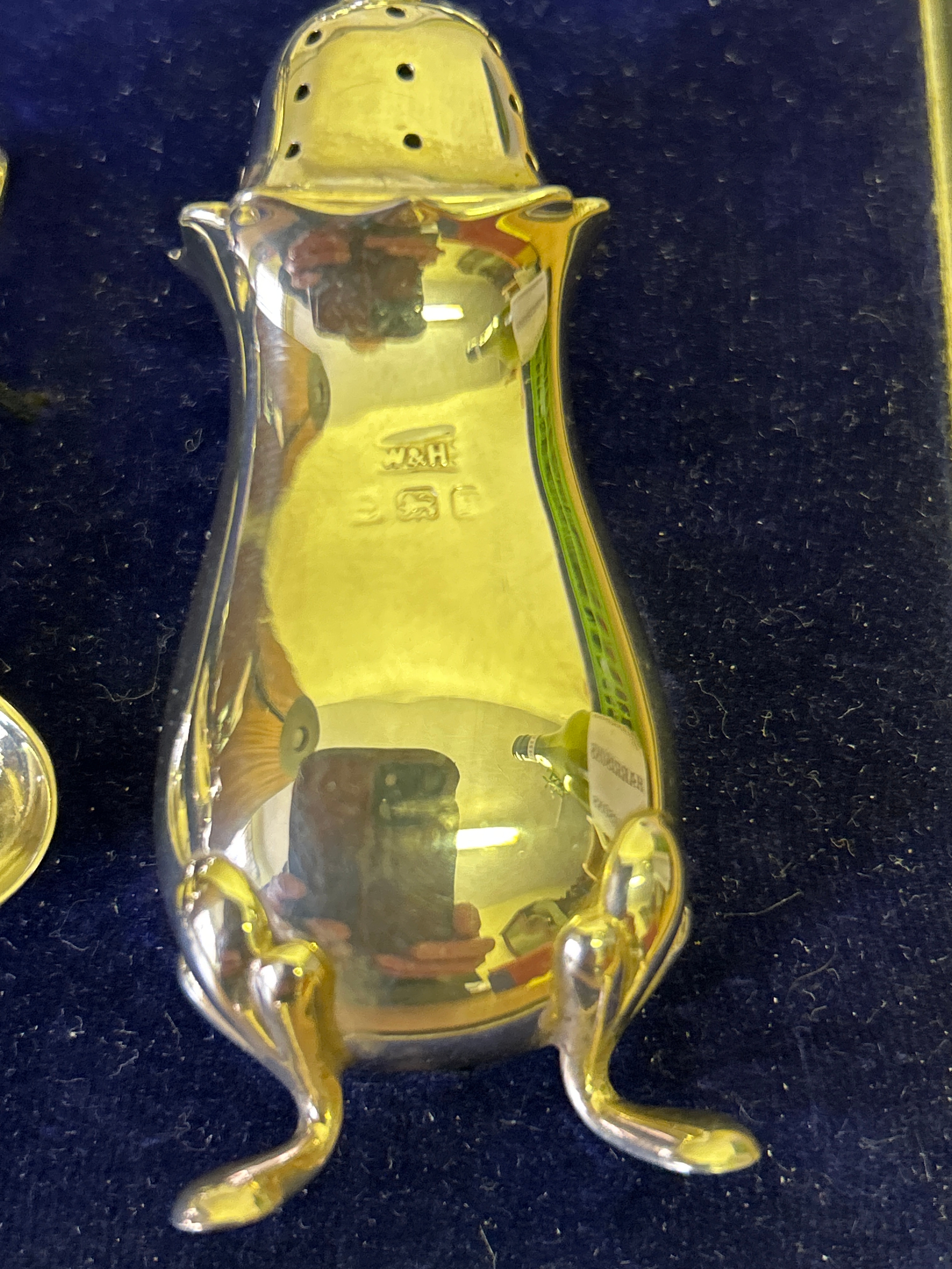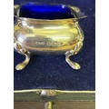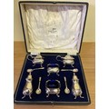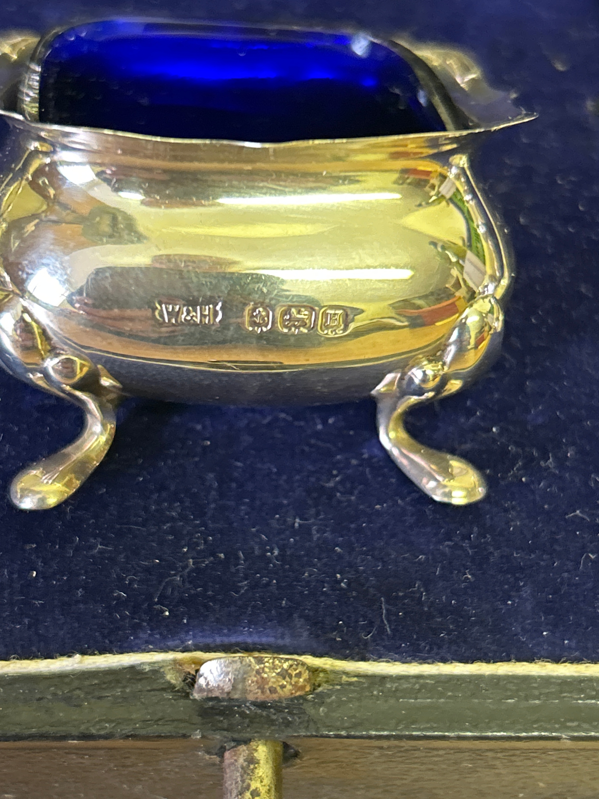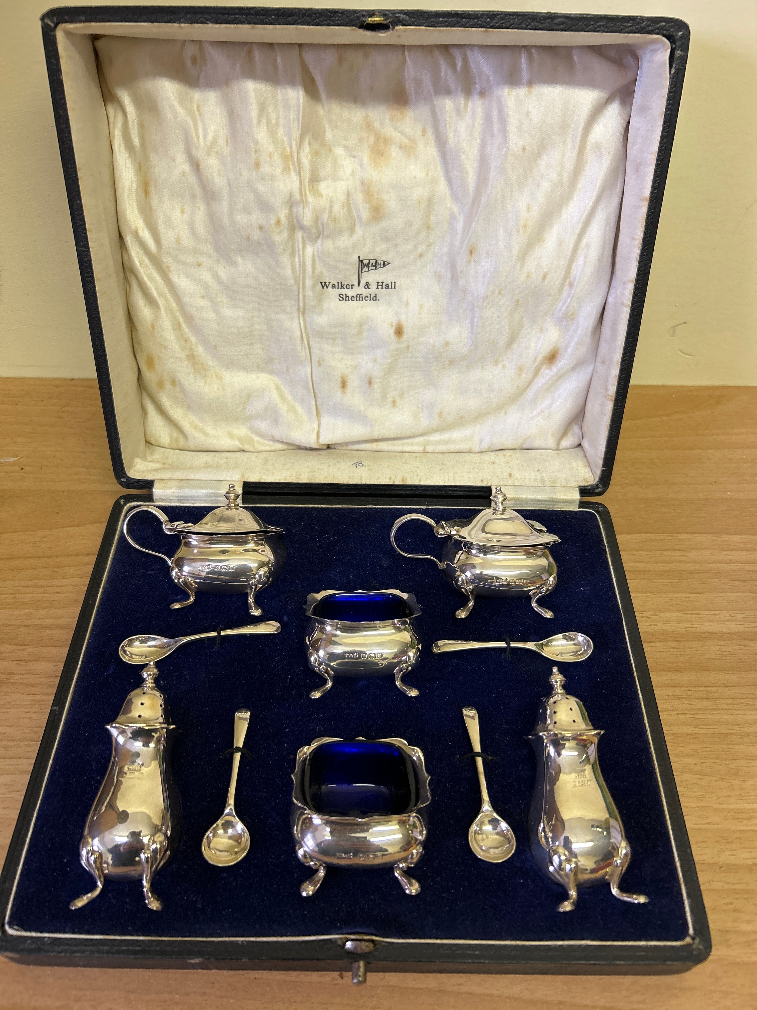 A very good Sterling silver cased condiment set by Walker & Hall, comprising 2 mustard pots with blue glass liners, 2 open salts with blue glass liners, 2 pepper pots, 2 mustard & 2 salt spoons. Silver weight 210 grams. In vgc, all glass good. Marks rubbed on pepper pots see photos