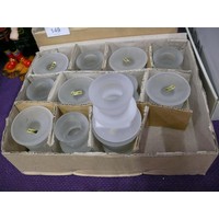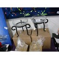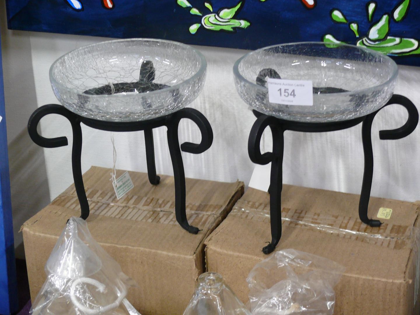 A pair of pyramid glass oil burners and a pair of crackled glass dishes with black metal stands, all new with boxes