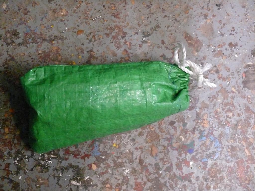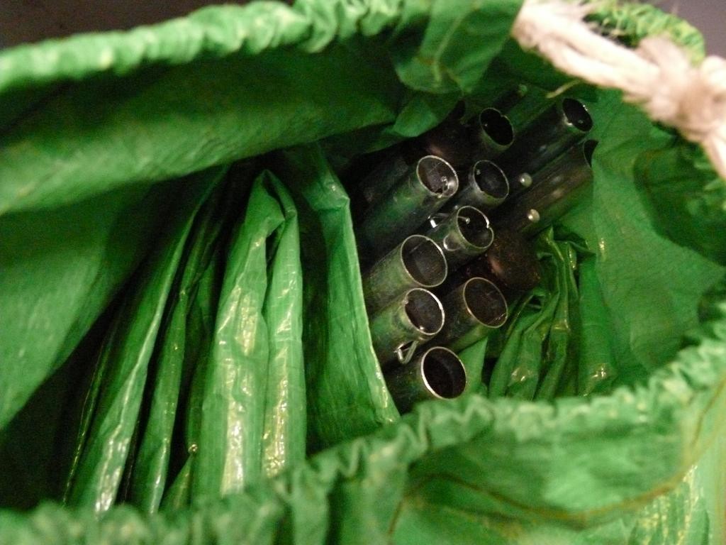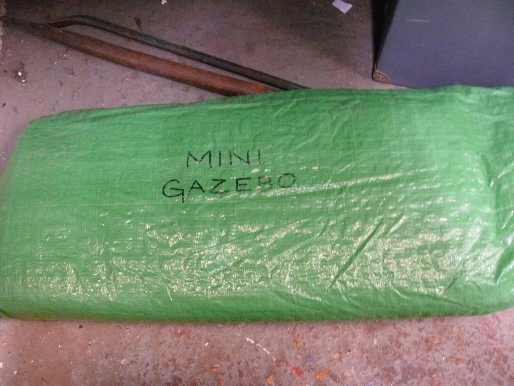 A MINI GAZEBO IN BAG TOGETHER WITH A CROW BAR AND LARGE METAL PIN TOOL