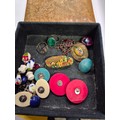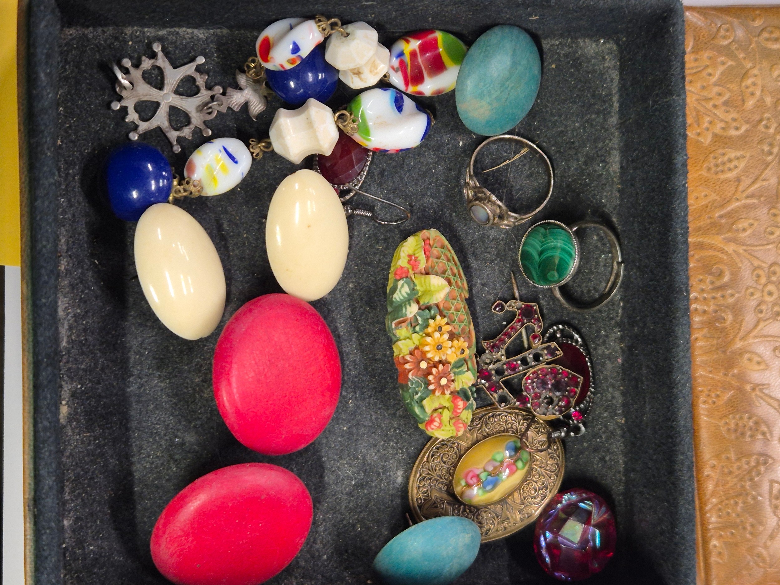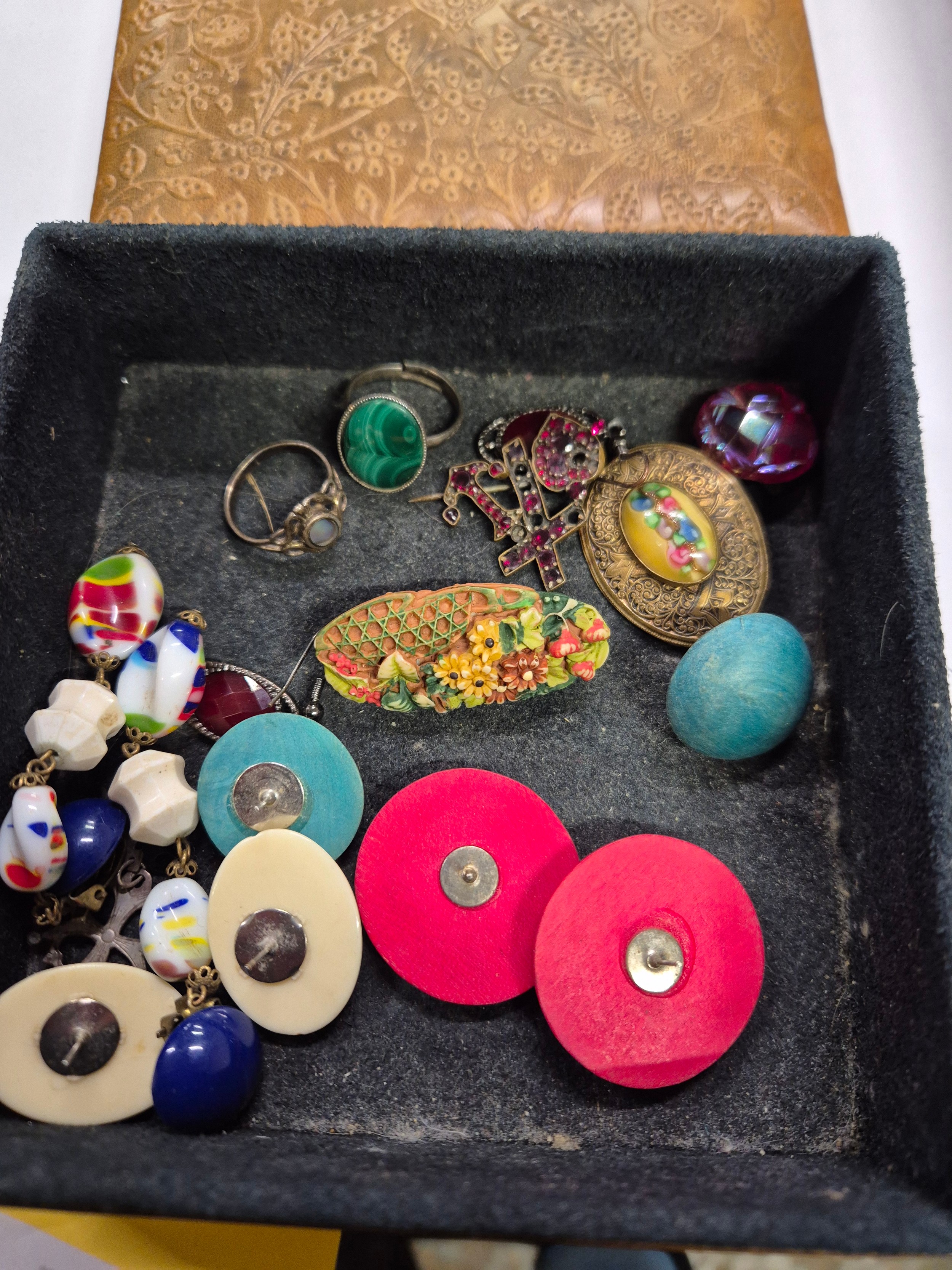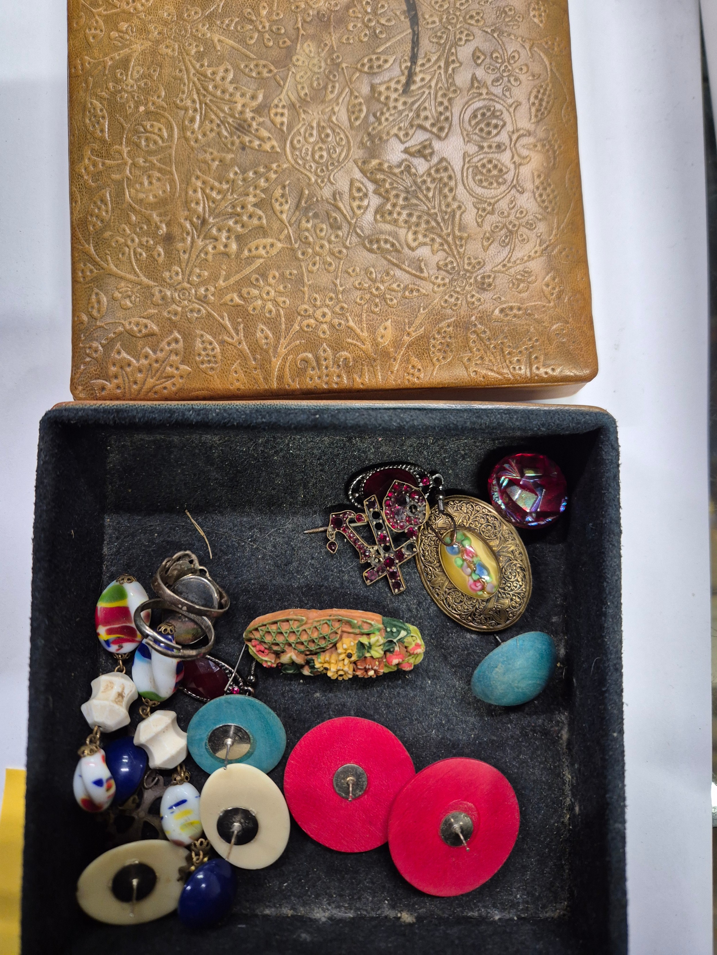 Vintage costume jewellery including silver ring with abalone cabochon, barbola brooch, malachite ring, Czech glass earrings, Victorian garnet cross, heart & anchor brooch etc. in a tooled leather box