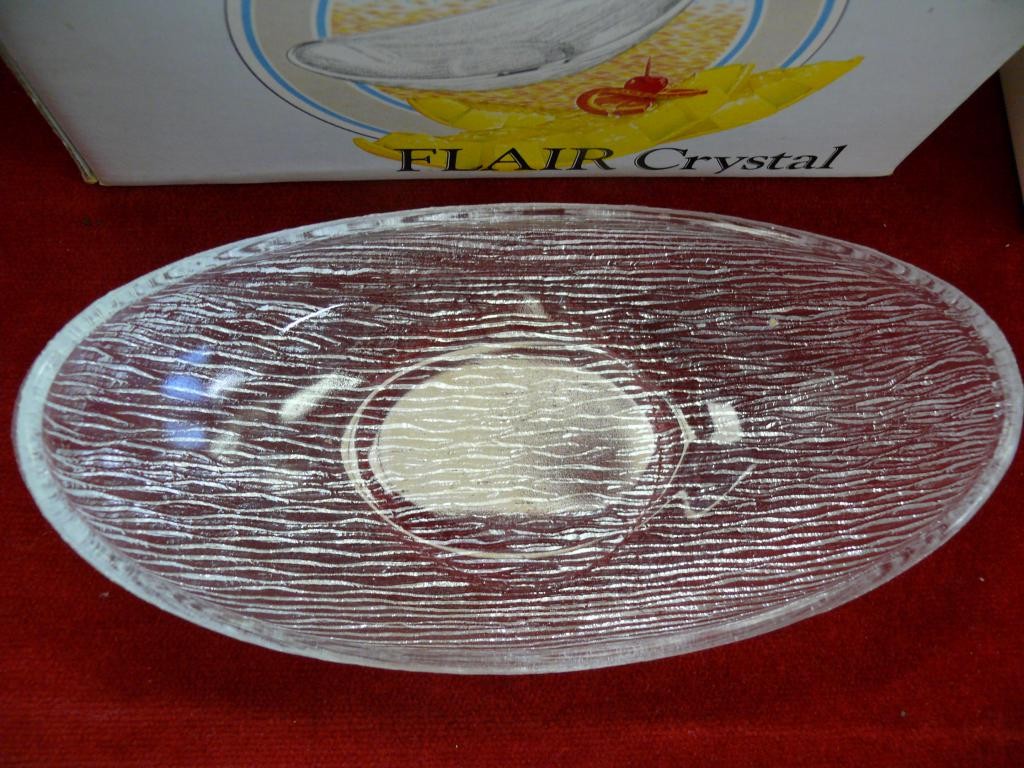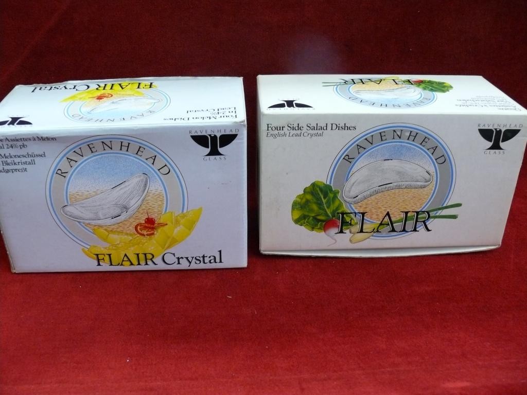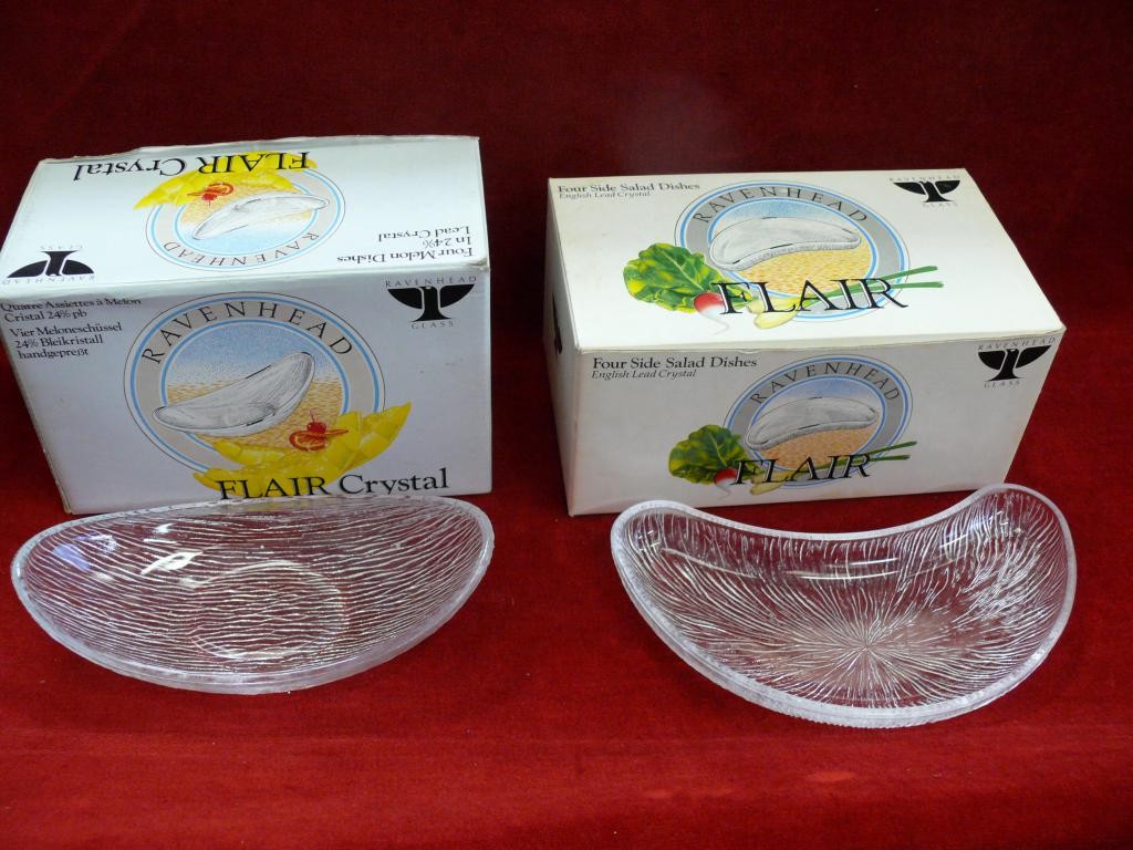 2 BOXES OF 20TH CENTURY RAVENHEAD GLASS COMPRISING 4 MELON DISHES AND 4 SIDE SALAD DISHES
