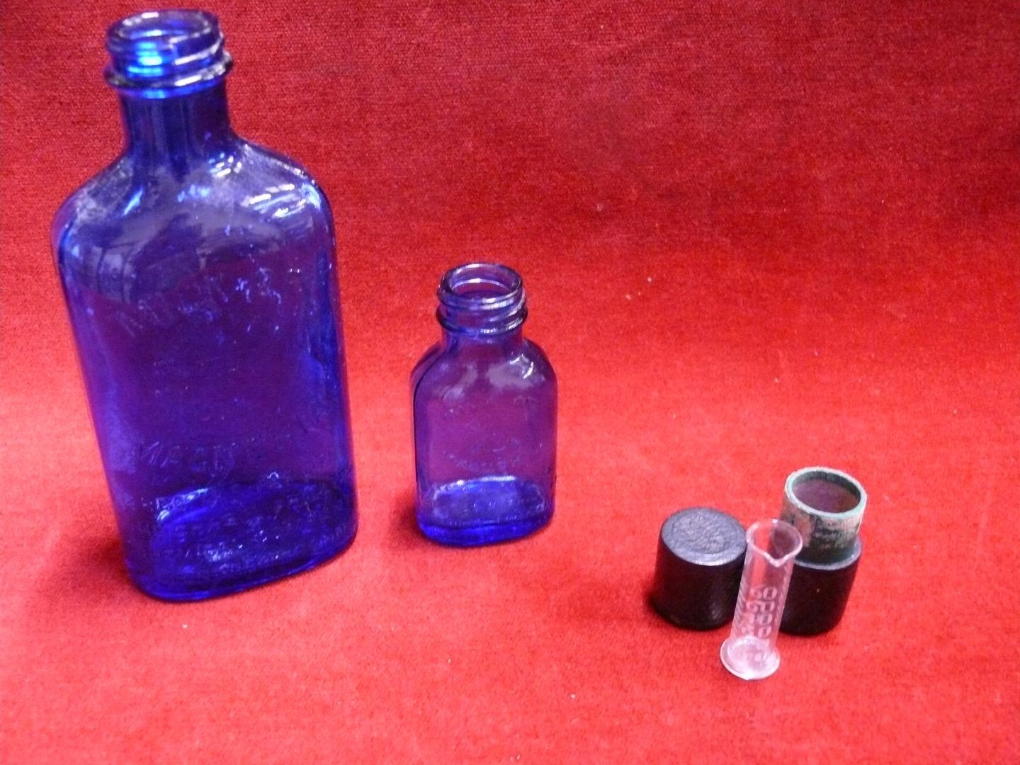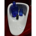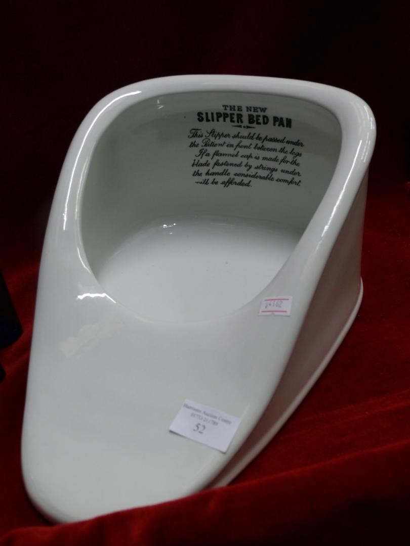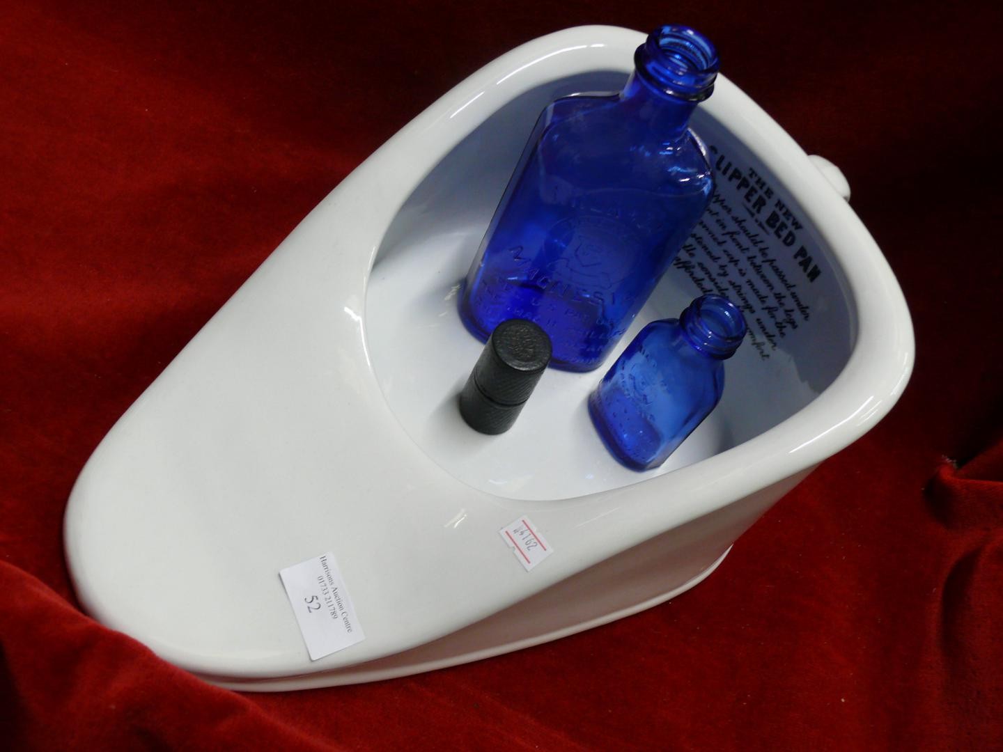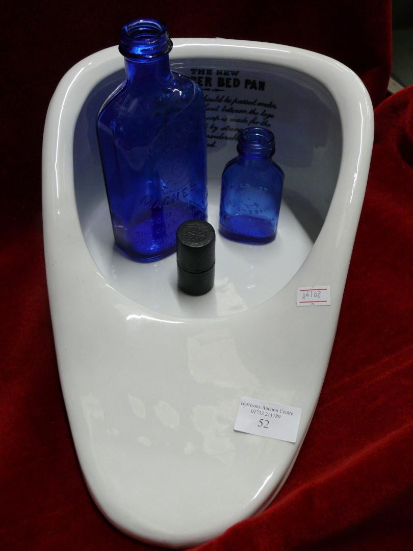 SLIPPER BED PAN TOGETHER WITH TWO MILK OF MAGNESIA BLUE BOTTLES & AN ANTIQUE MINIM MEASURE IN LEATHER CASE BY T W LONDON