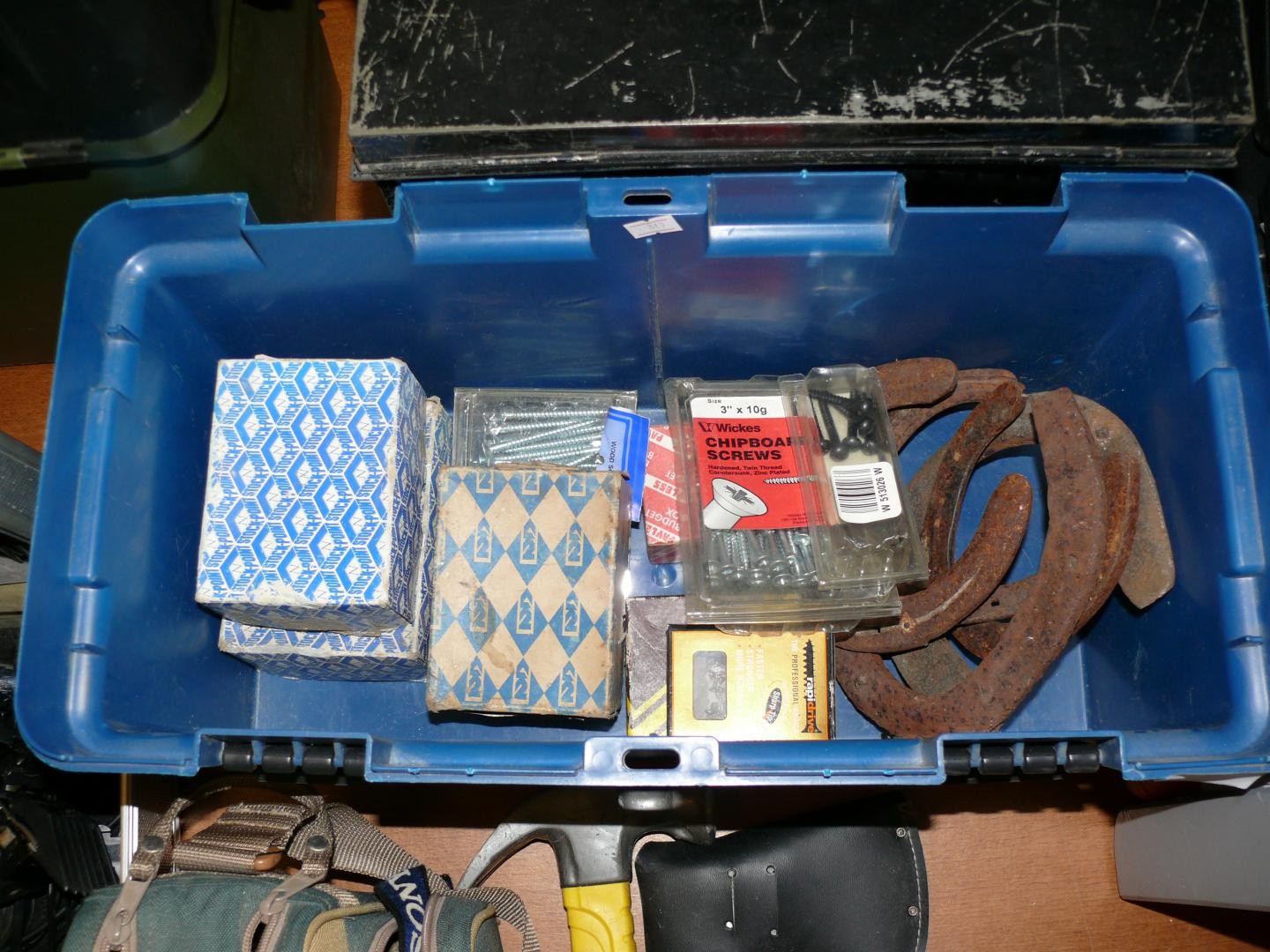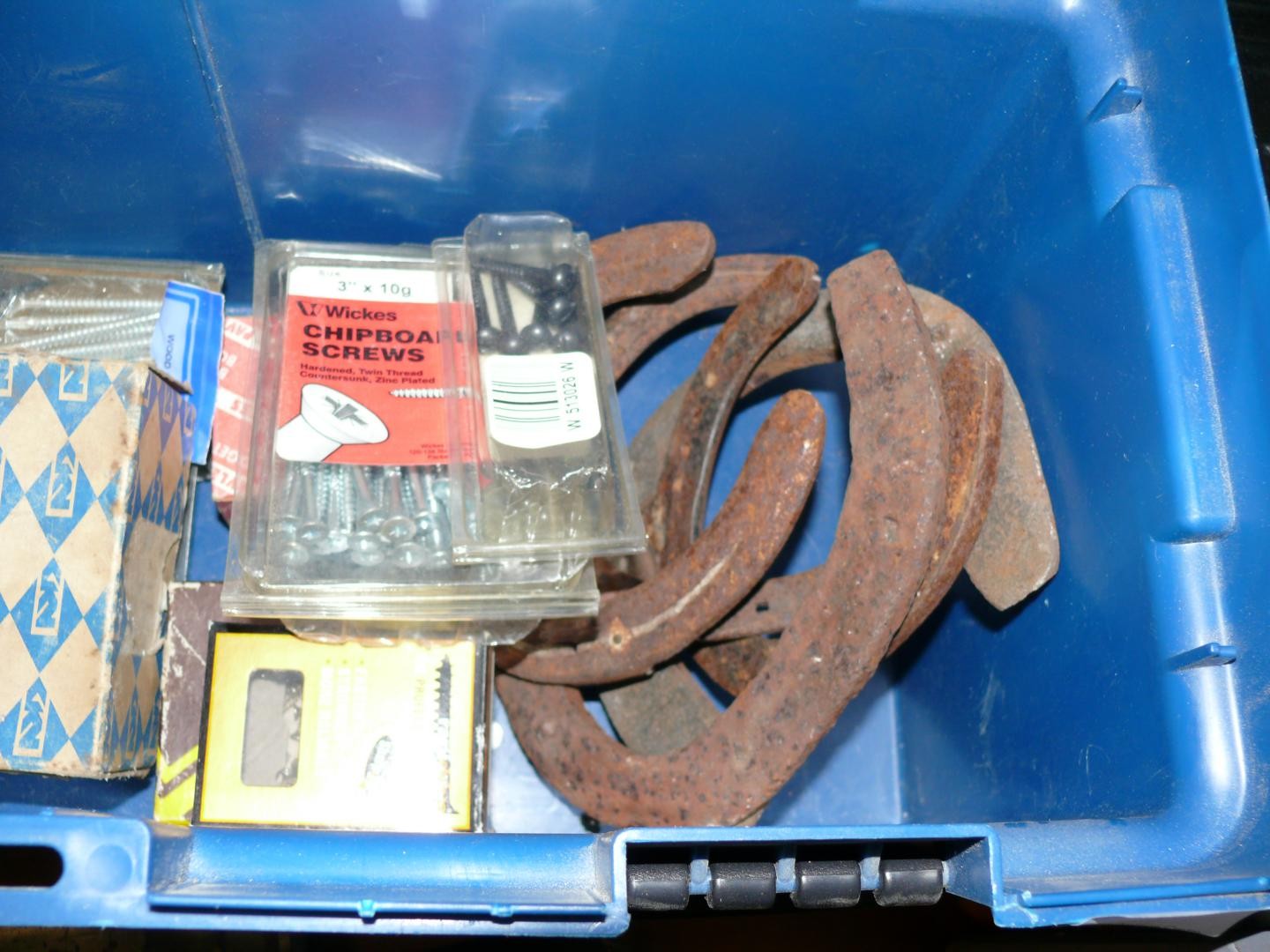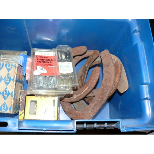 TUB OF SCREWS AND VINTAGE HORSE SHOES