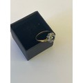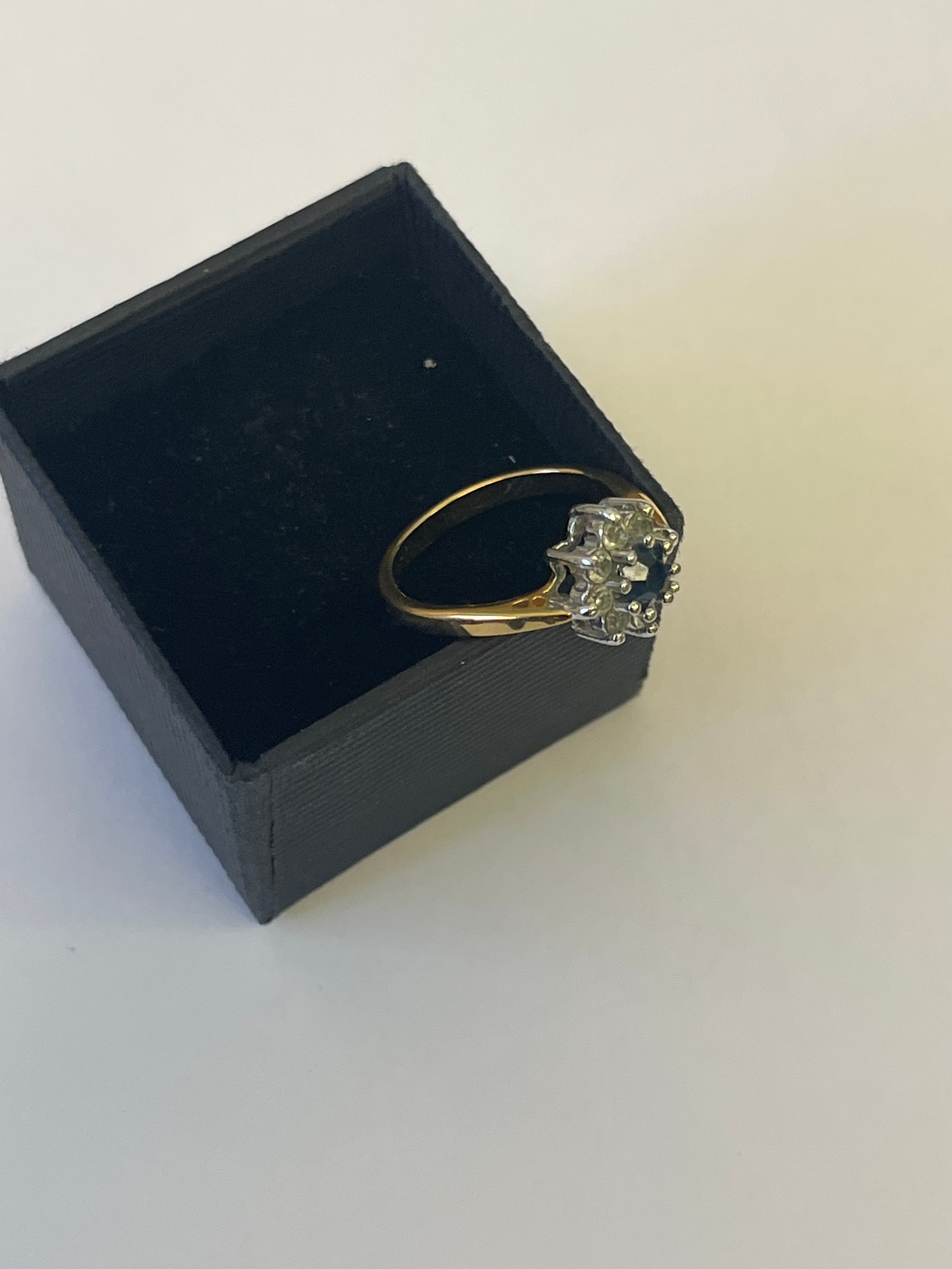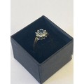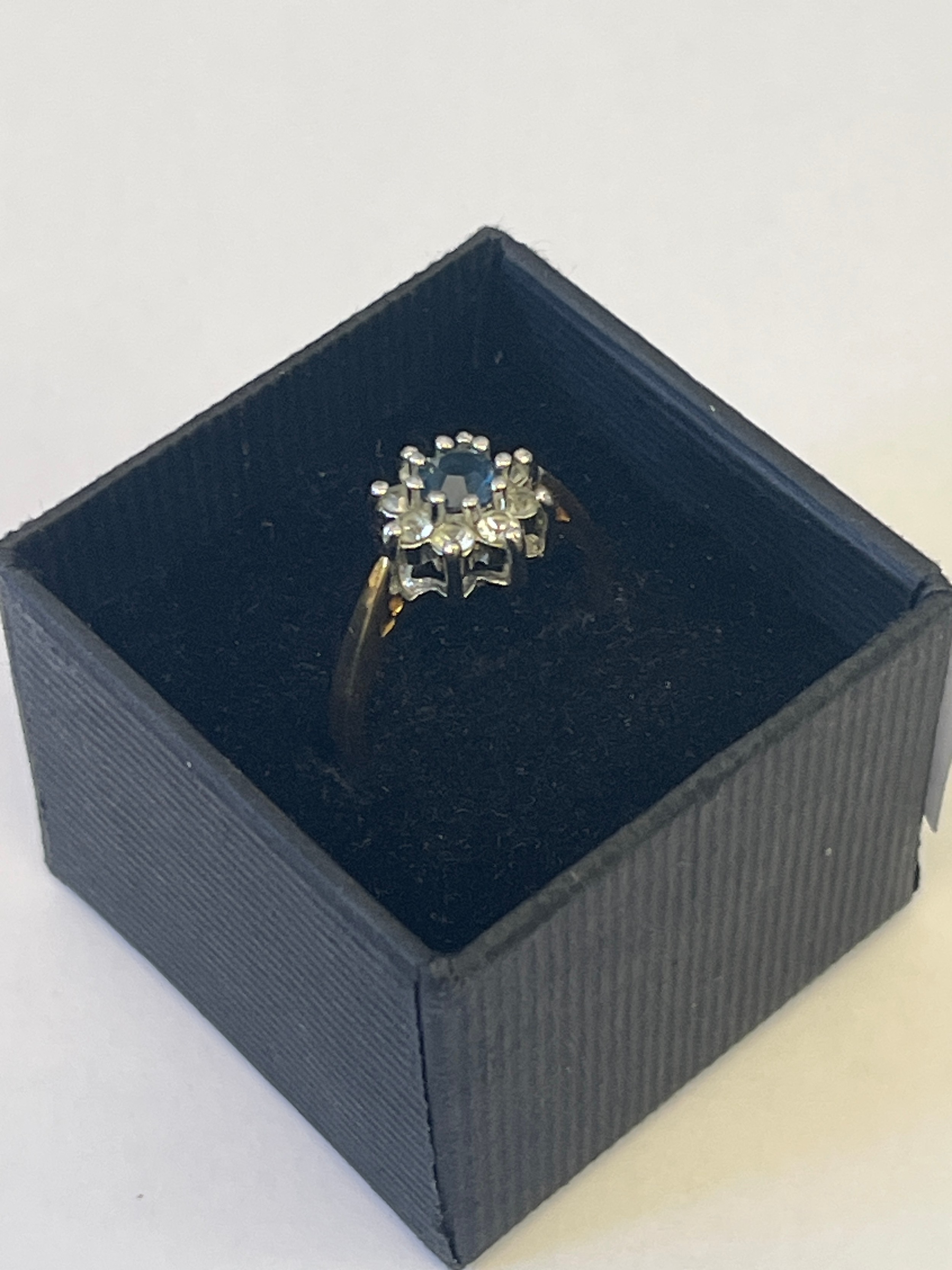 PRETTY SILVER DRESS RING WITH BLUE CENTRE STONE AND CLUSTER OF CLEAR STONES, SIZE P