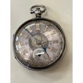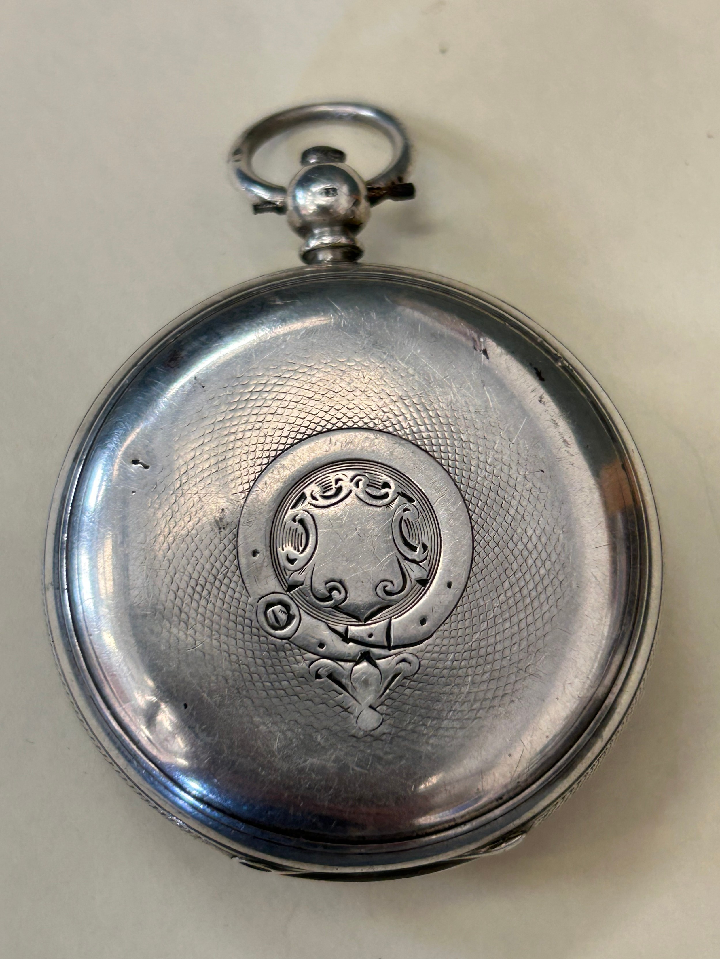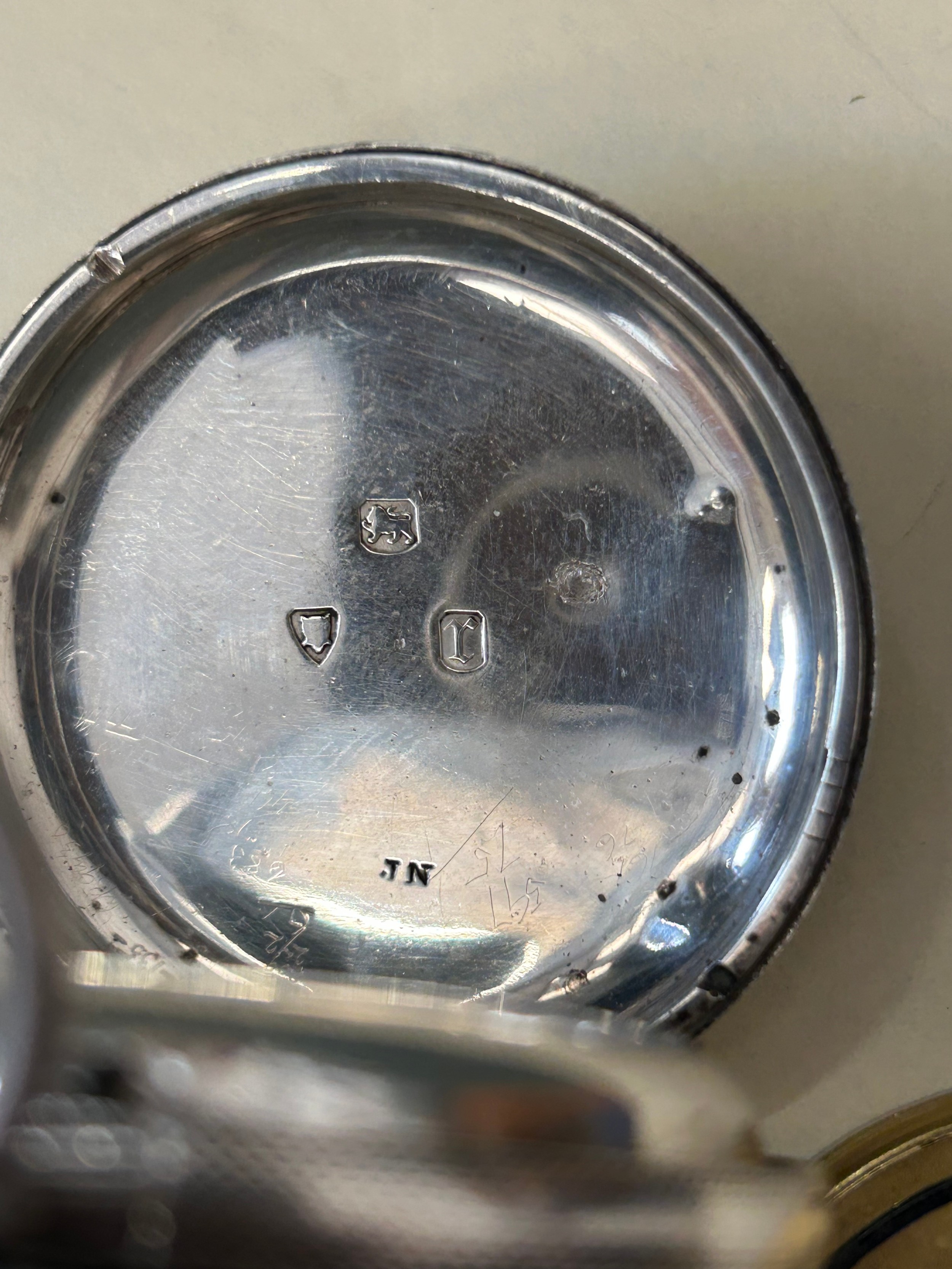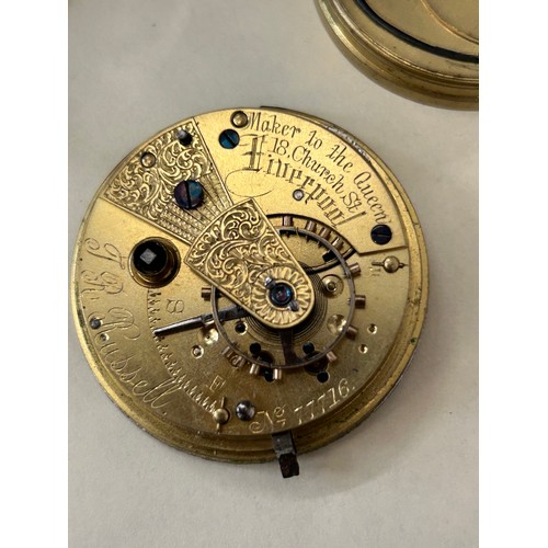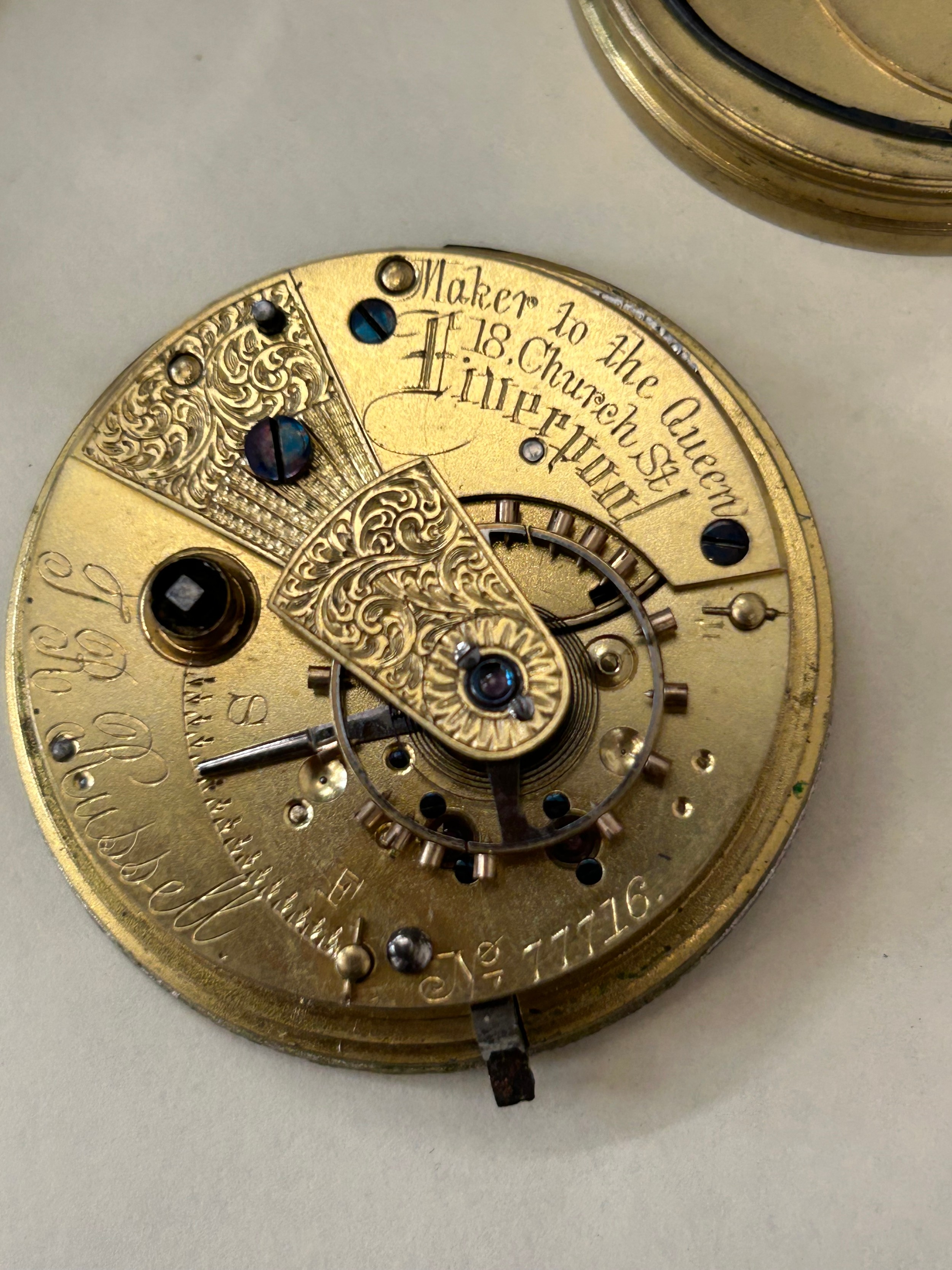 ANTIQUE FUSEE POCKET WATCH IN STERLING SILVER CASE - LONDON 1872, MOVEMENT BY THOMAS RUSSELL, 18 CHURCH STREET, LIVERPOOL "MAKER TO THE QUEEN". INLAID SILVERED FACE WITH ROMAN NUMERALS IN THE GOTHIC STYLE.