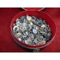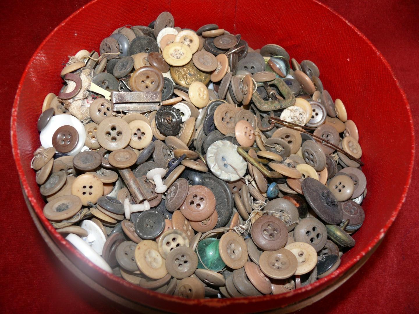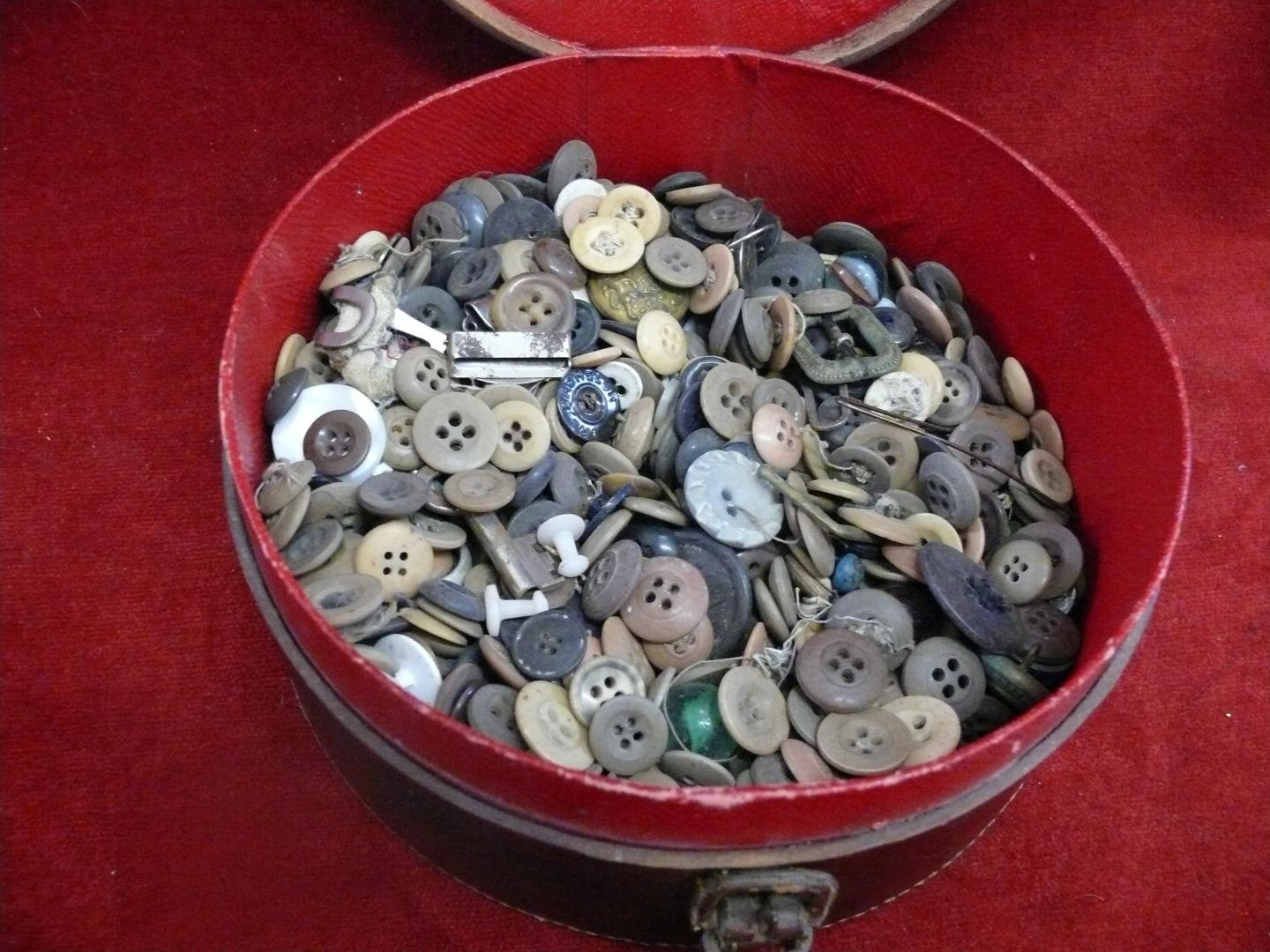 Vintage leather shirt collar box with contents of vintage buttons