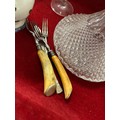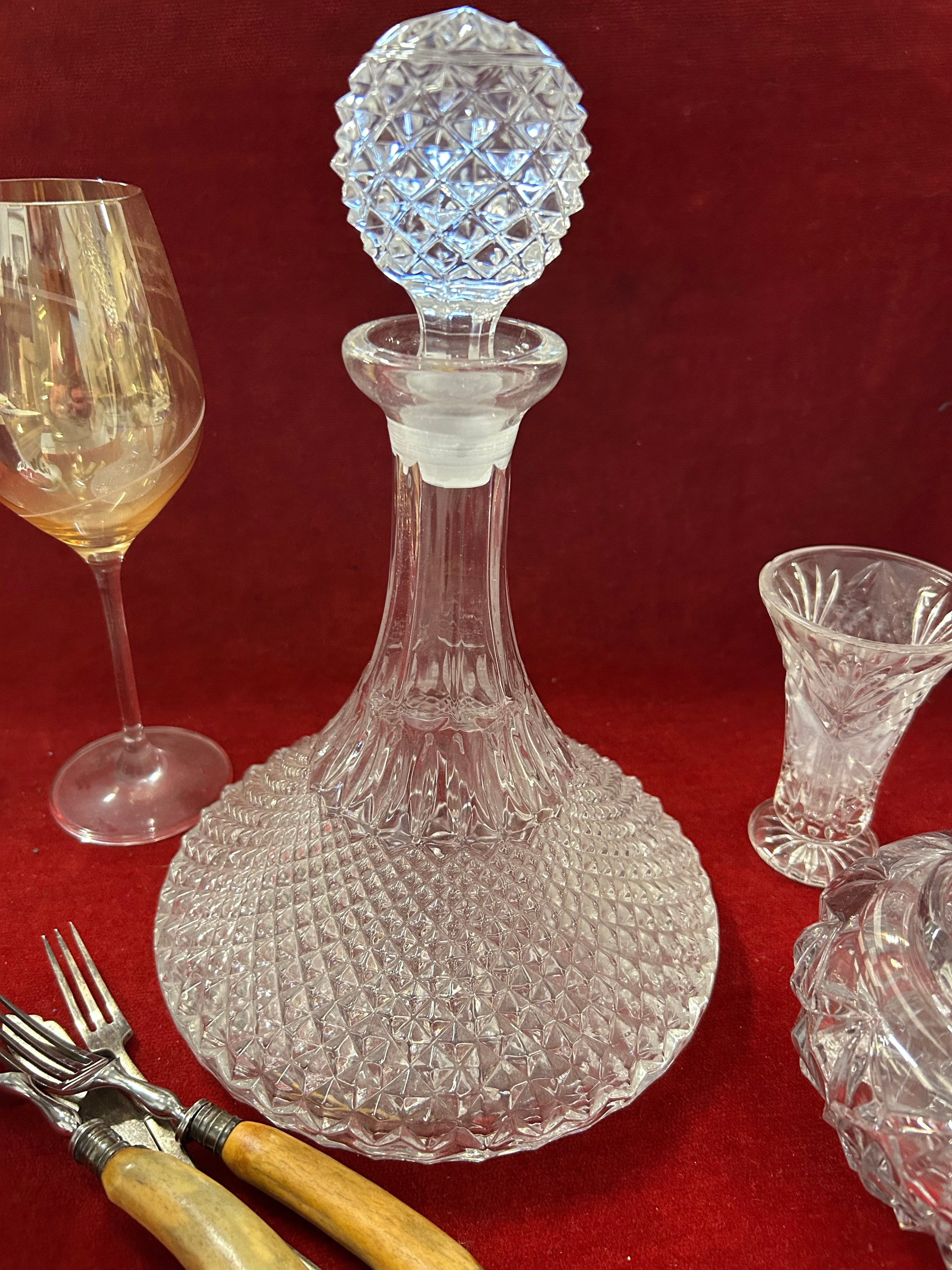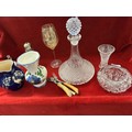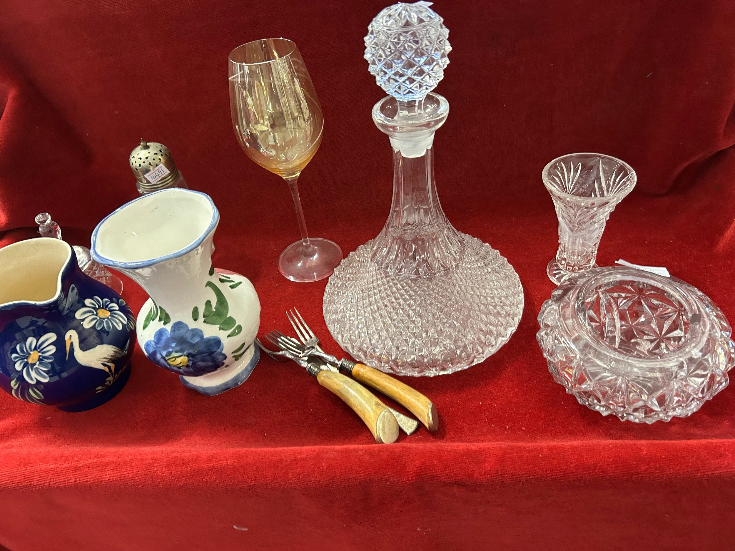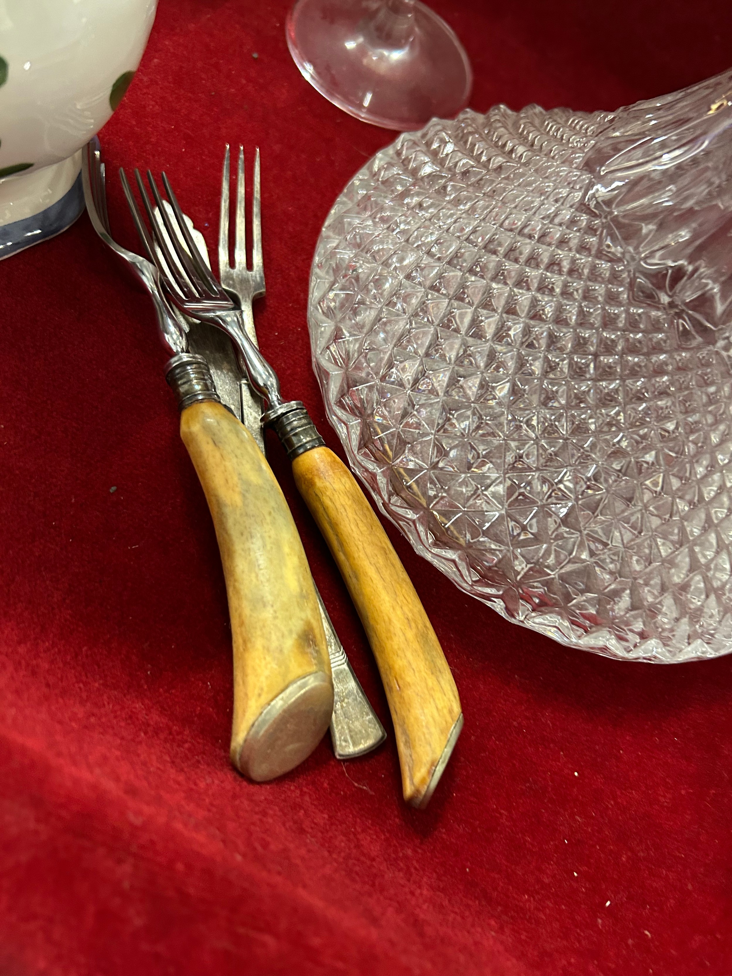 MIXED LOT OF CERAMICS, GLASS AND HORN HANDLED CUTLERY