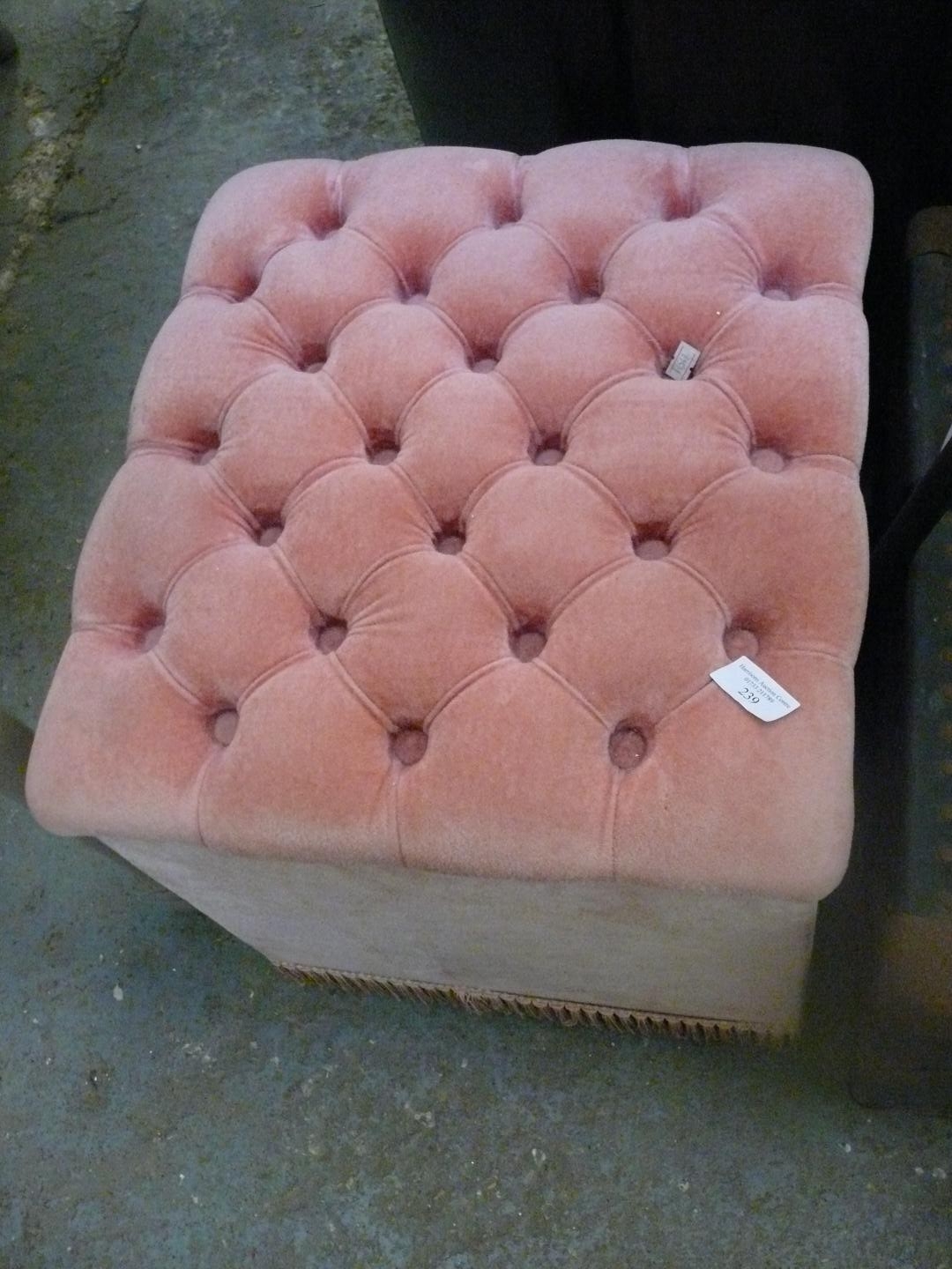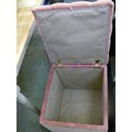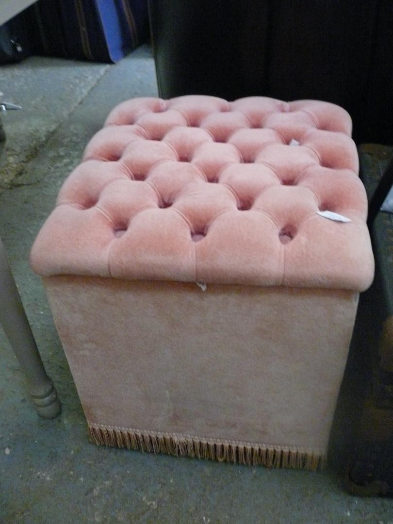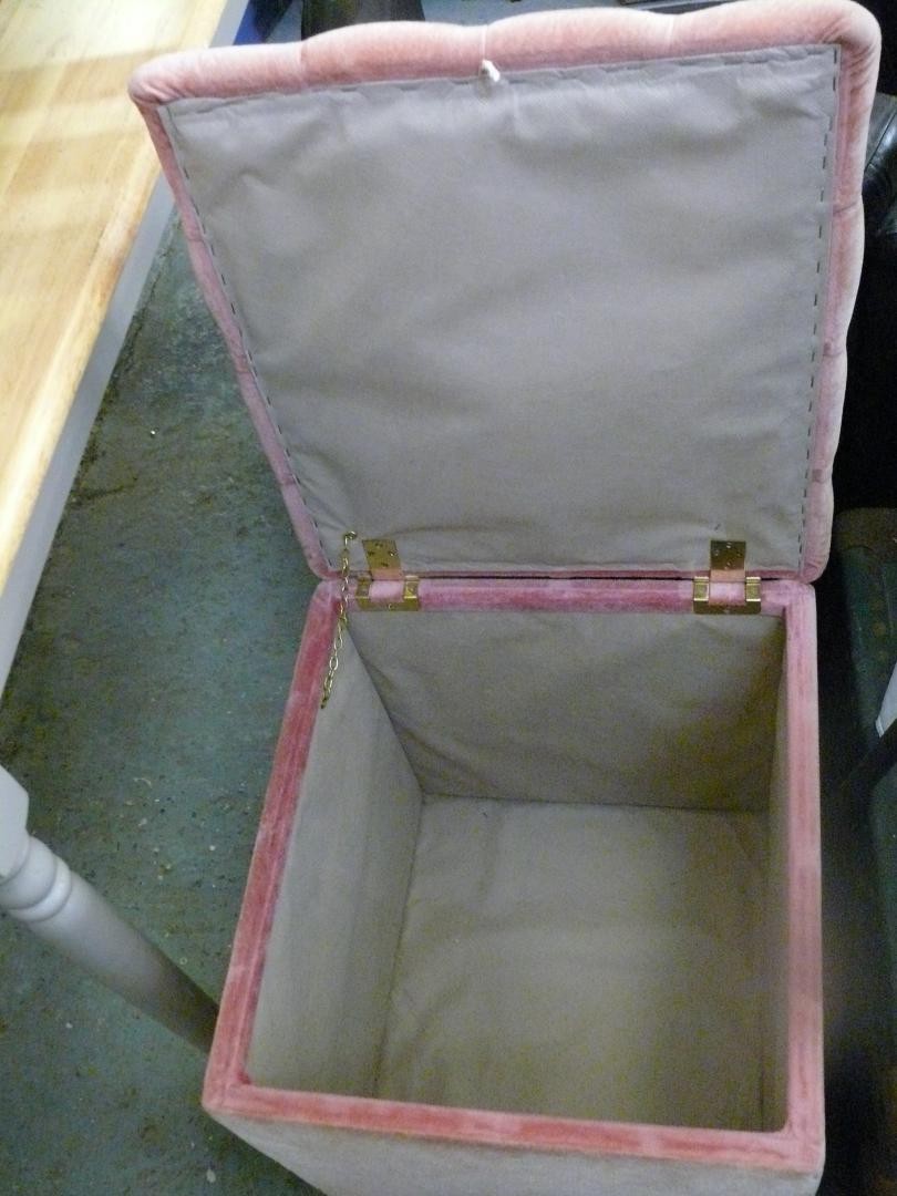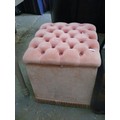 Small storage ottoman with padded top and lift up lid in salmon pink
