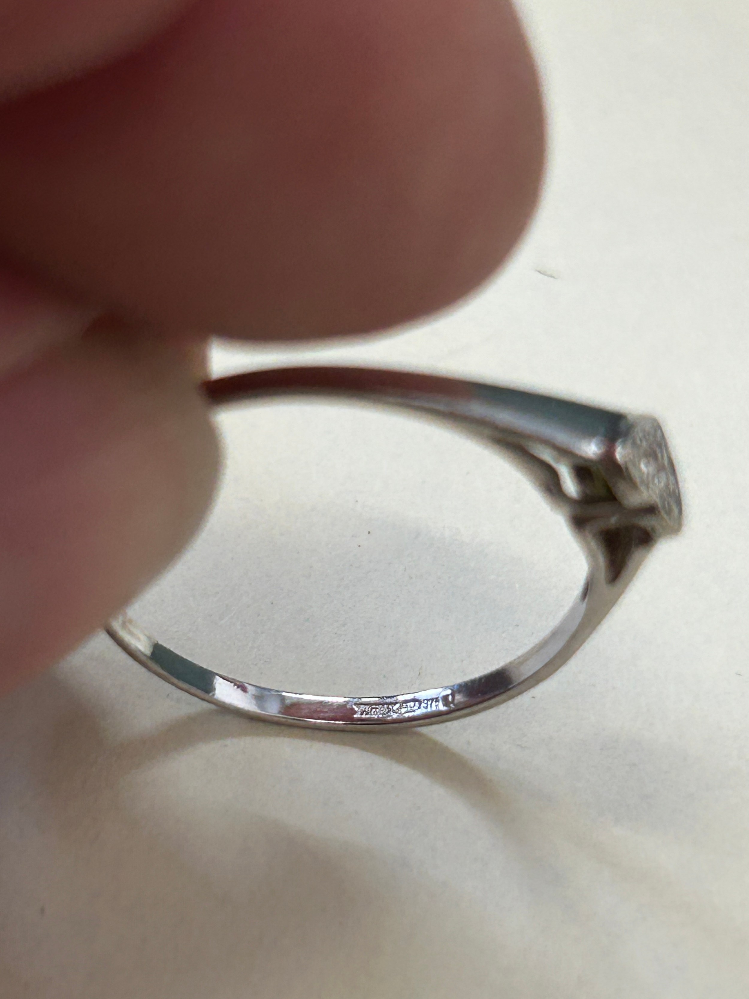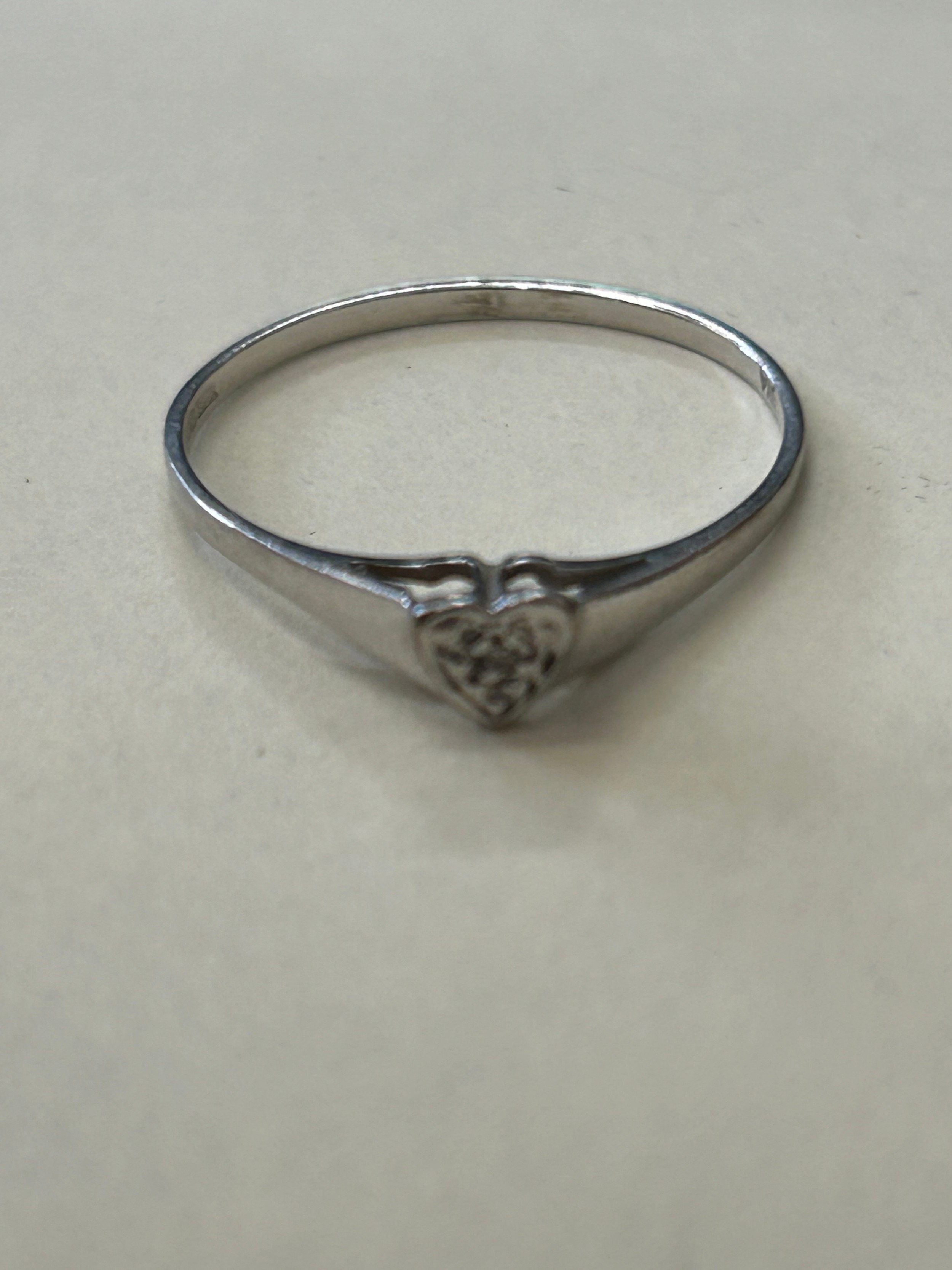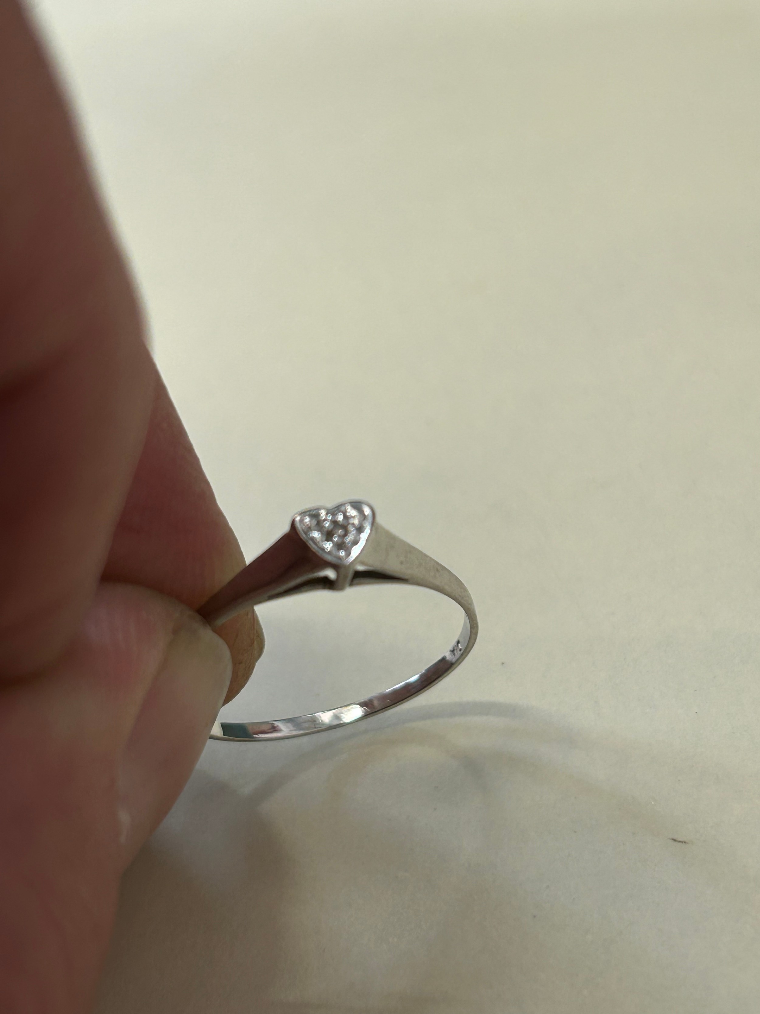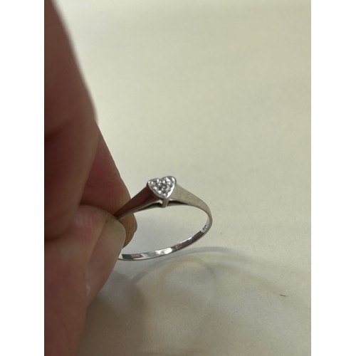 9CT WHITE GOLD RING WITH DIAMOND CHIP SET IN A HEART - SIZE P - 0.9 GRAMS