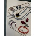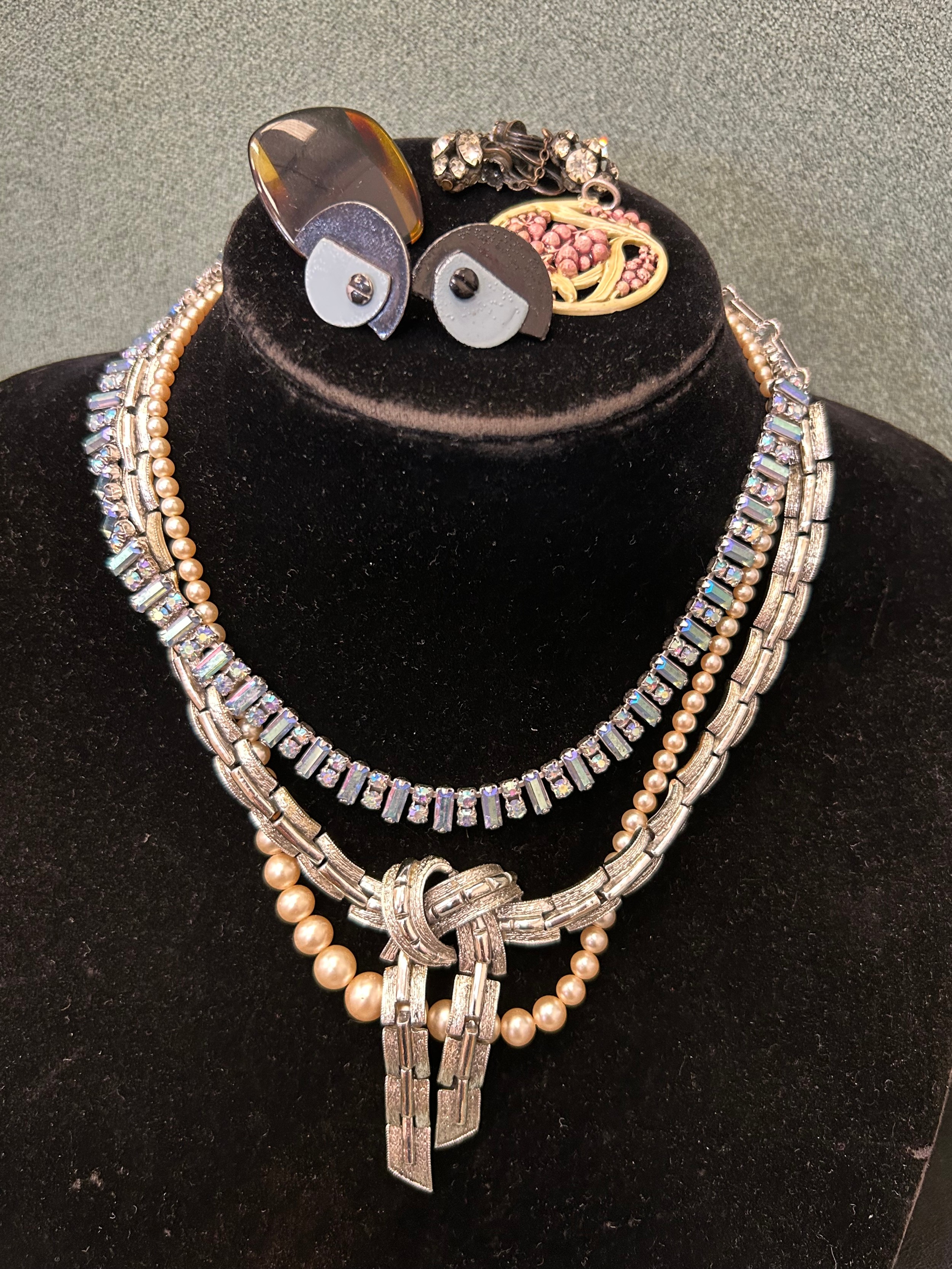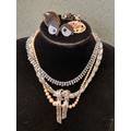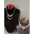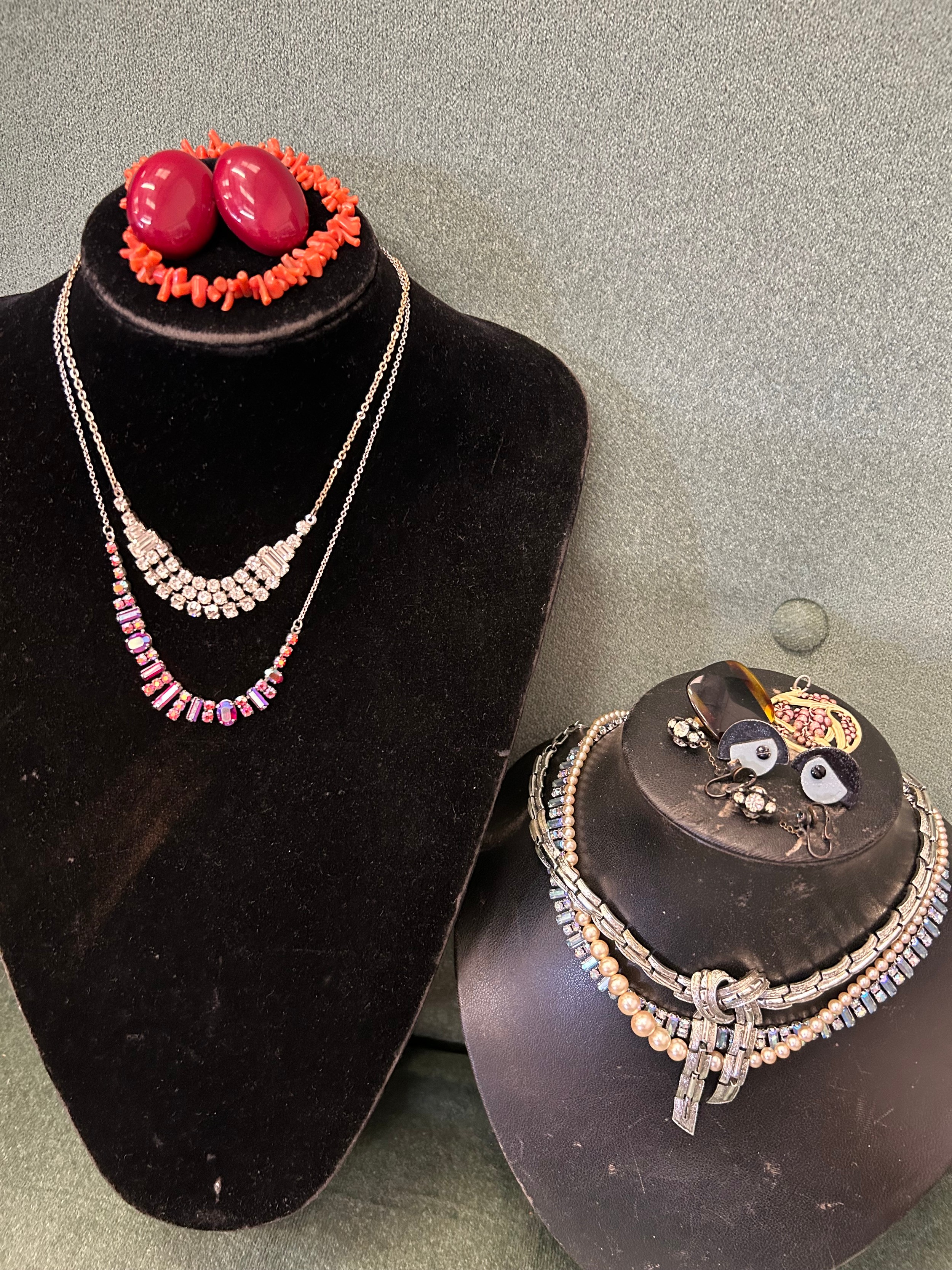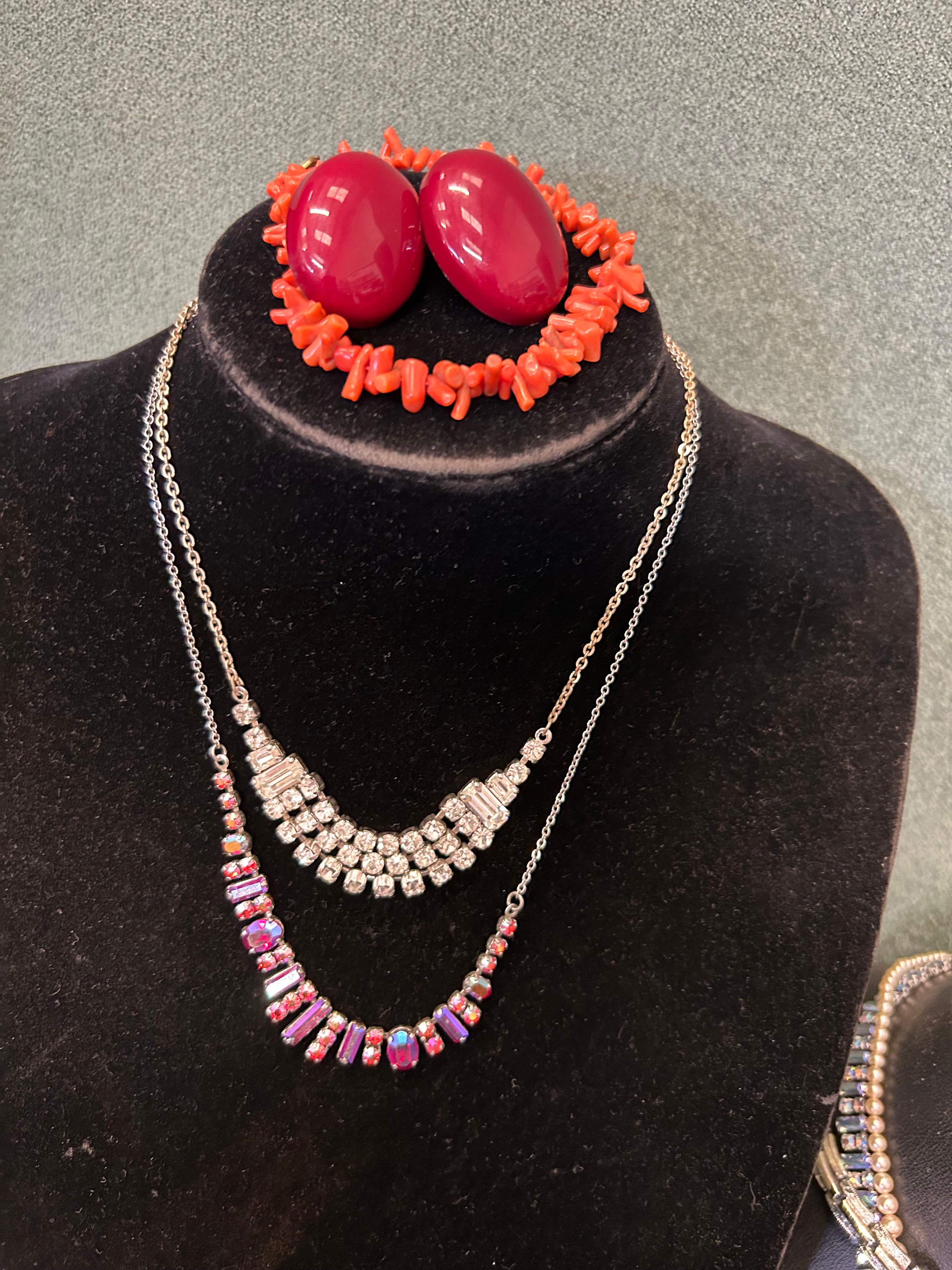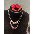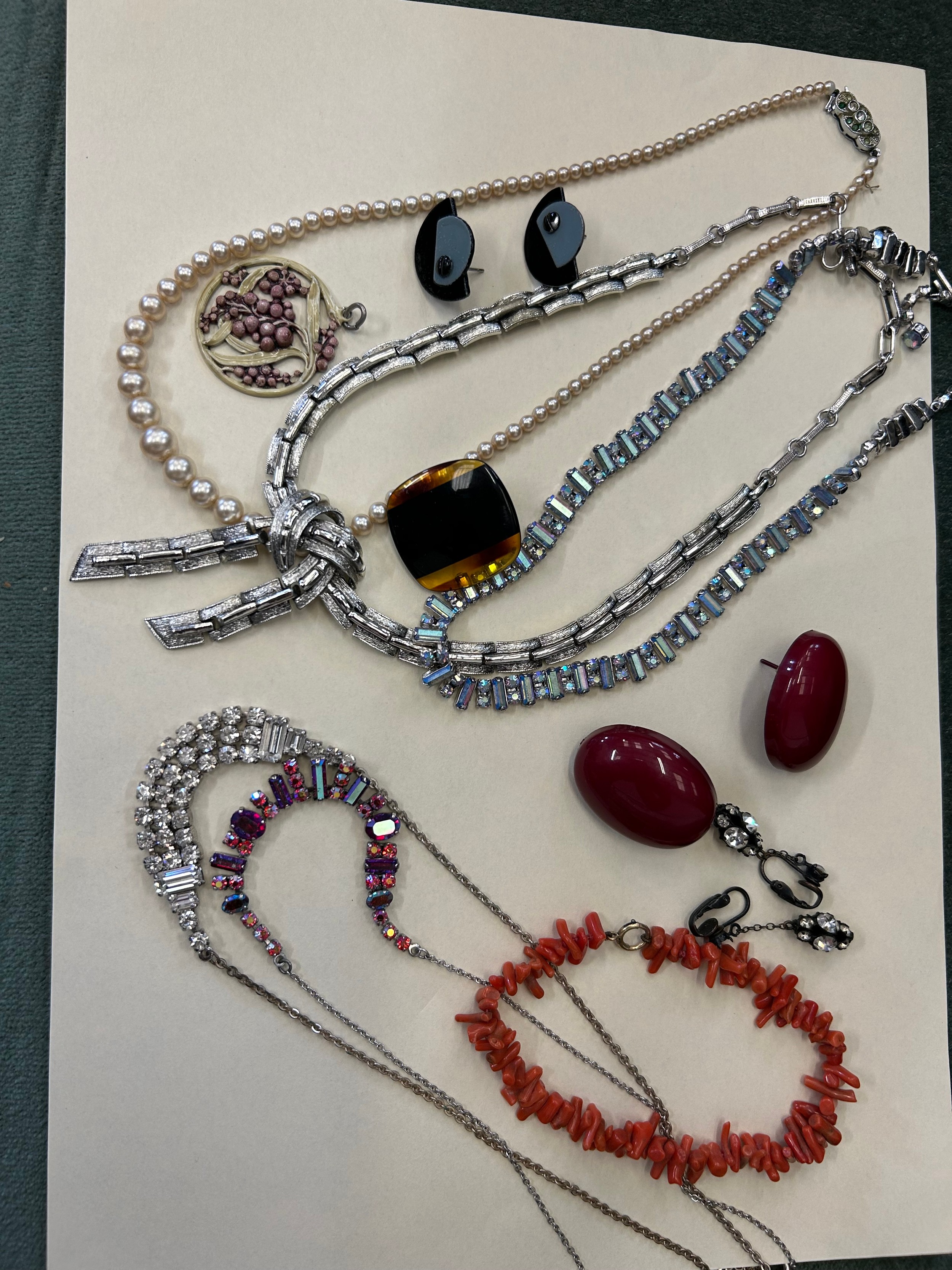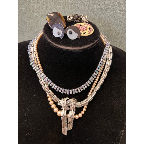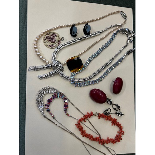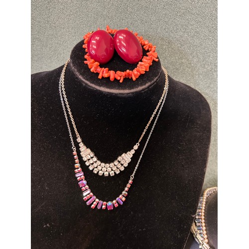 SELECTION OF VINTAGE COSTUME JEWELLERY - 1930'S TO 1960'S INCLUDING ART DECO EARRINGS, RED CORAL BRACELET, SIMULATED PEARLS, DIAMANTE ETC - STANDS NOT INCLUDED
