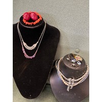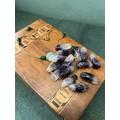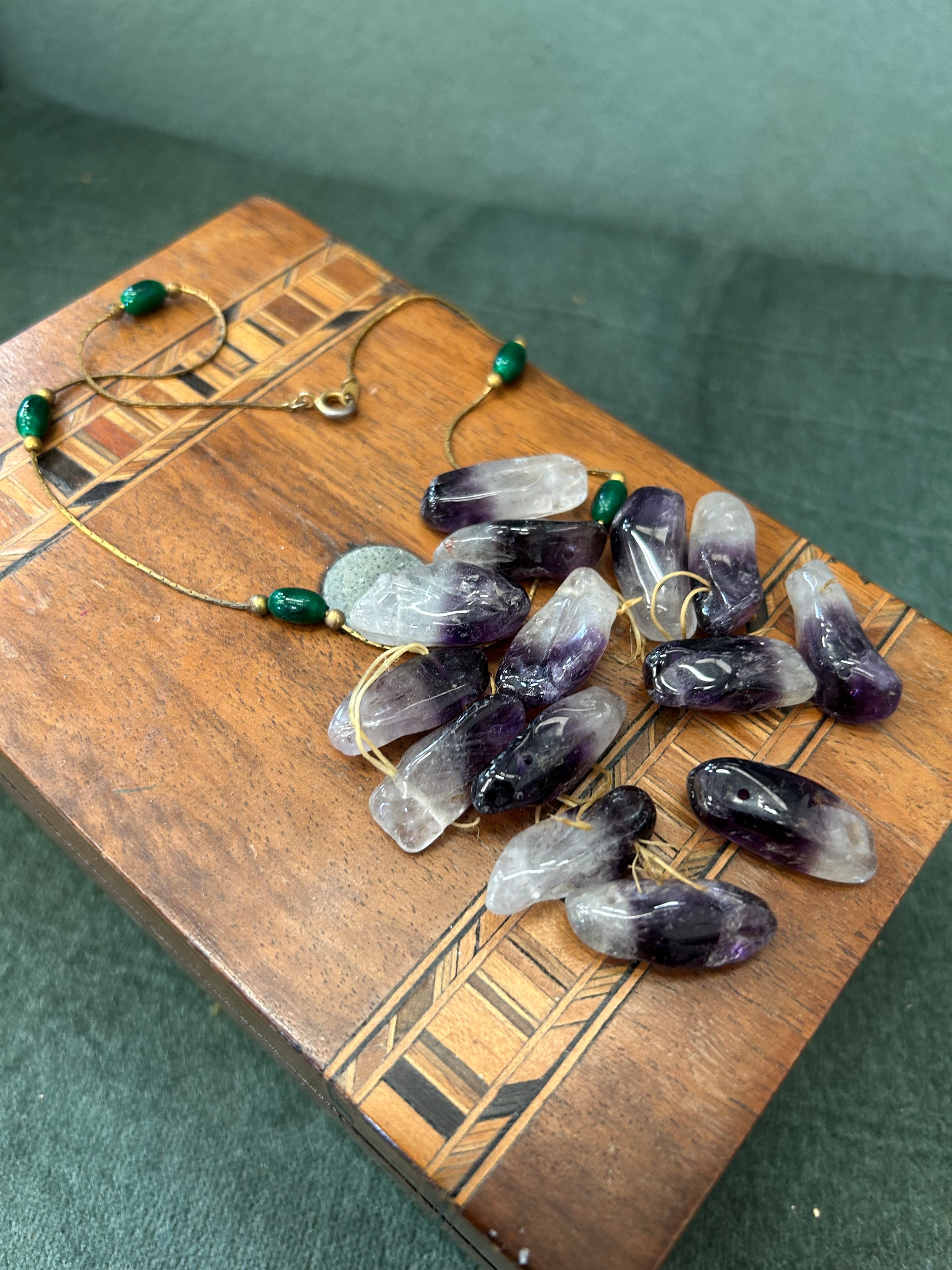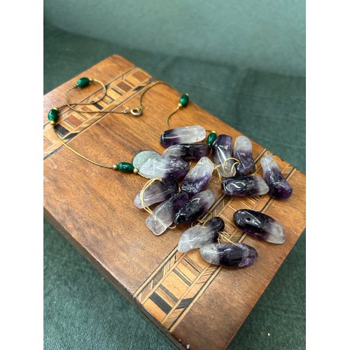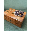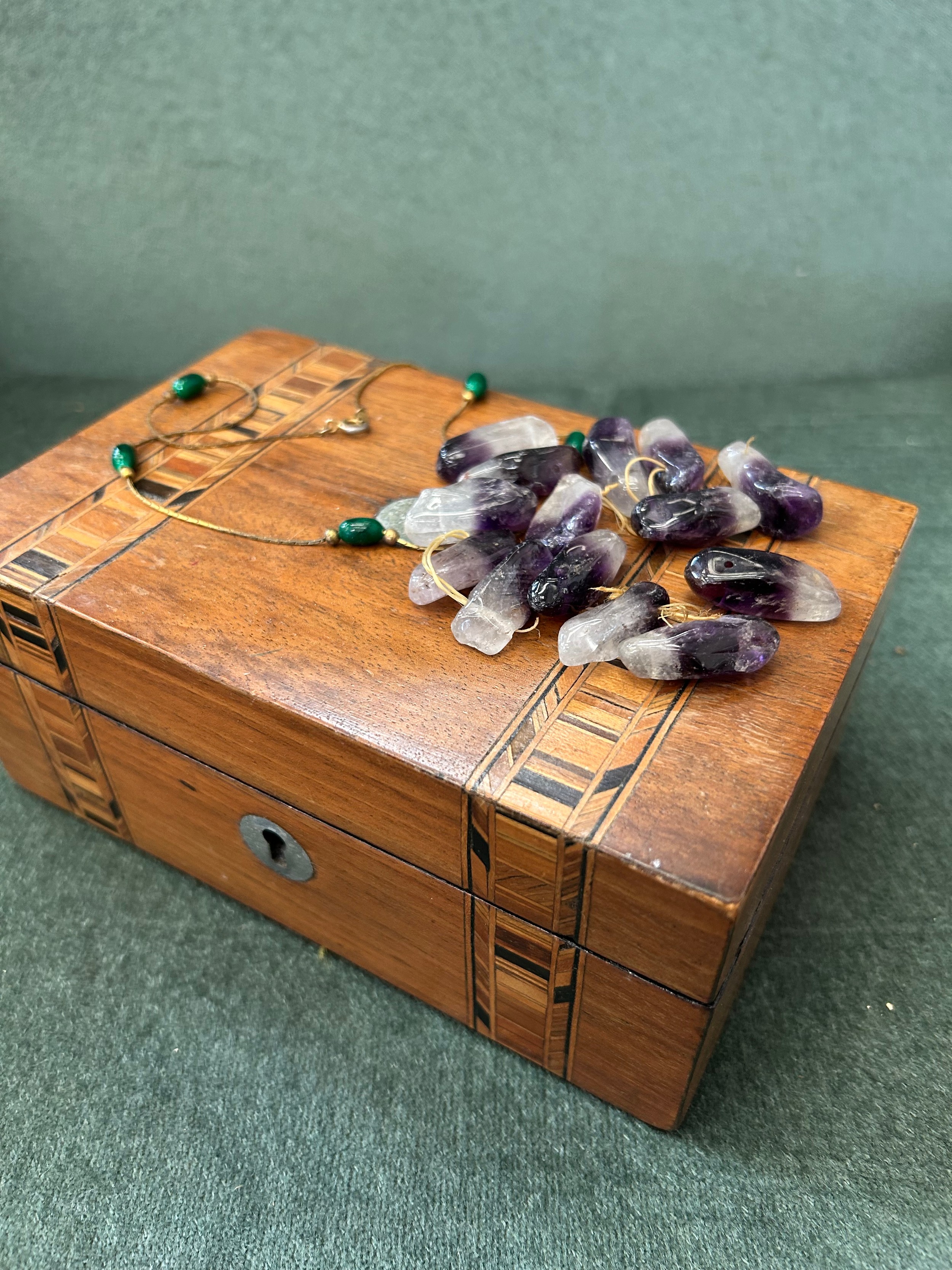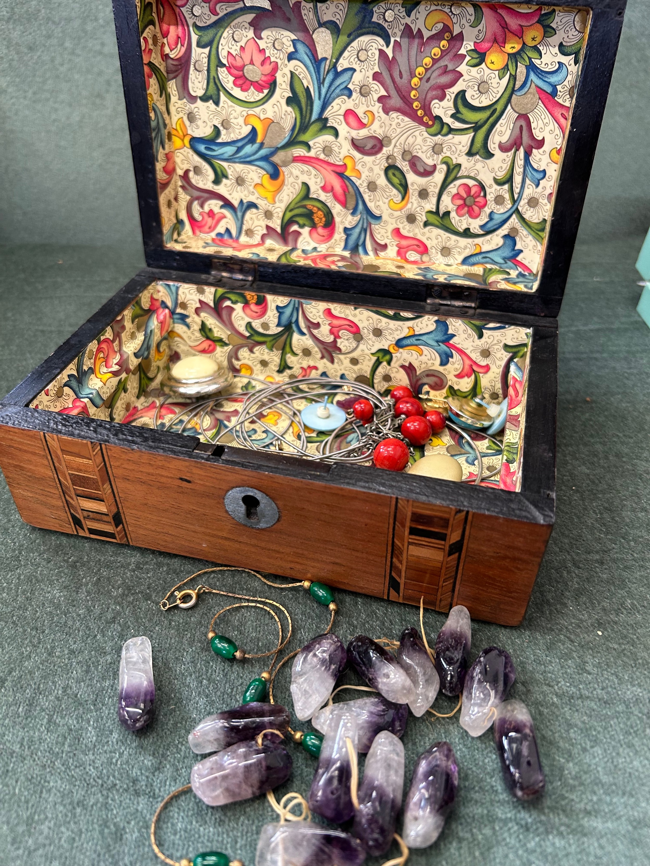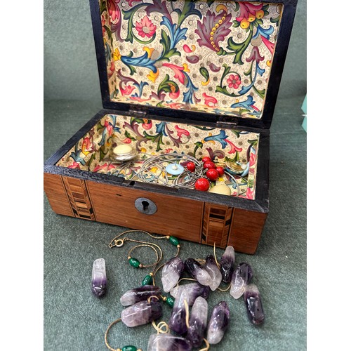VICTORIAN TUNBRIDGE WARE JEWELLERY BOX WITH VINTAGE COSTUME JEWELLERY INCLUDING NATURAL AMETHYST BEADS