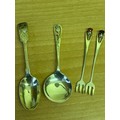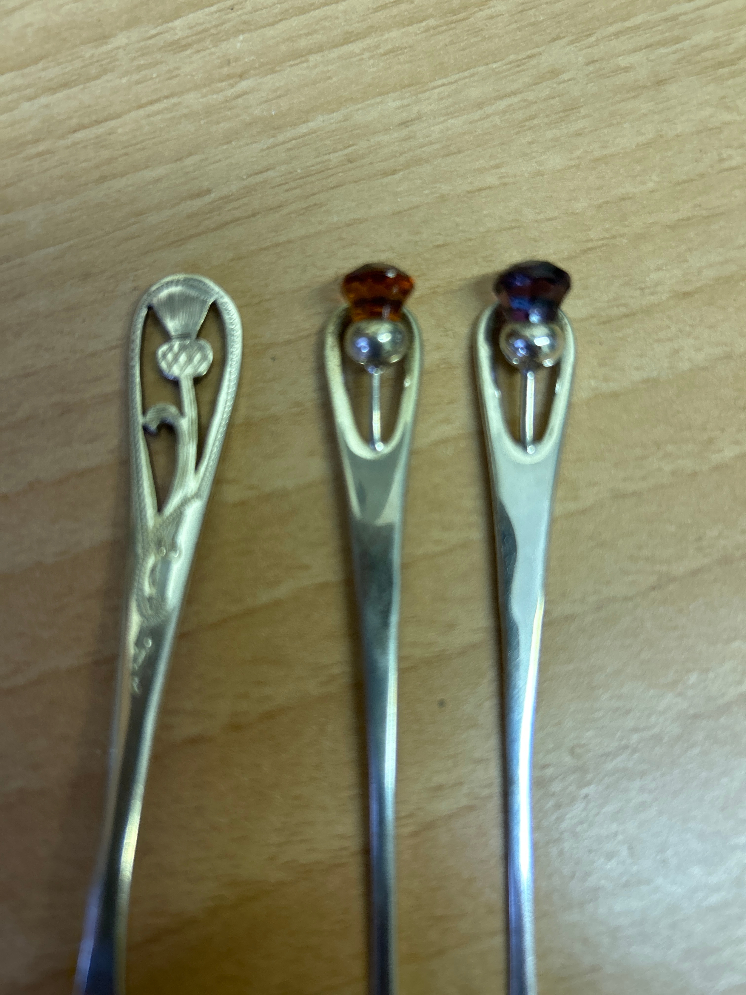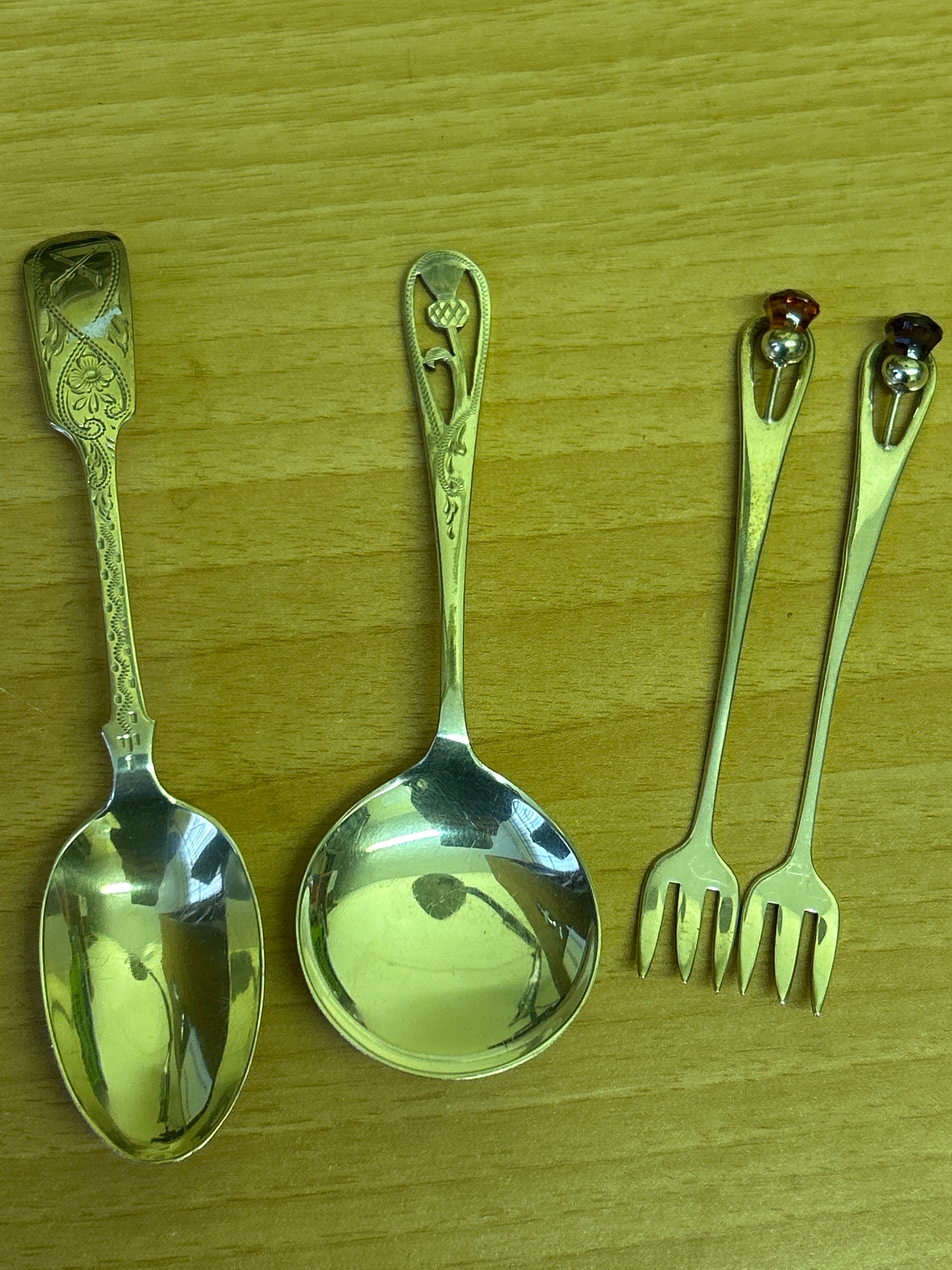 A Sterling silver tea spoon with rifle club insignia, hallmarked London 1932, 16 grams, together with a silver plated thistle jam spoon & pair of plated crudite forks with thistle finials