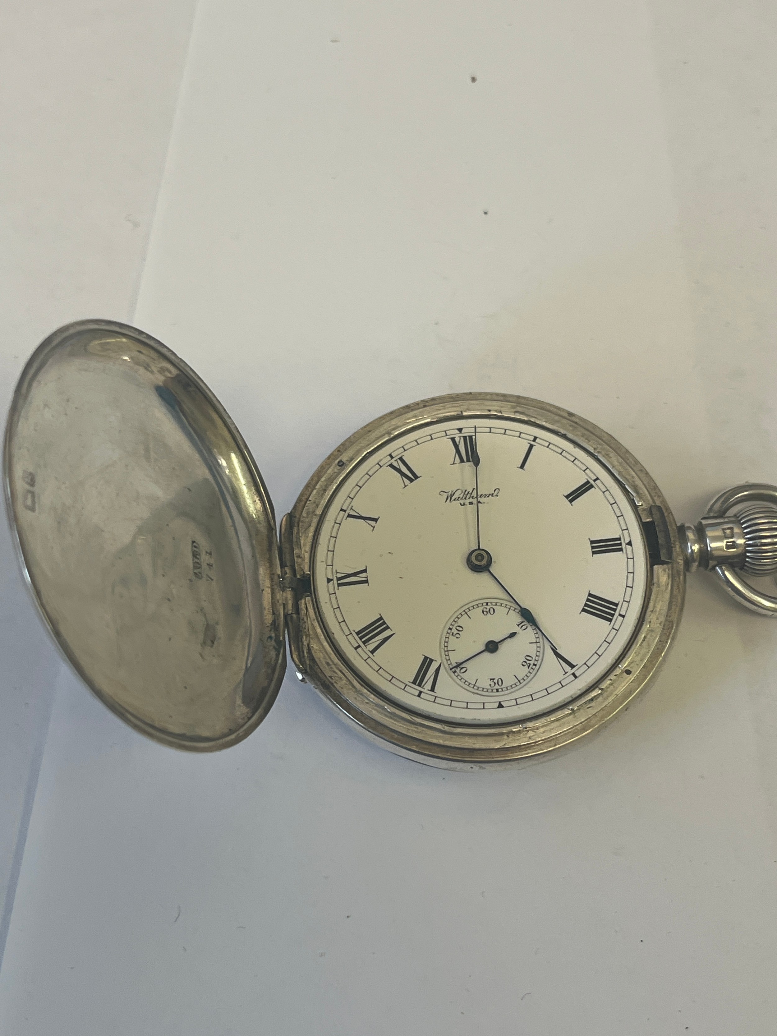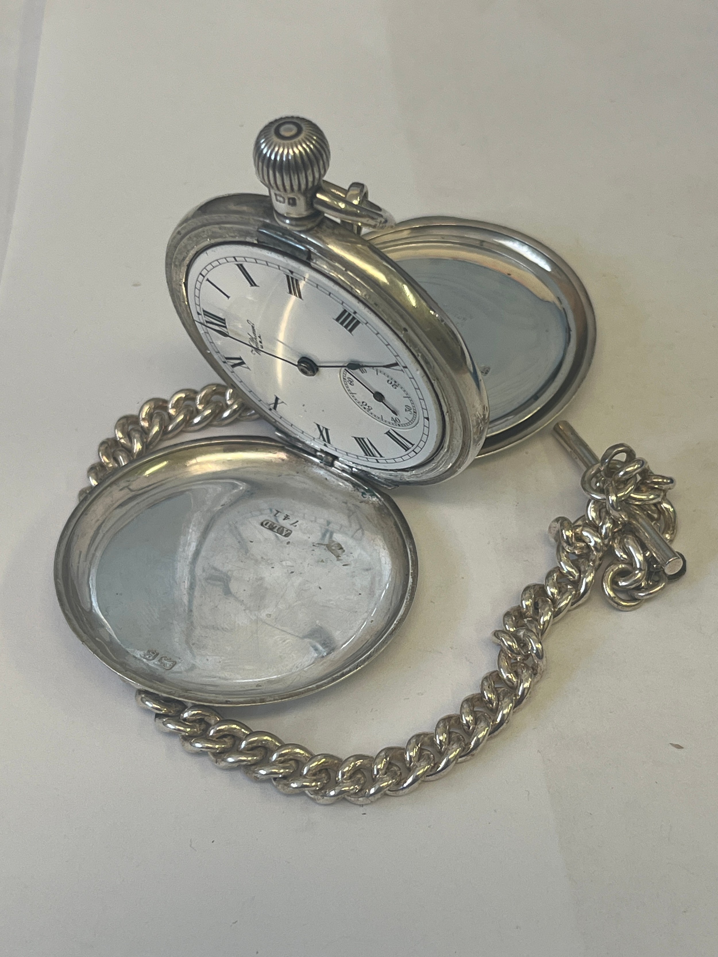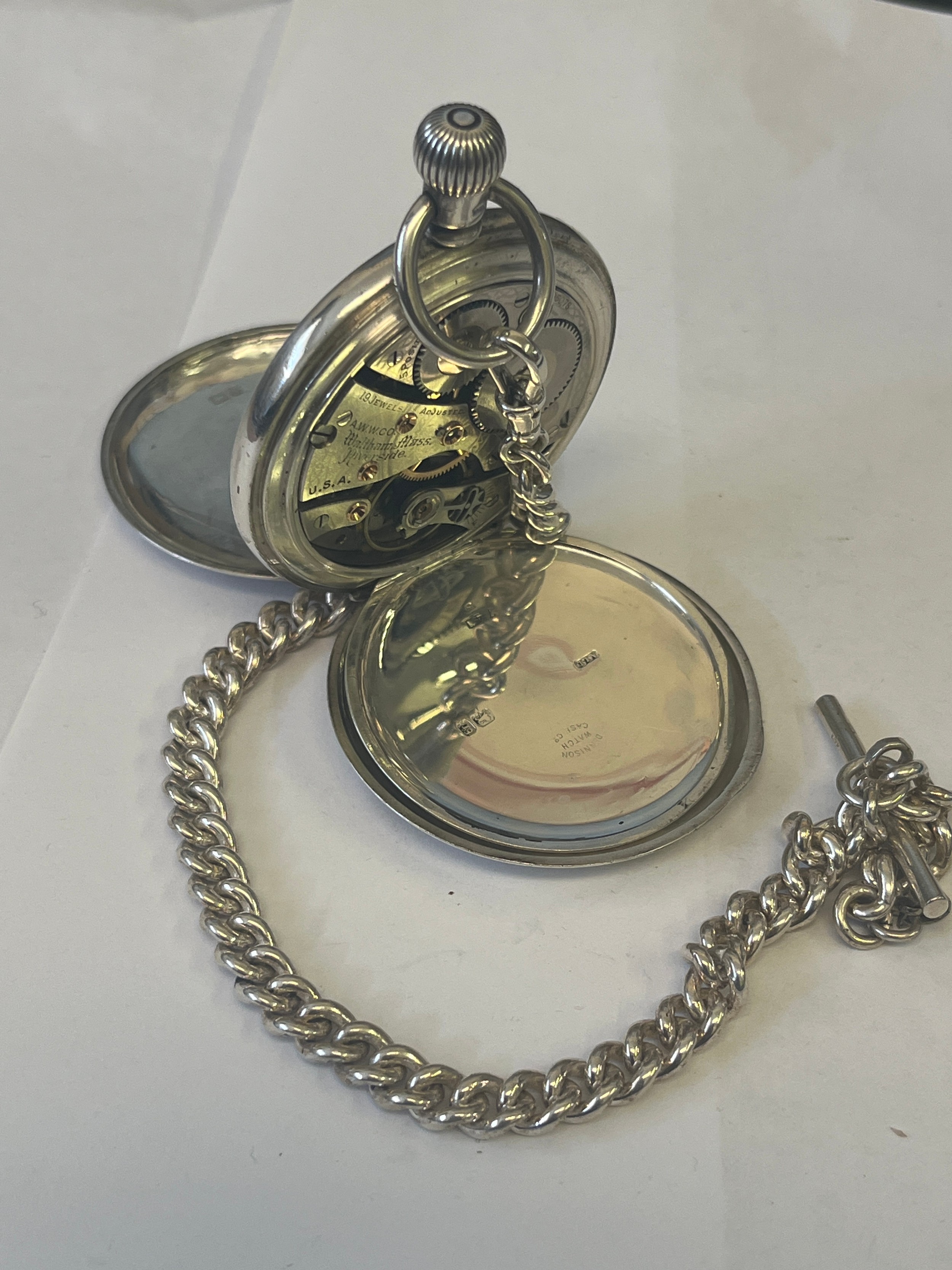 A SOLID SILVER POCKET WALTHAM USA WATCH AND ALBERT 19 JEWELS FULLY WORKING AND CLEAN HUNTER DATE HALLMARK 1906 WEIGHT 142GR