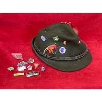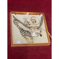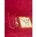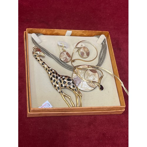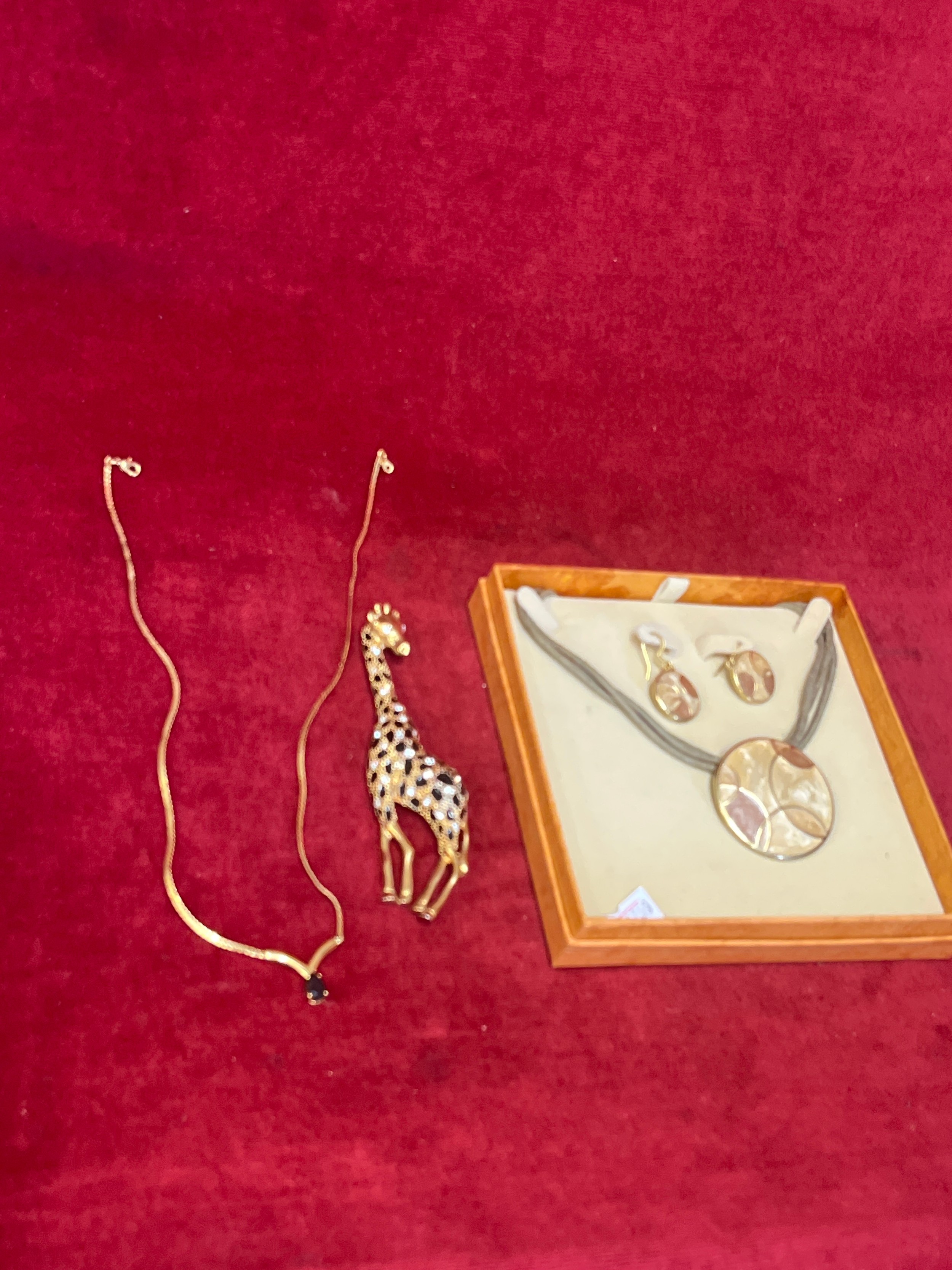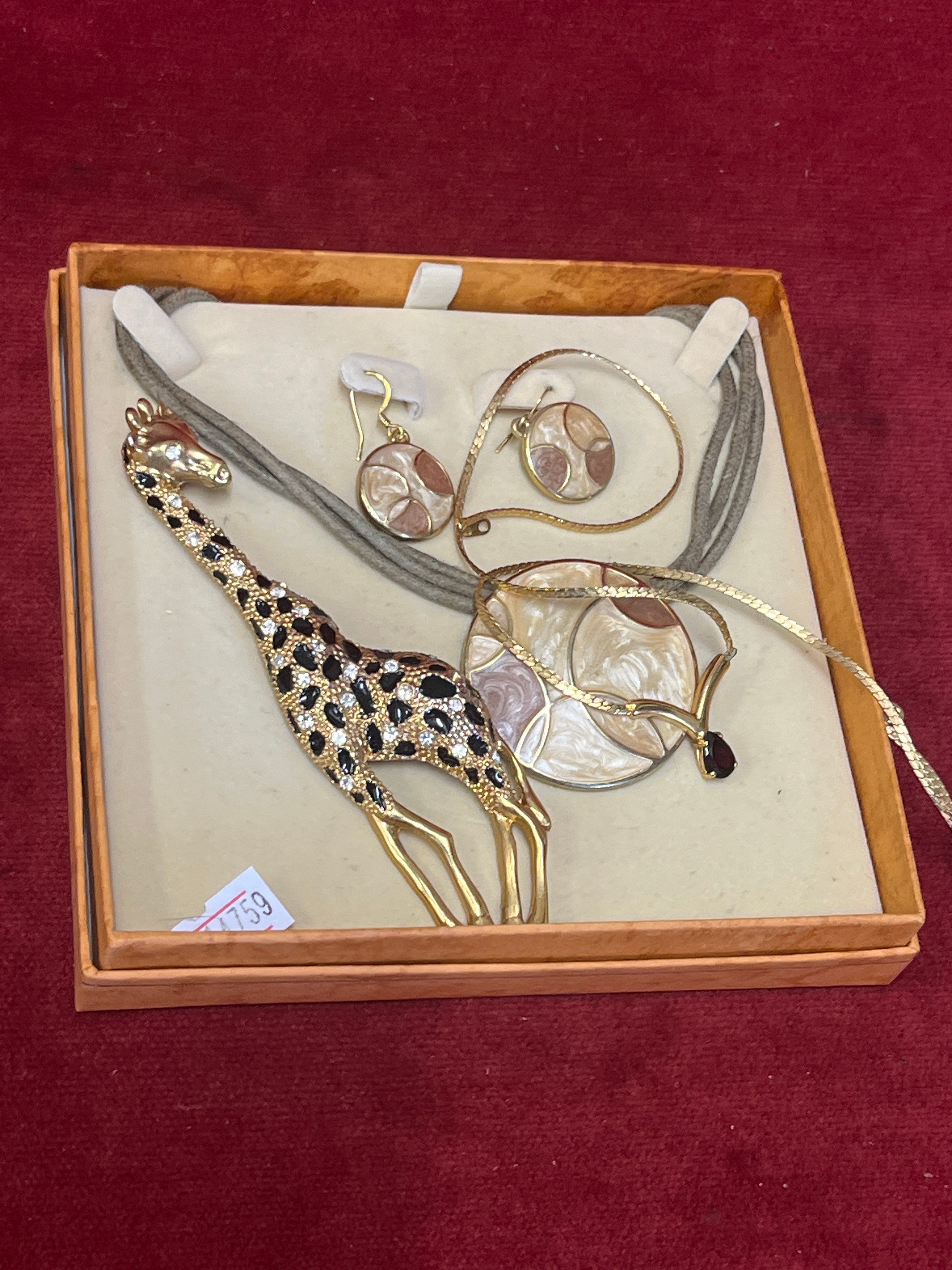 BOX OF GOLD COLOURED JEWELLERY WITH A LOVELY GIRAFFE BROOCH, NECKLACE WITH RED STONE AND A NECKLACE AND EARRING SET