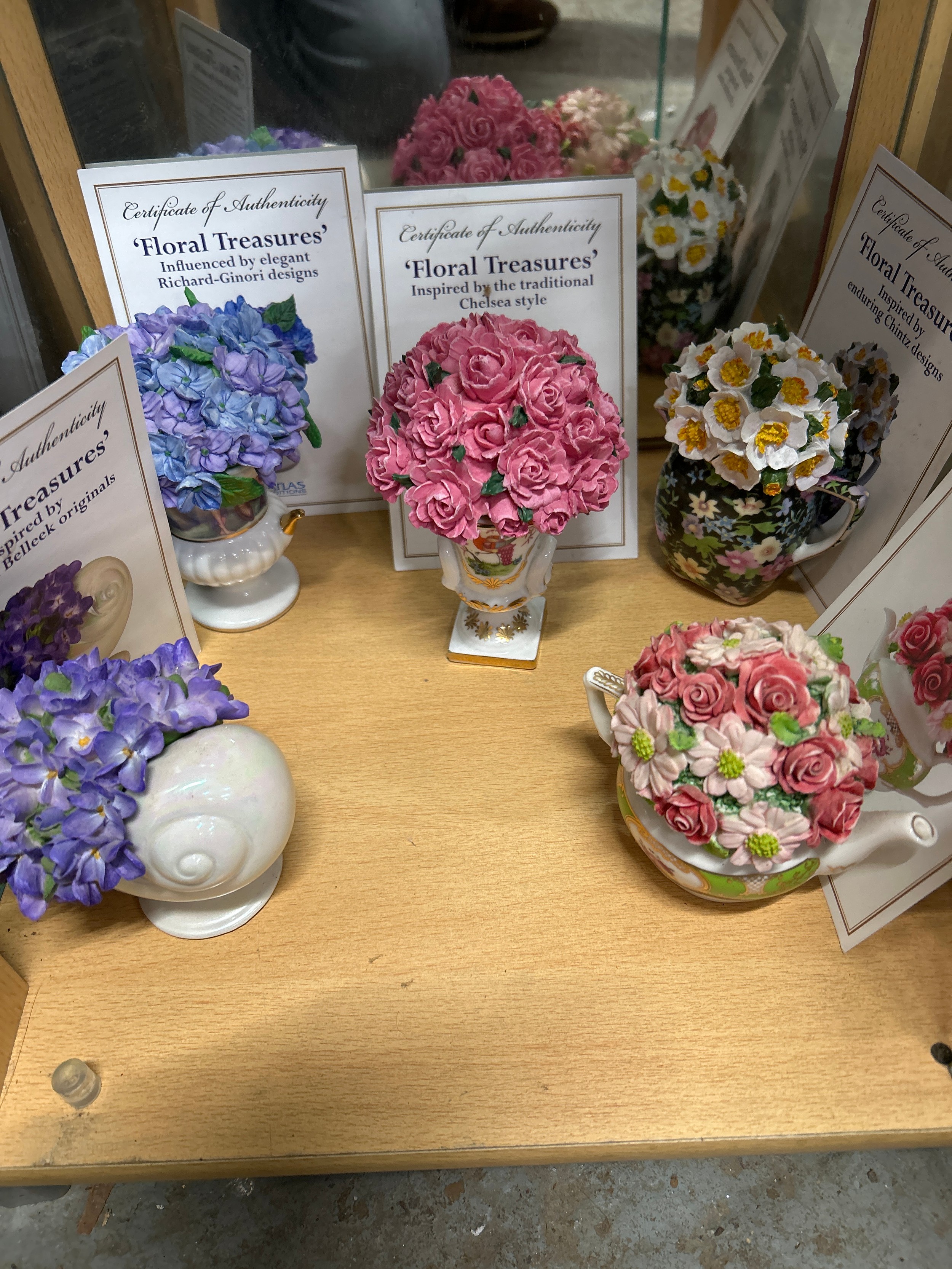 Five collectors ceramic flower ornaments “Floral Treasures” by Atlas Editions all with certificates of authenticity