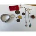 2 SILVER PENDANTS ON CHAINS 1 WITH PEARL THE OTHER INDIAN (USA) WITH TURQUOISE PLUS A COPY G/PLATED SOVEREIGN A VINTAGE WATCH, SILVER EARRINGS