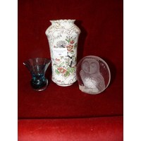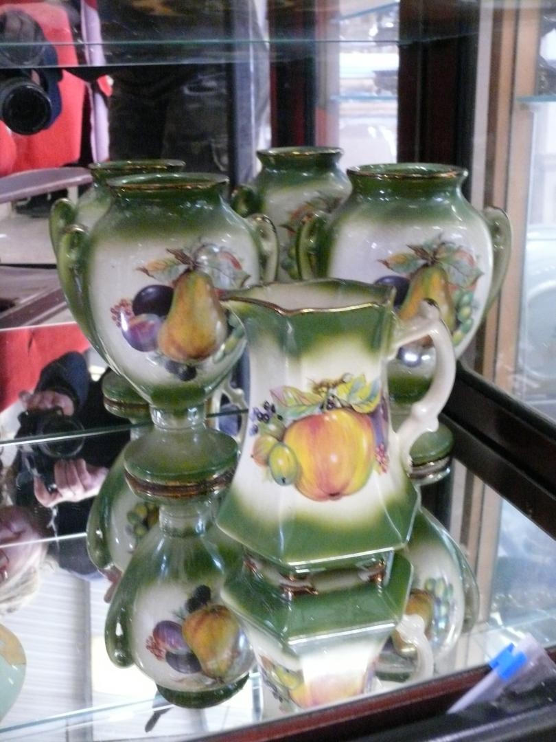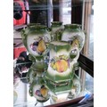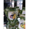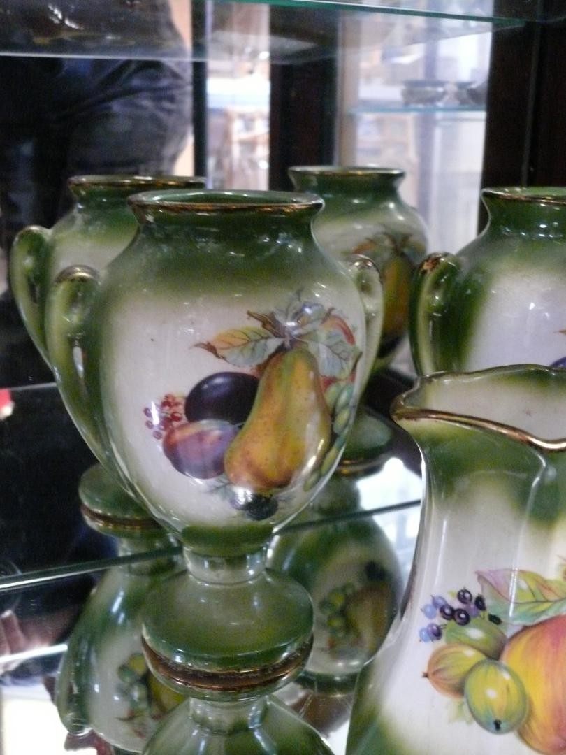 THREE PIECES OF MAYFAYRE STAFFORDSHIRE POTTERY, INCLUDING A PITCHER AND TWO URN SHAPED VASES, ALL DECORATED IN A GREEN AND POLYCHROME FRUIT PATTERN.