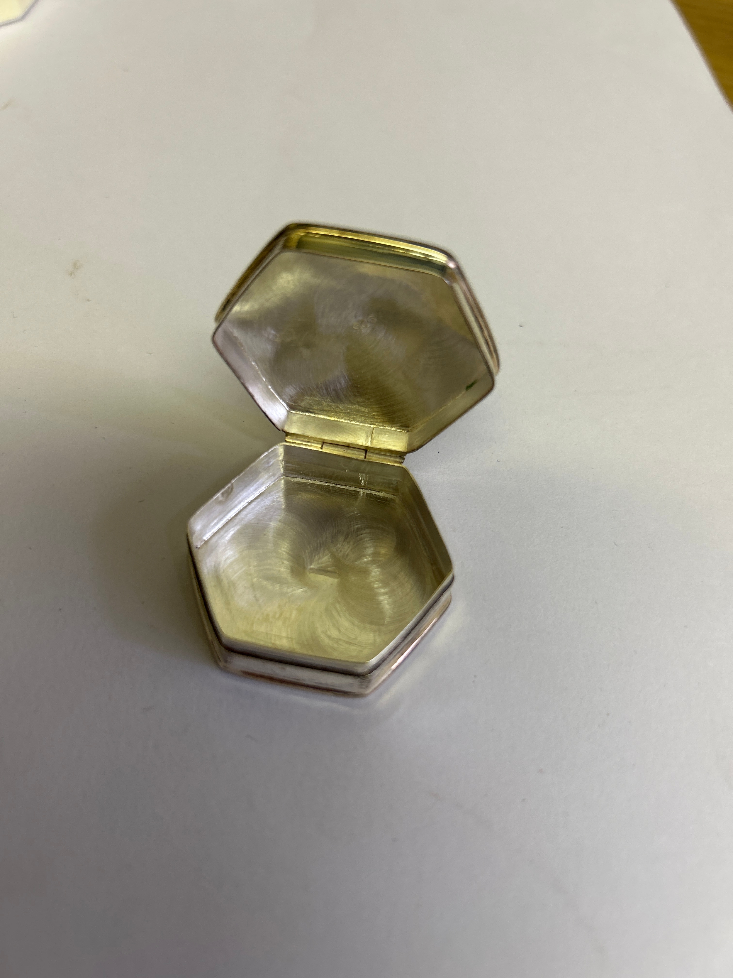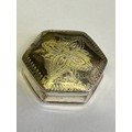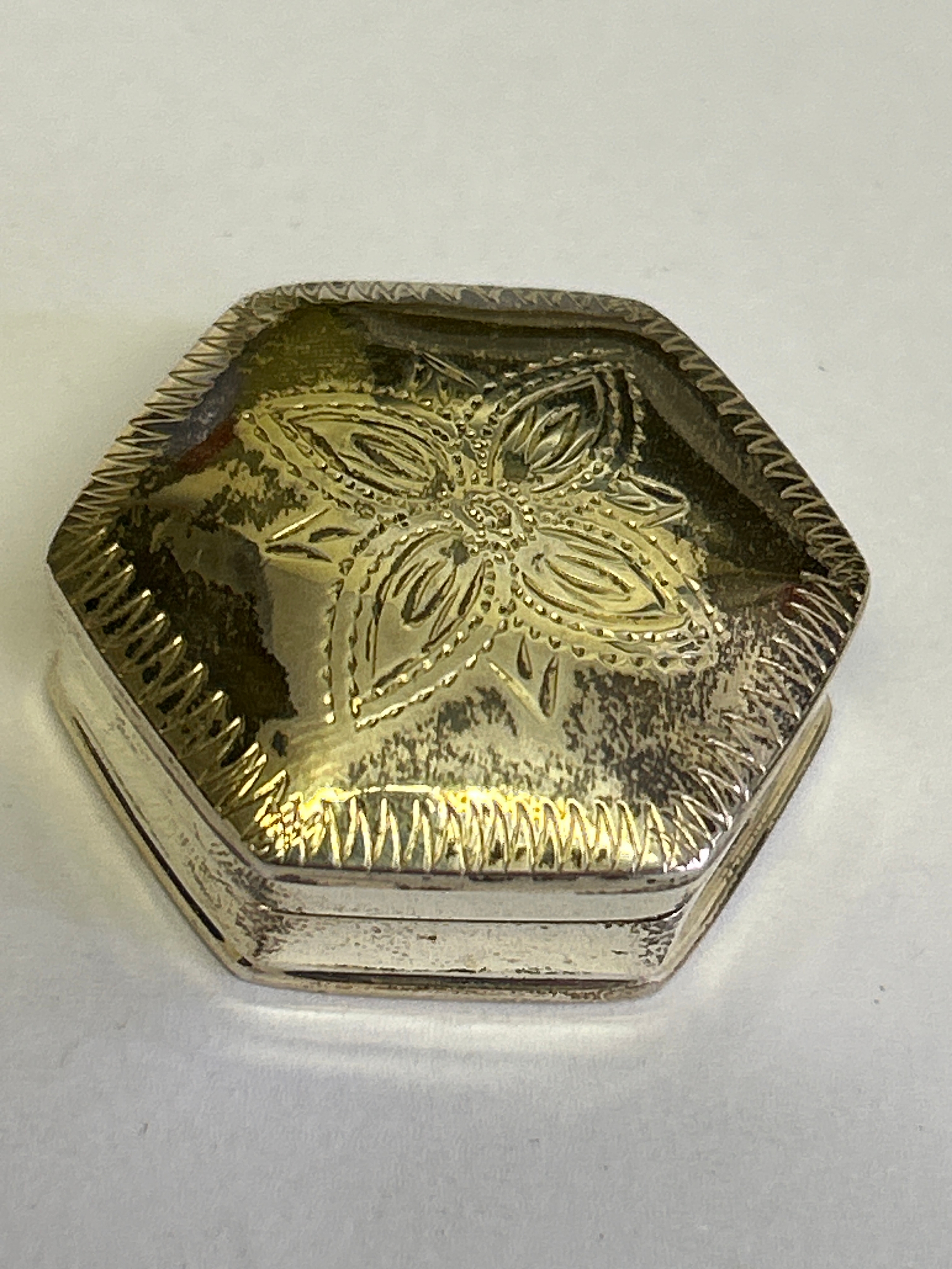 A Sterling silver hexagonal pill box engraved with a star pattern to the lid. Hallmarked 935, import mark & letter U (London 1994), maker CLE. 11 grams