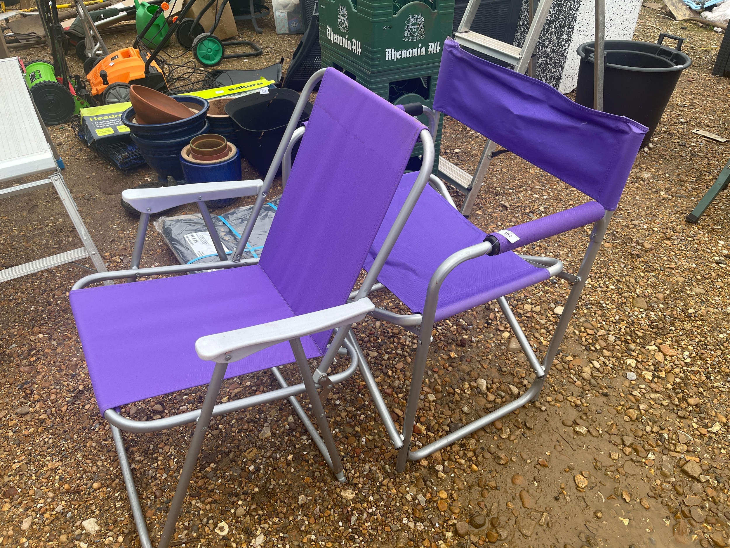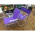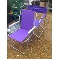 2 Purple collapsible chairs, one is a directors chair