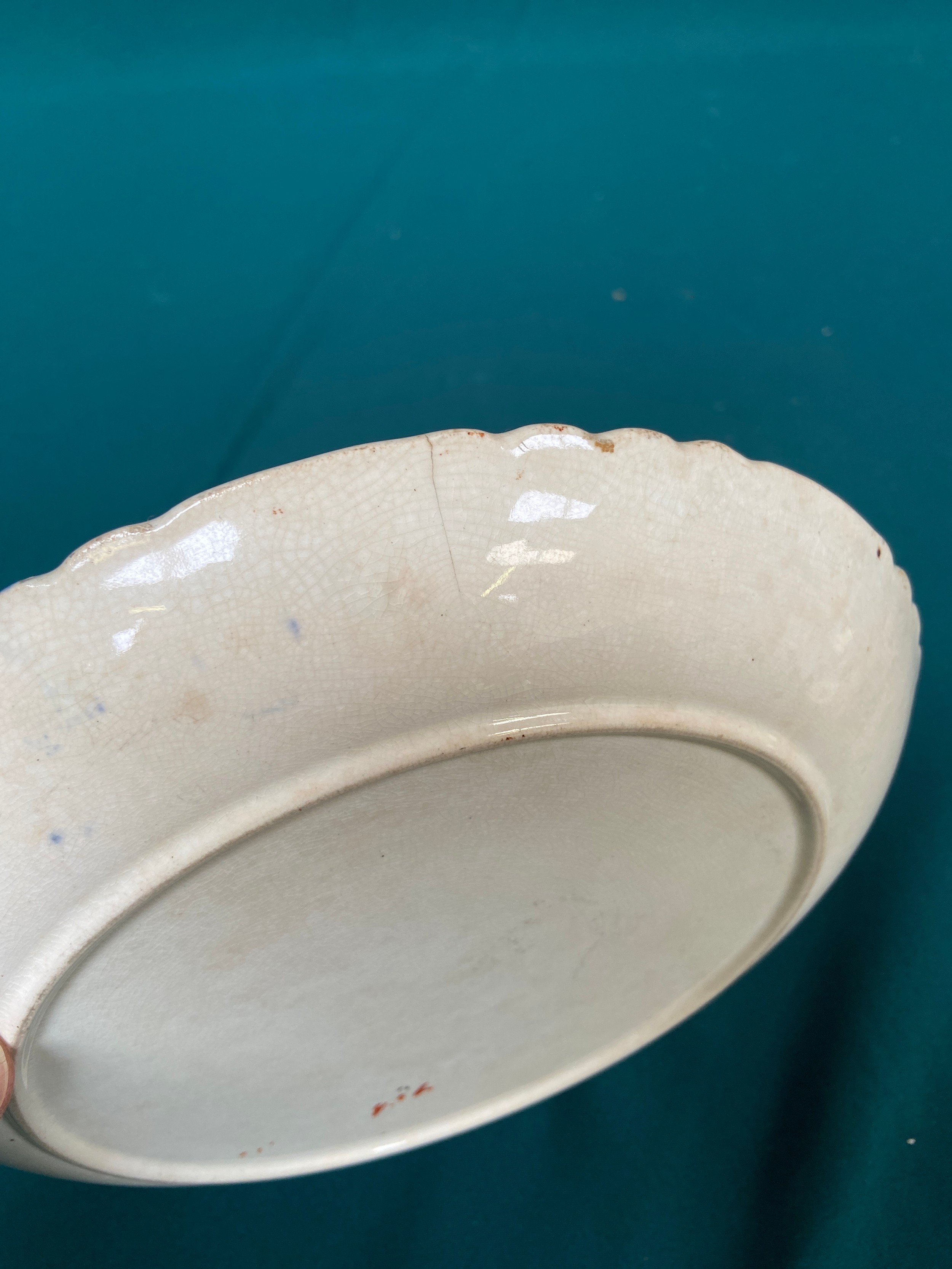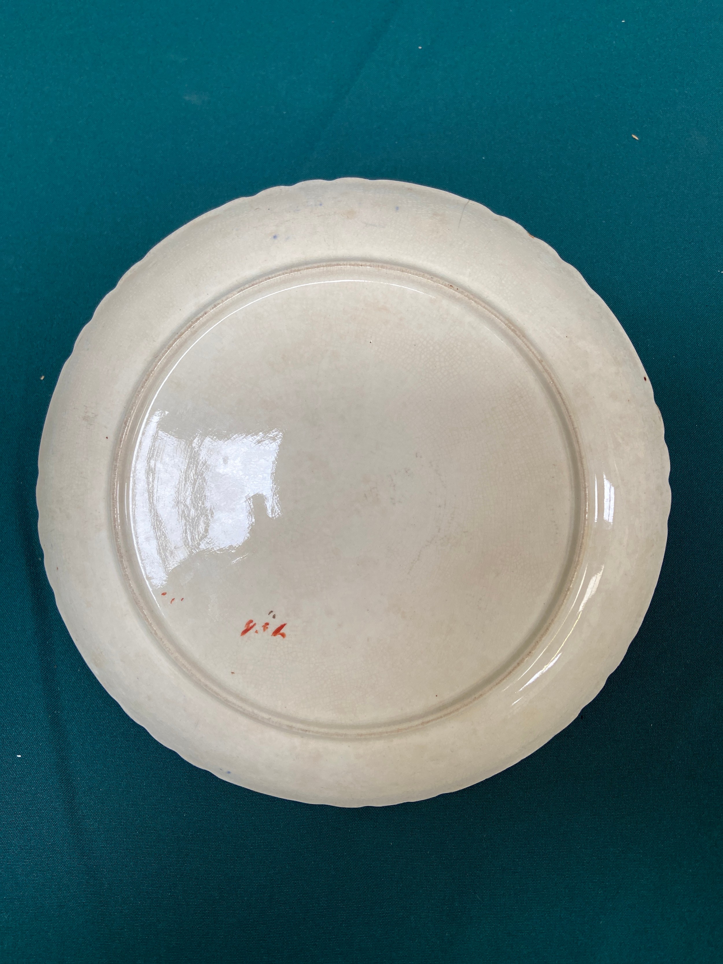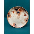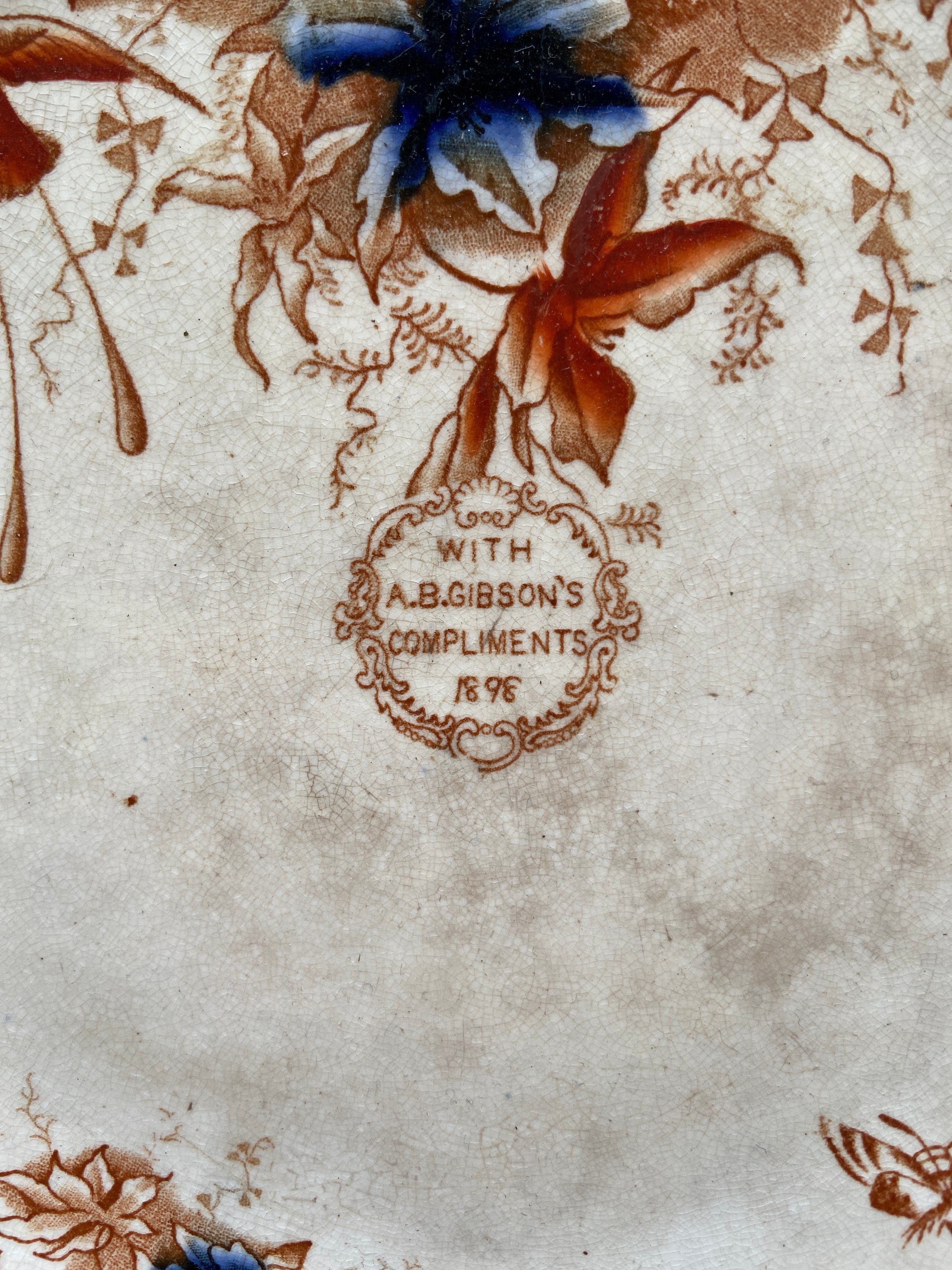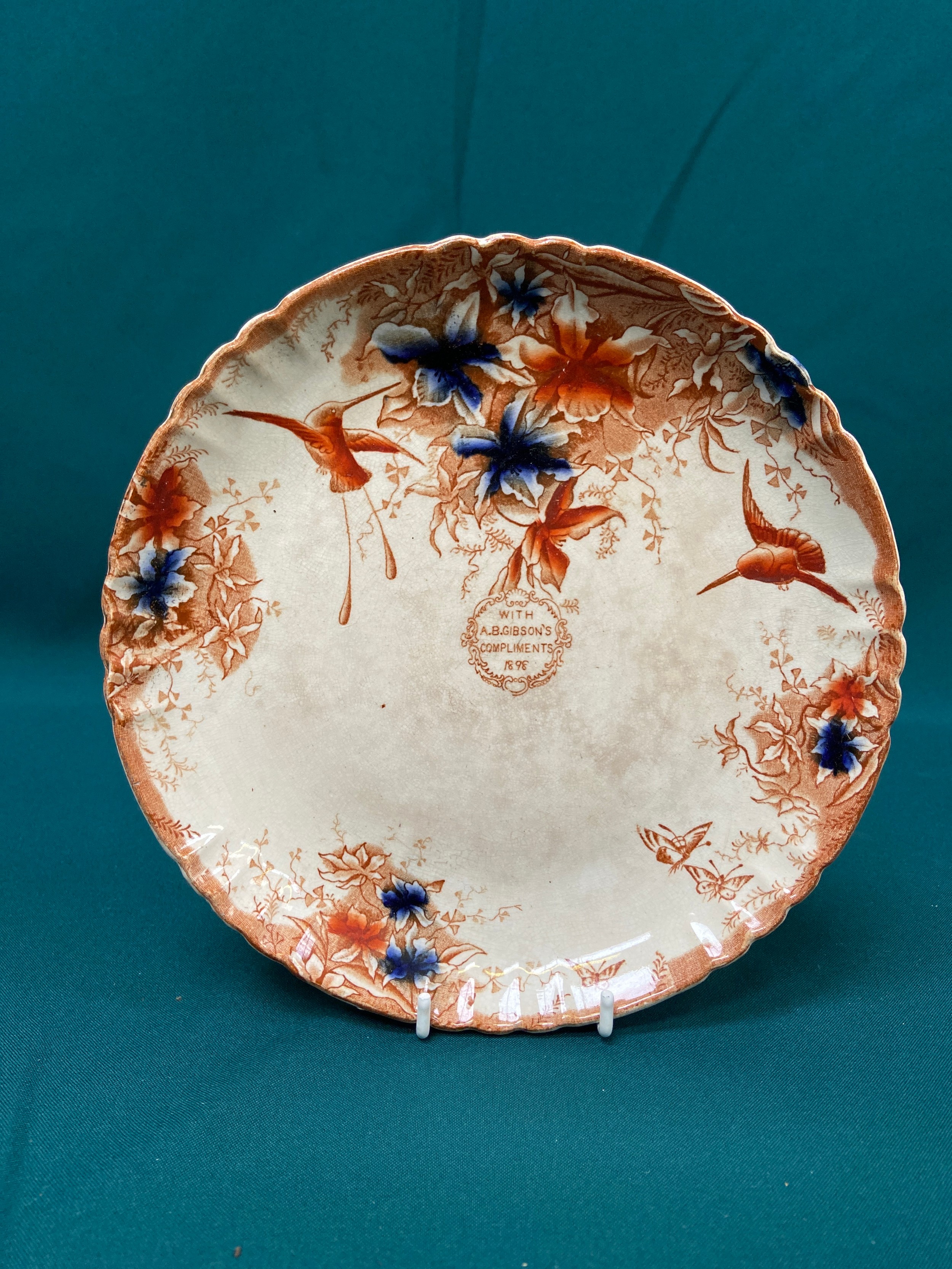 Victorian G.T. Mountford cabinet plate in the Stoke Orchid pattern, with a rare central sepia transfer roundel advertising - 'With A.B. Gibson's Compliments 1898'. Likely produced for a Butchers or Grocers. Some staining and small hairline on rim, but not noticeable from facing side.