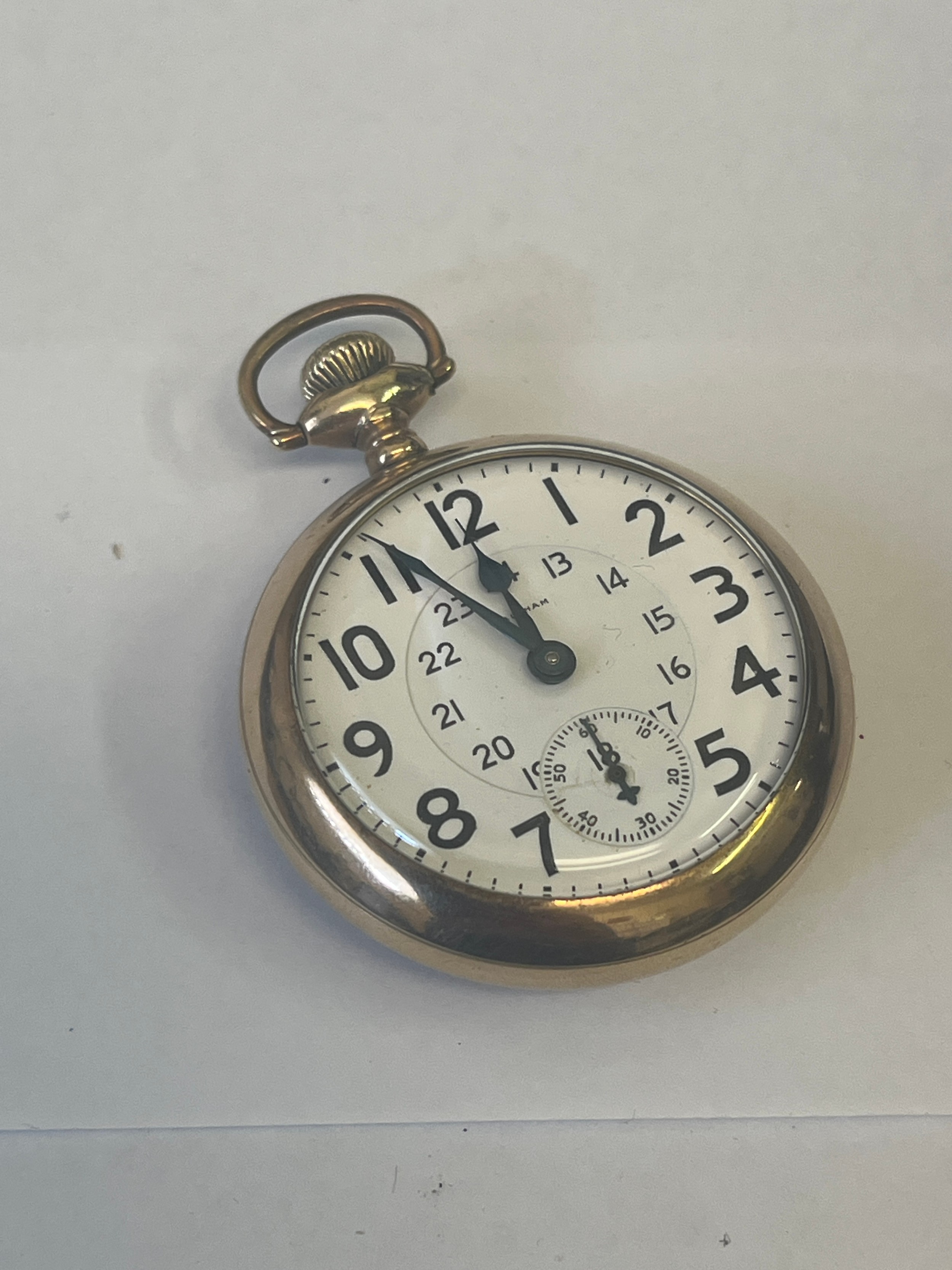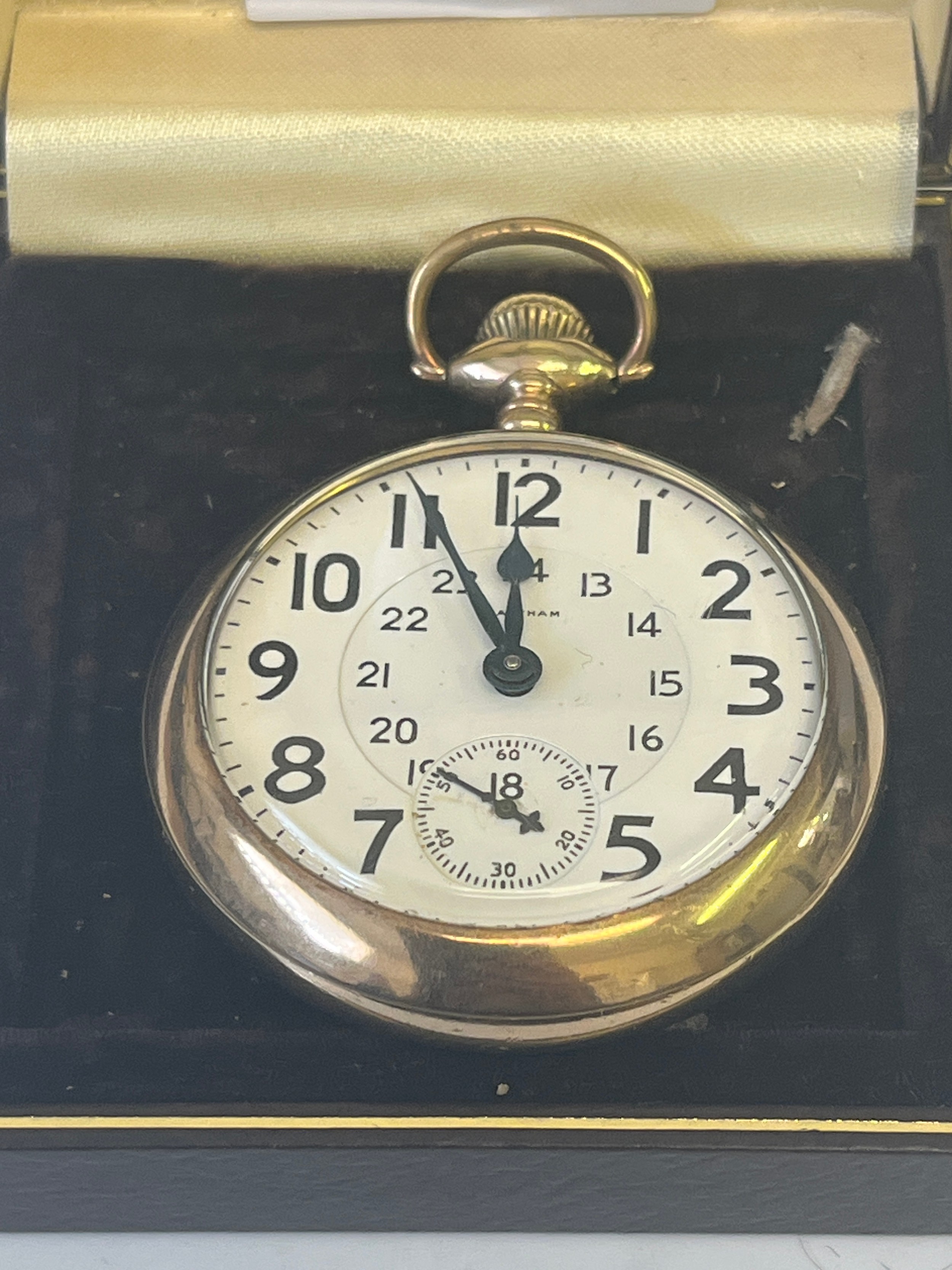 A POCKET WATCH / FOB GOLD FILLED 21 JEWELS FULLY WORKING CASE MADE CANADA VERY CLEAN INSIDE. WITH 24 HOUR DIAL