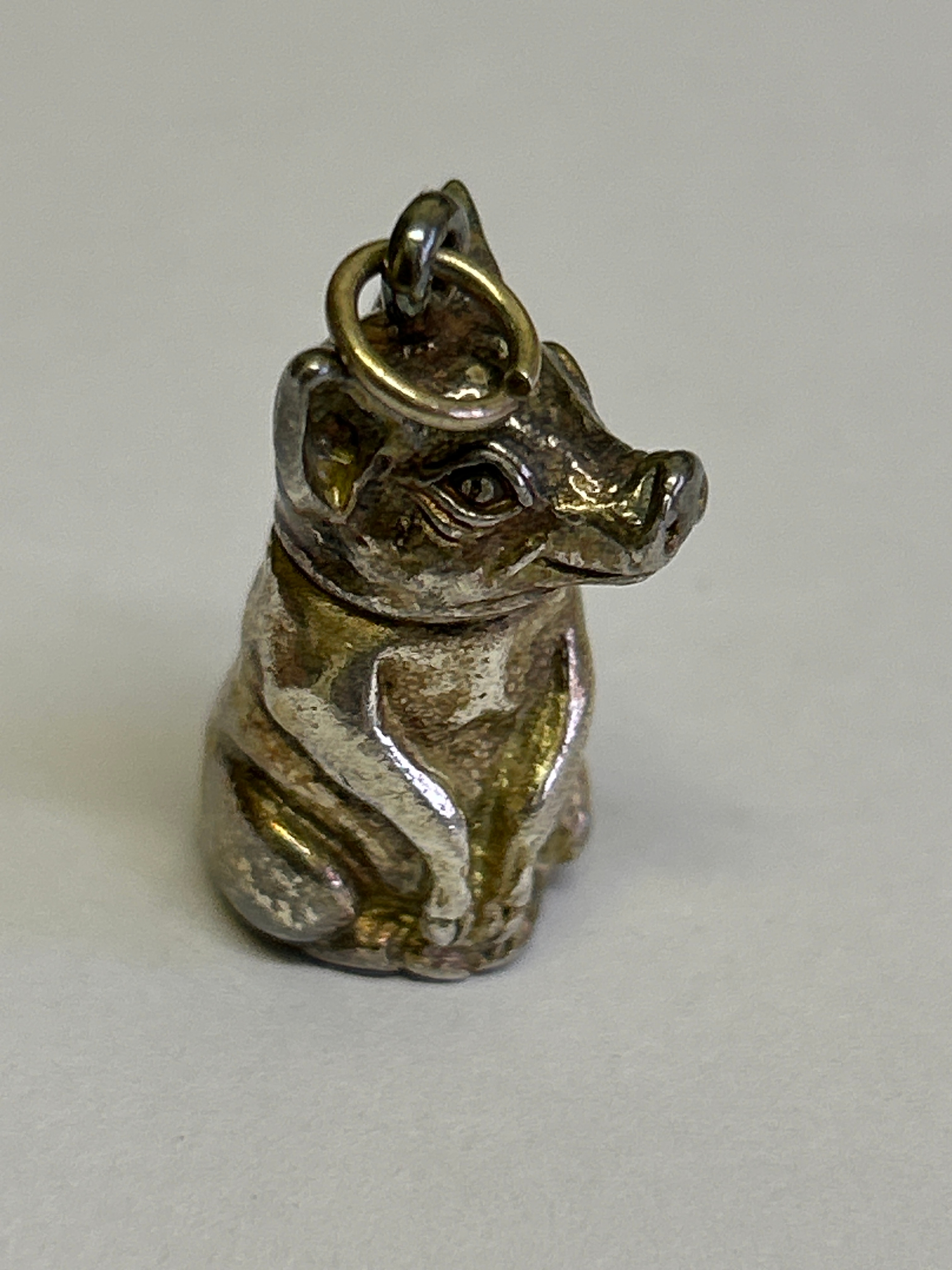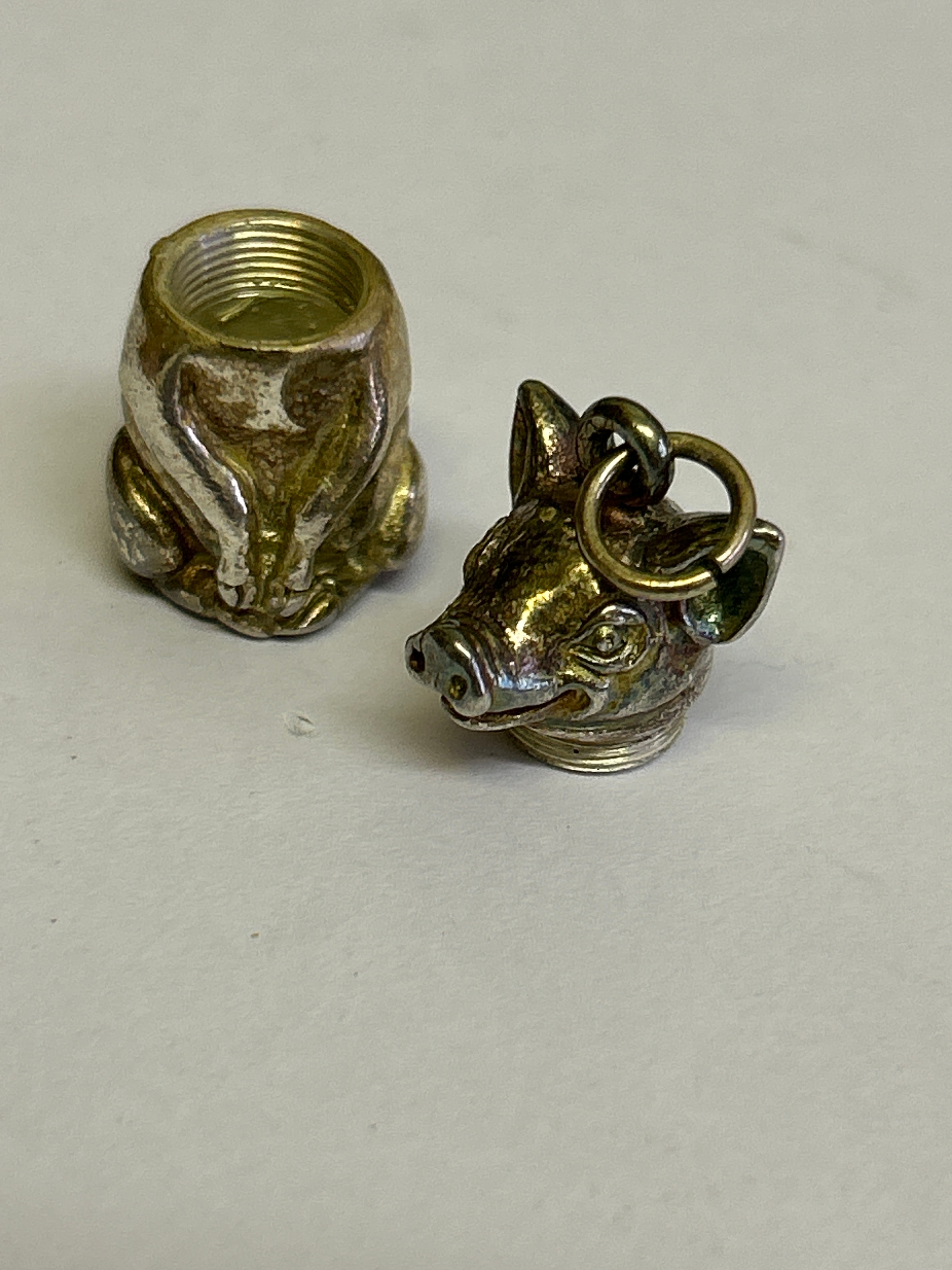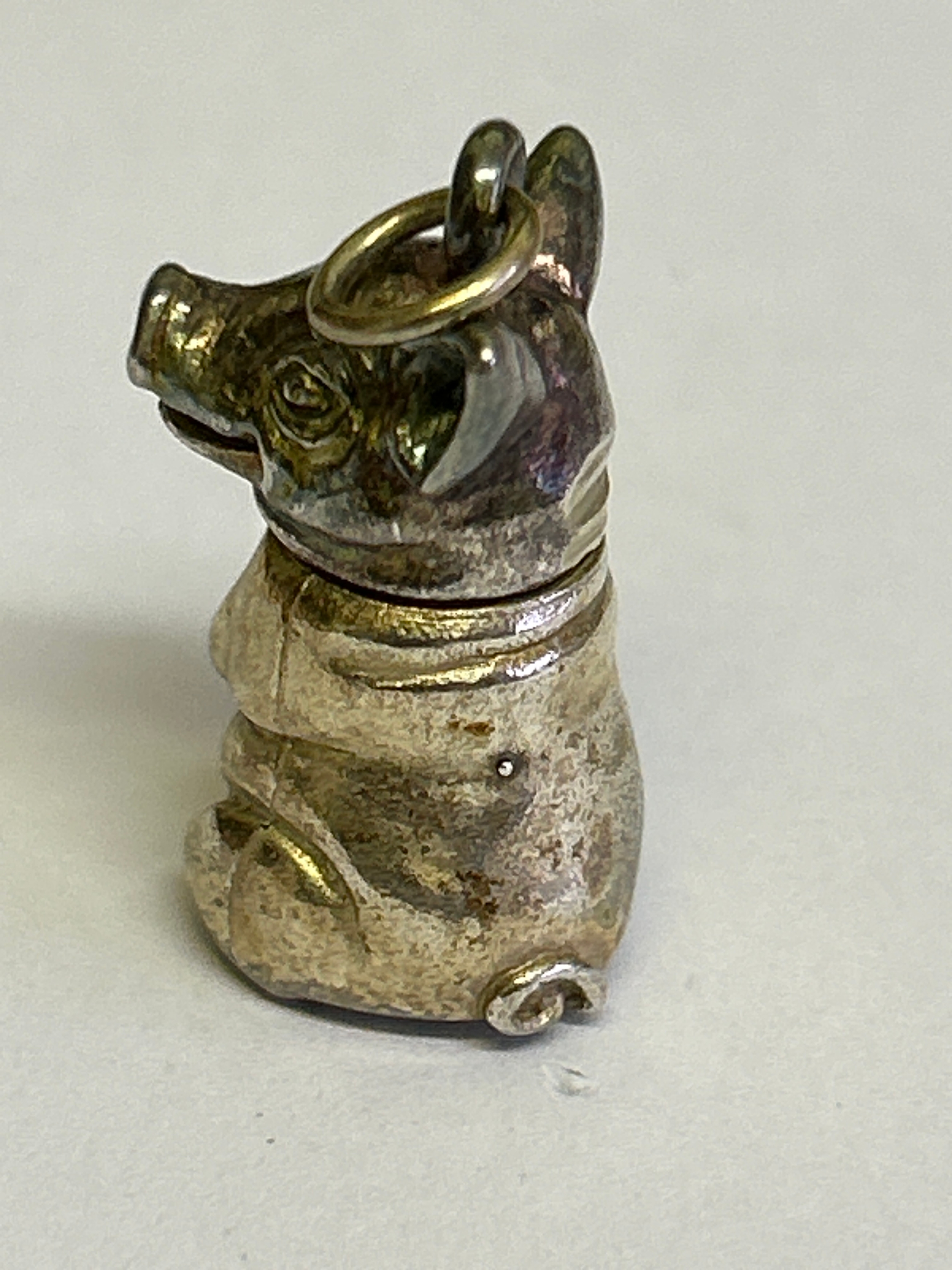 A sterling silver pig pill box with screw top lid, can be worn as a pendant. Hallmarked London 1999. 2.5cm 14 grams