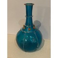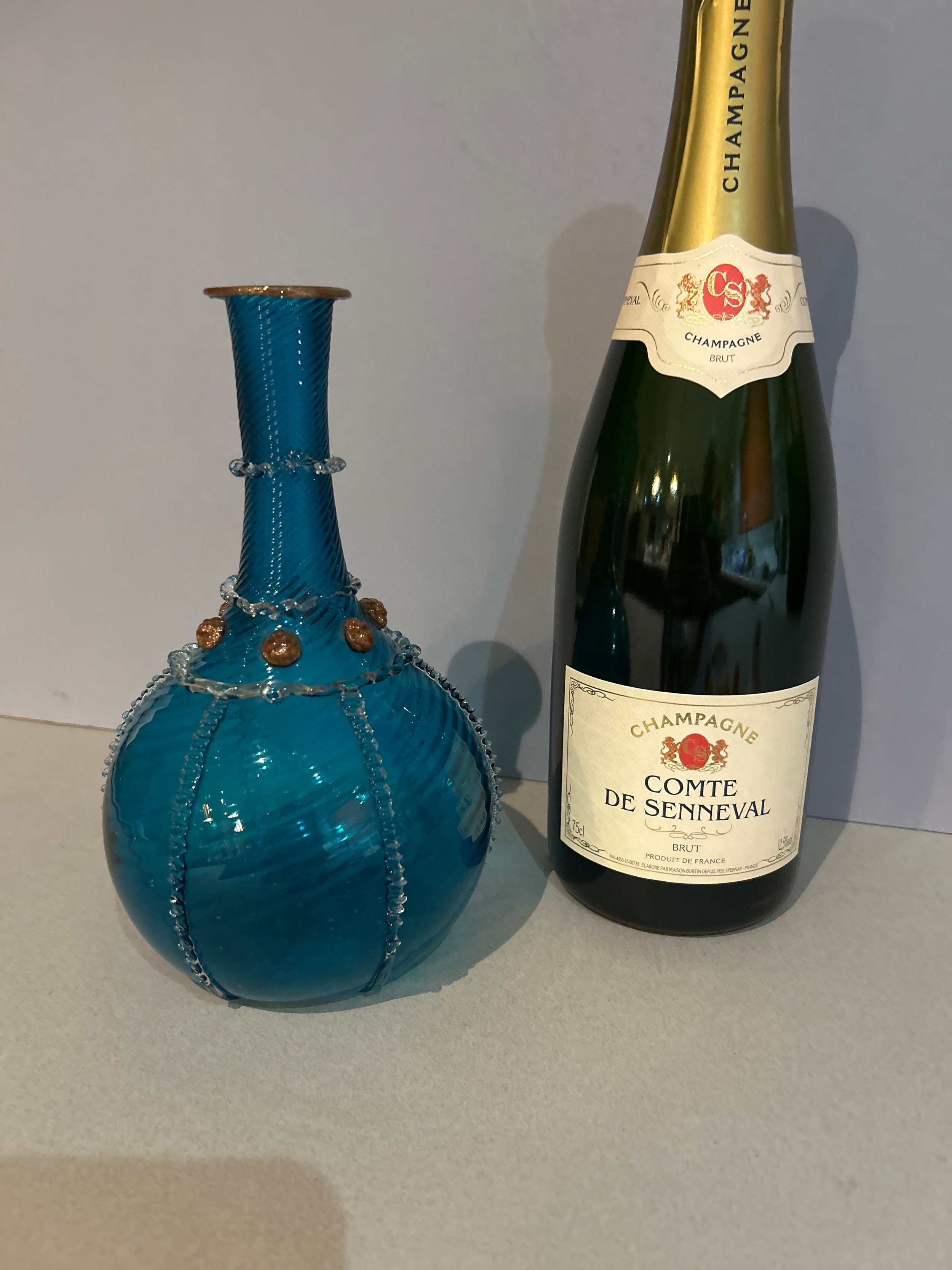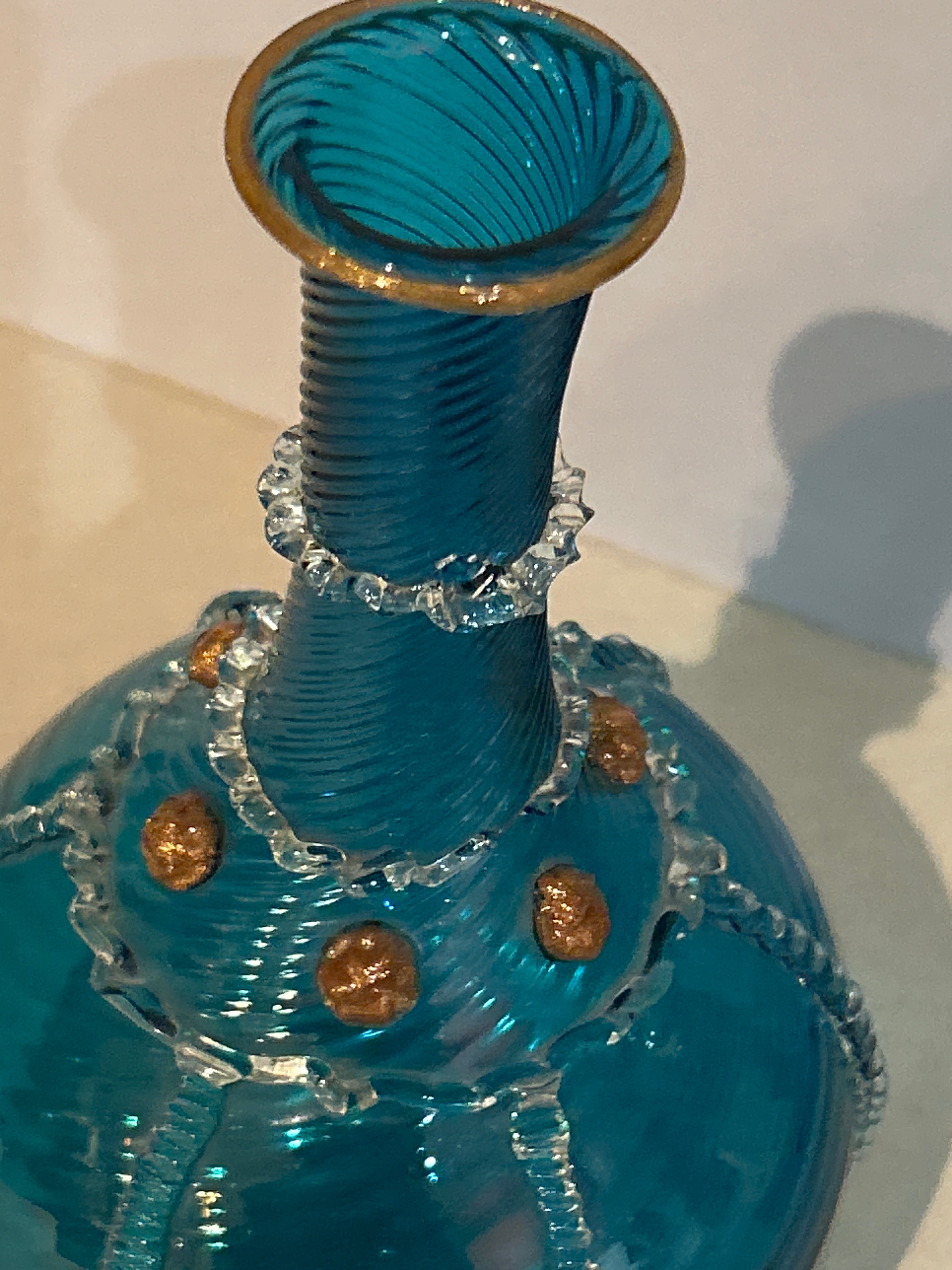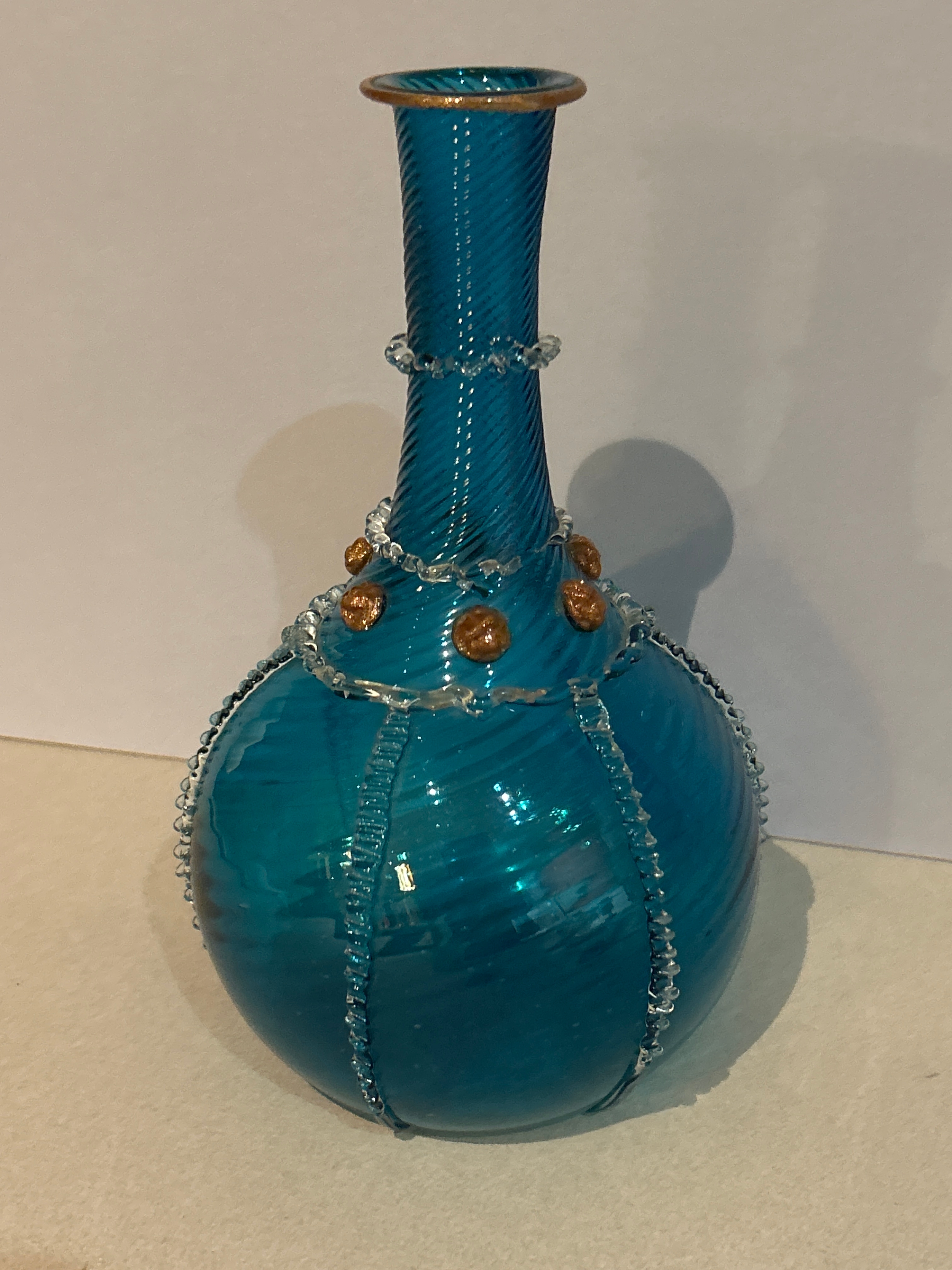 Antonio Salviati, Murano, attributed. An early 20th Century Venetian glass bottle vase with spiral twist body & neck, trailed with clear glass and gold leaf speckle detail. 20cm h