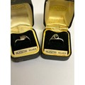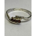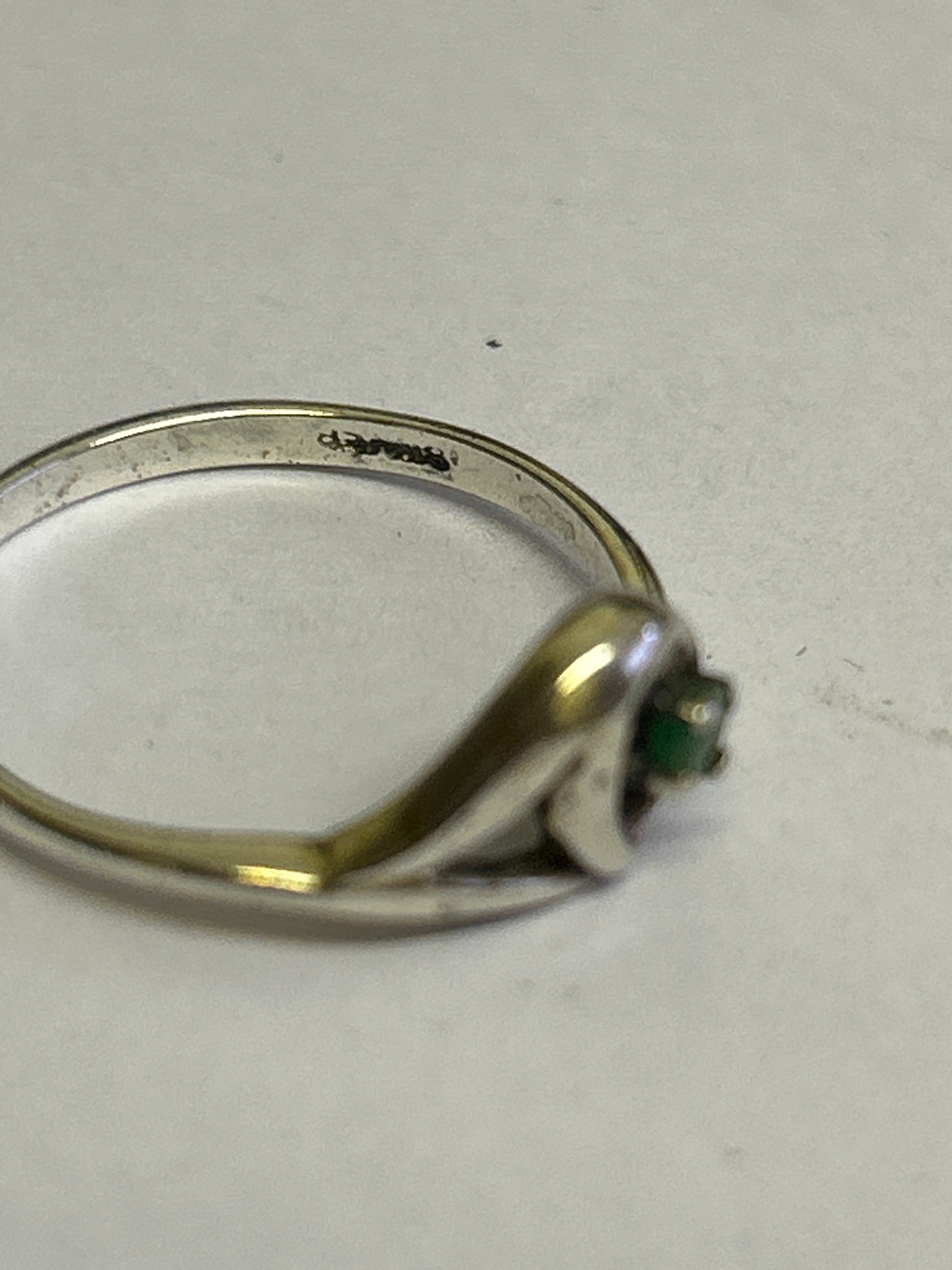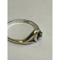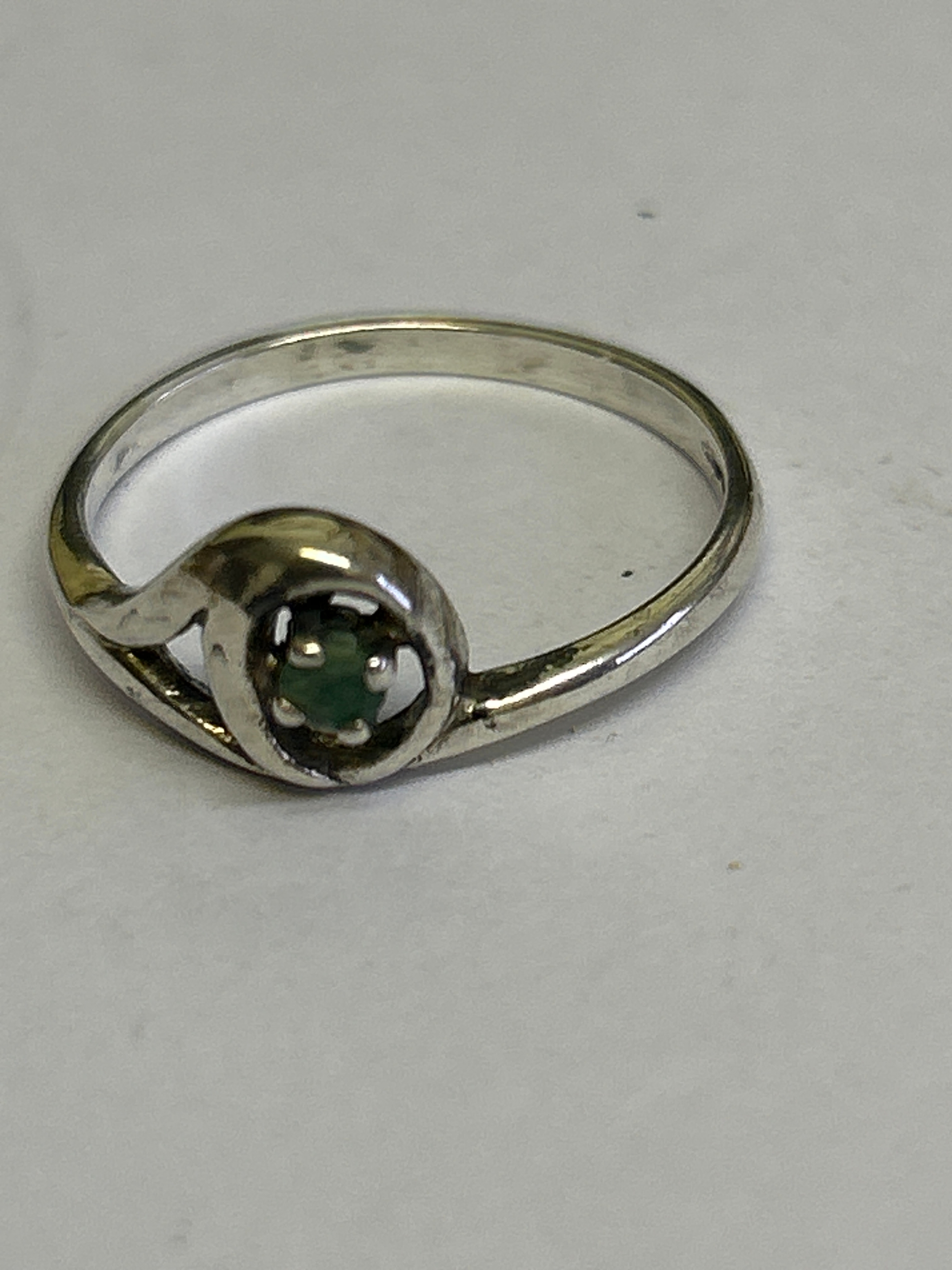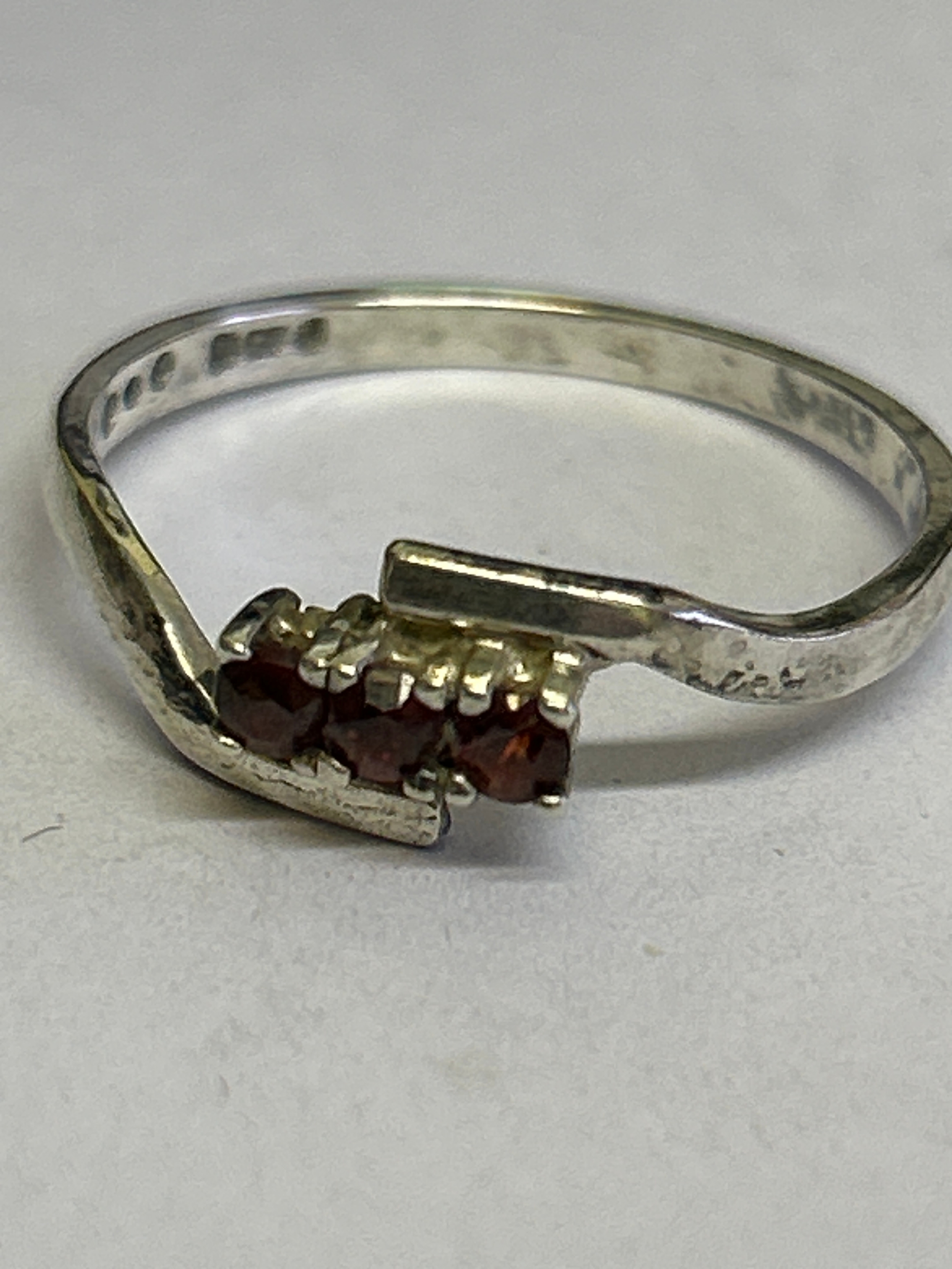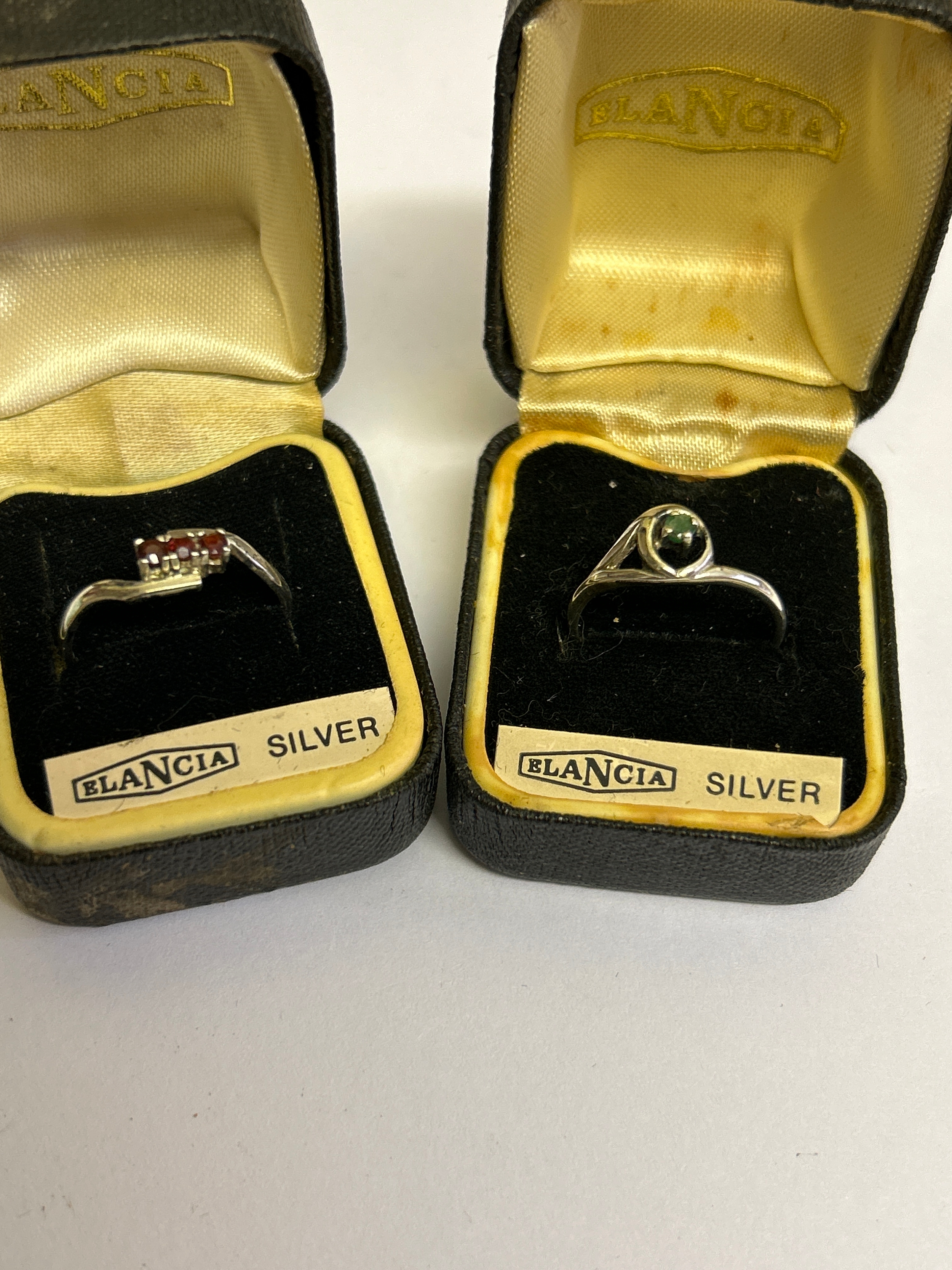 Two vintage sterling silver rings, one in crossover style with 3 garnet stones hallmarked Sheffield 1980, size P, the other in Art Nouveau style with a green stone marked “SILVER” size M