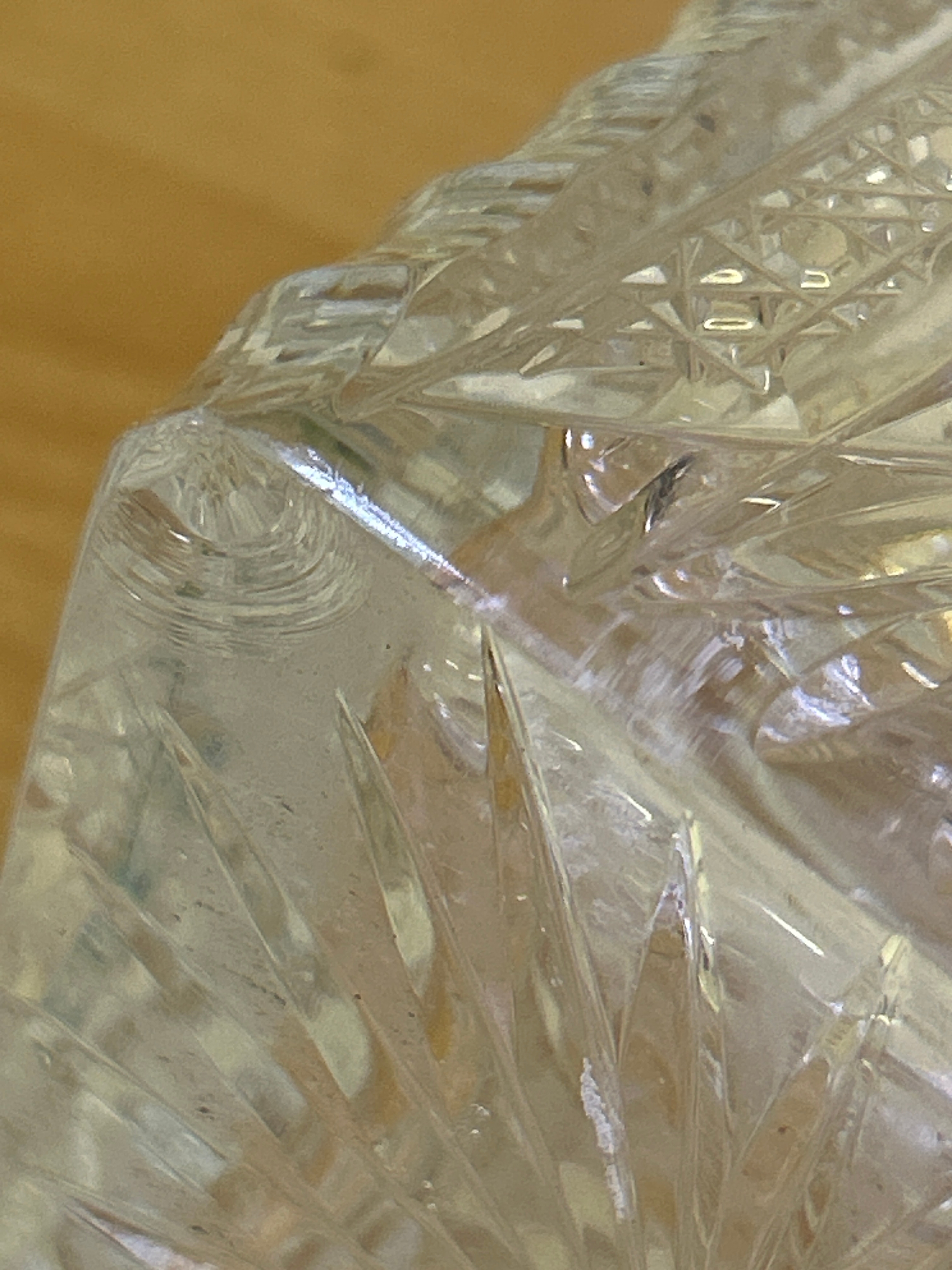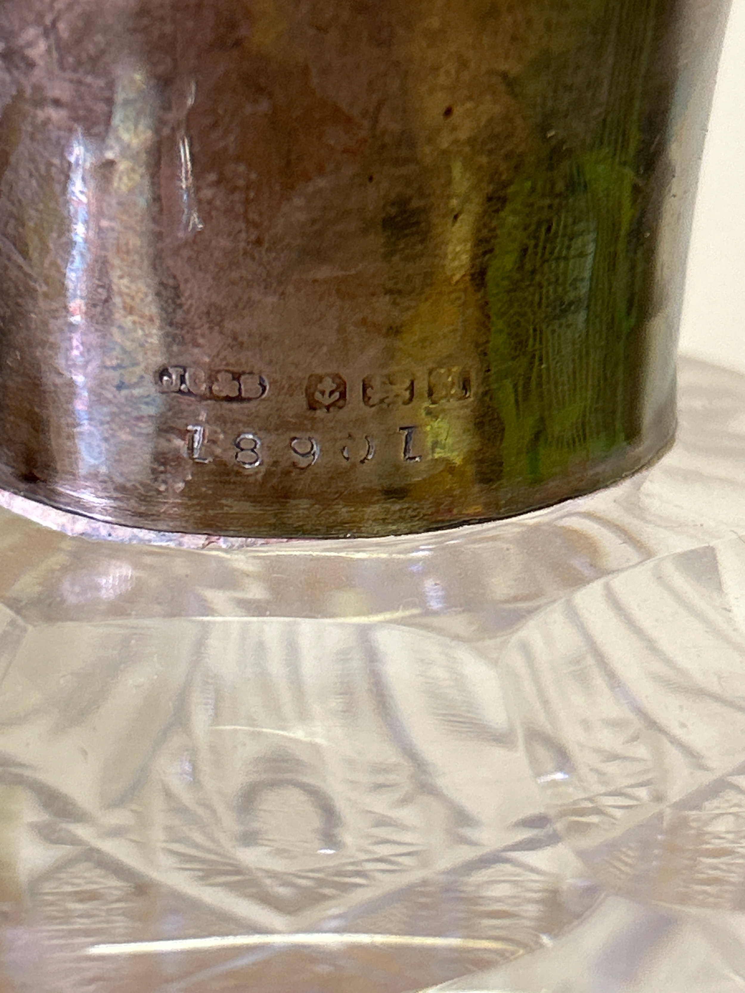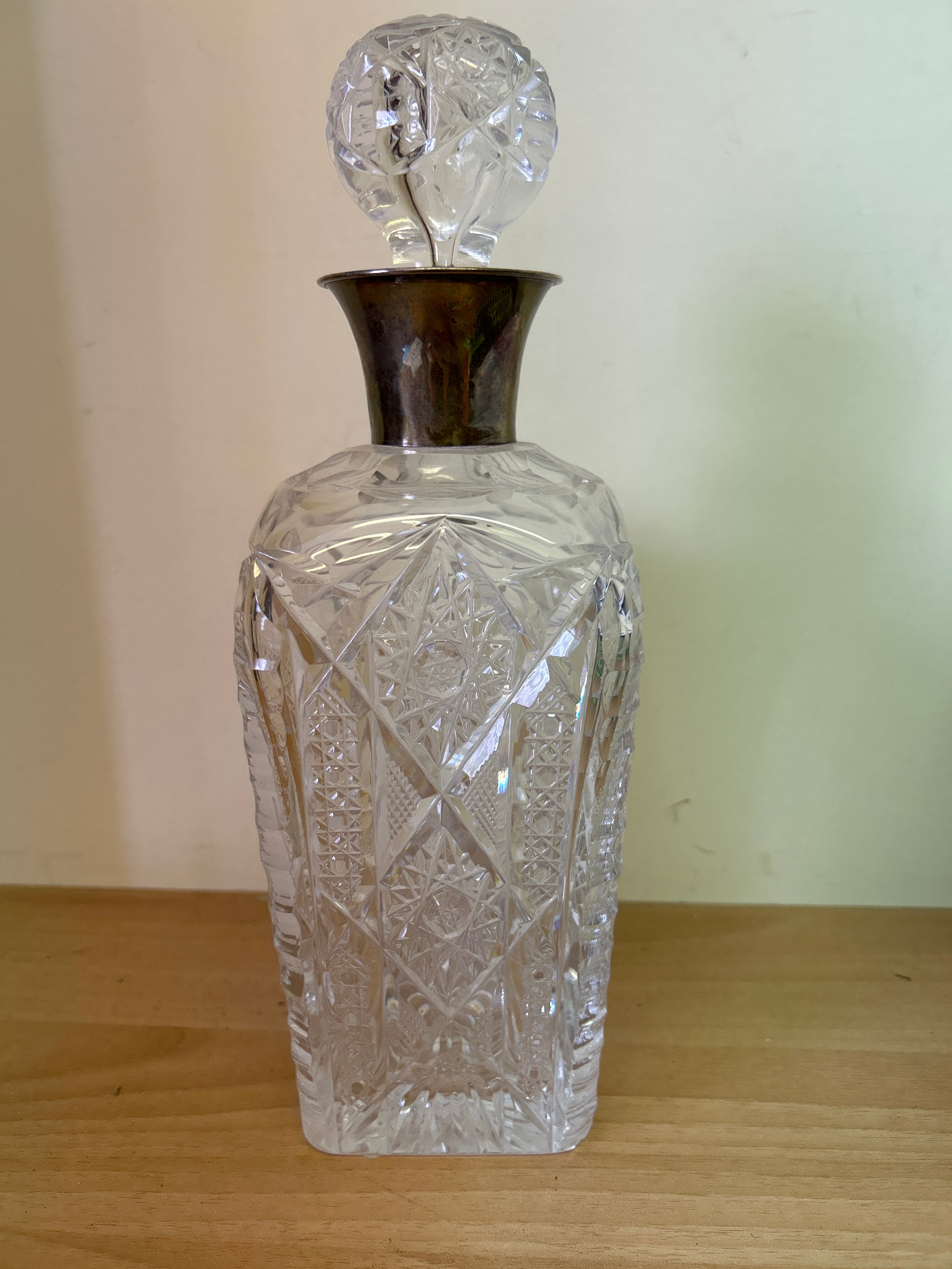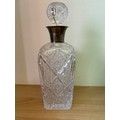 A 1930’s heavy cut crystal decanter & stopper with a silver collar hallmarked Birmingham 1936. John Grinsell & Sons. Chip to bottom corner on the underside- see photo
