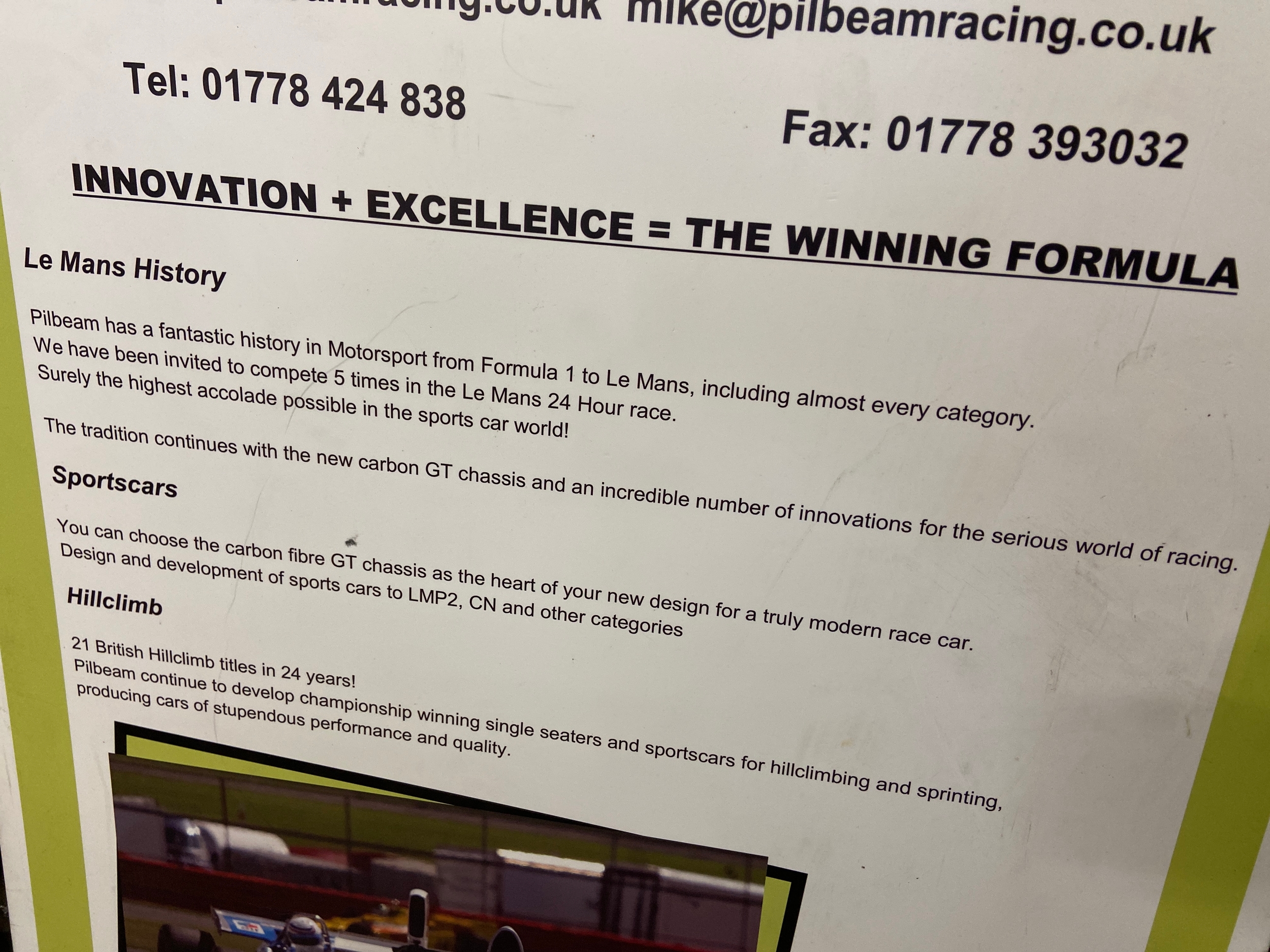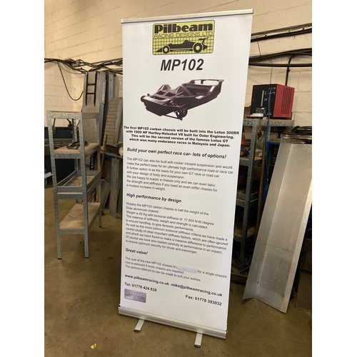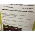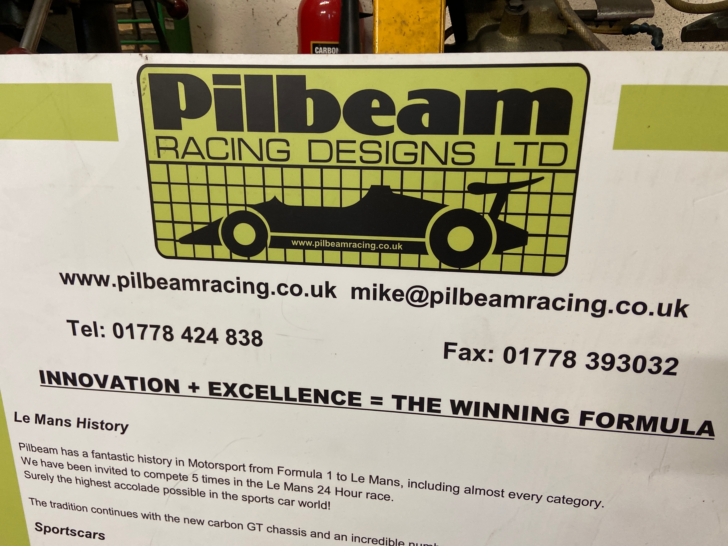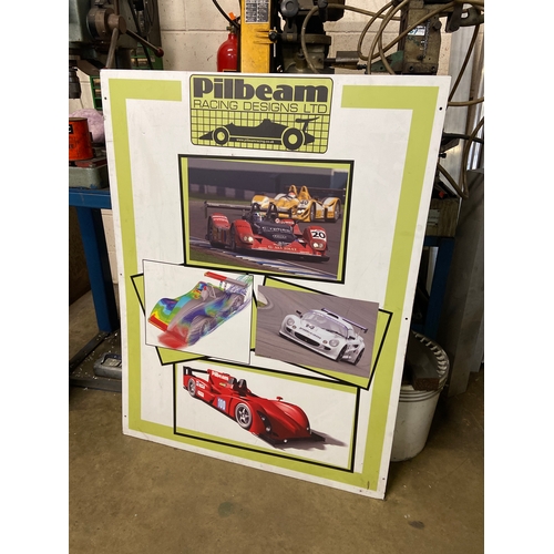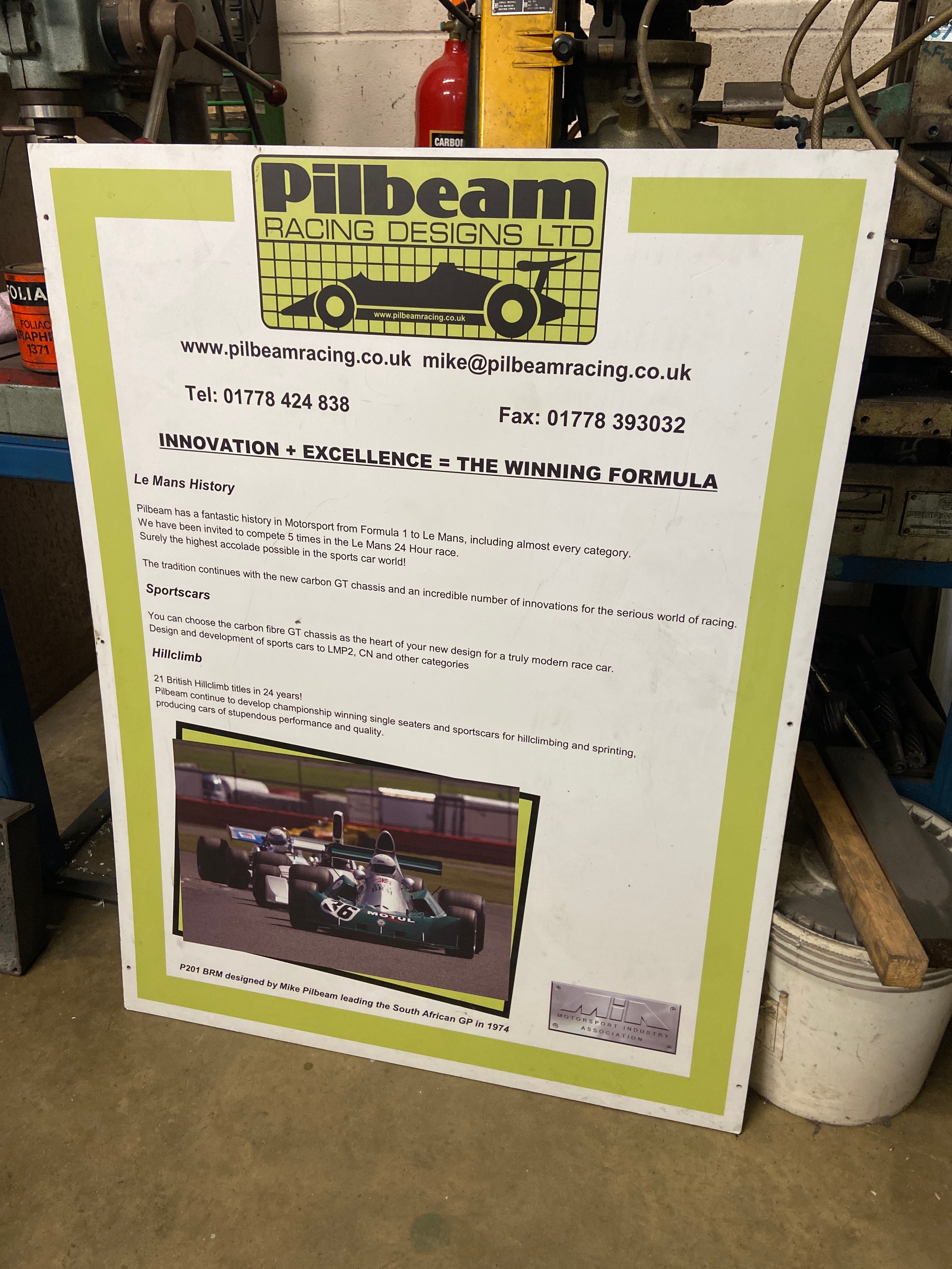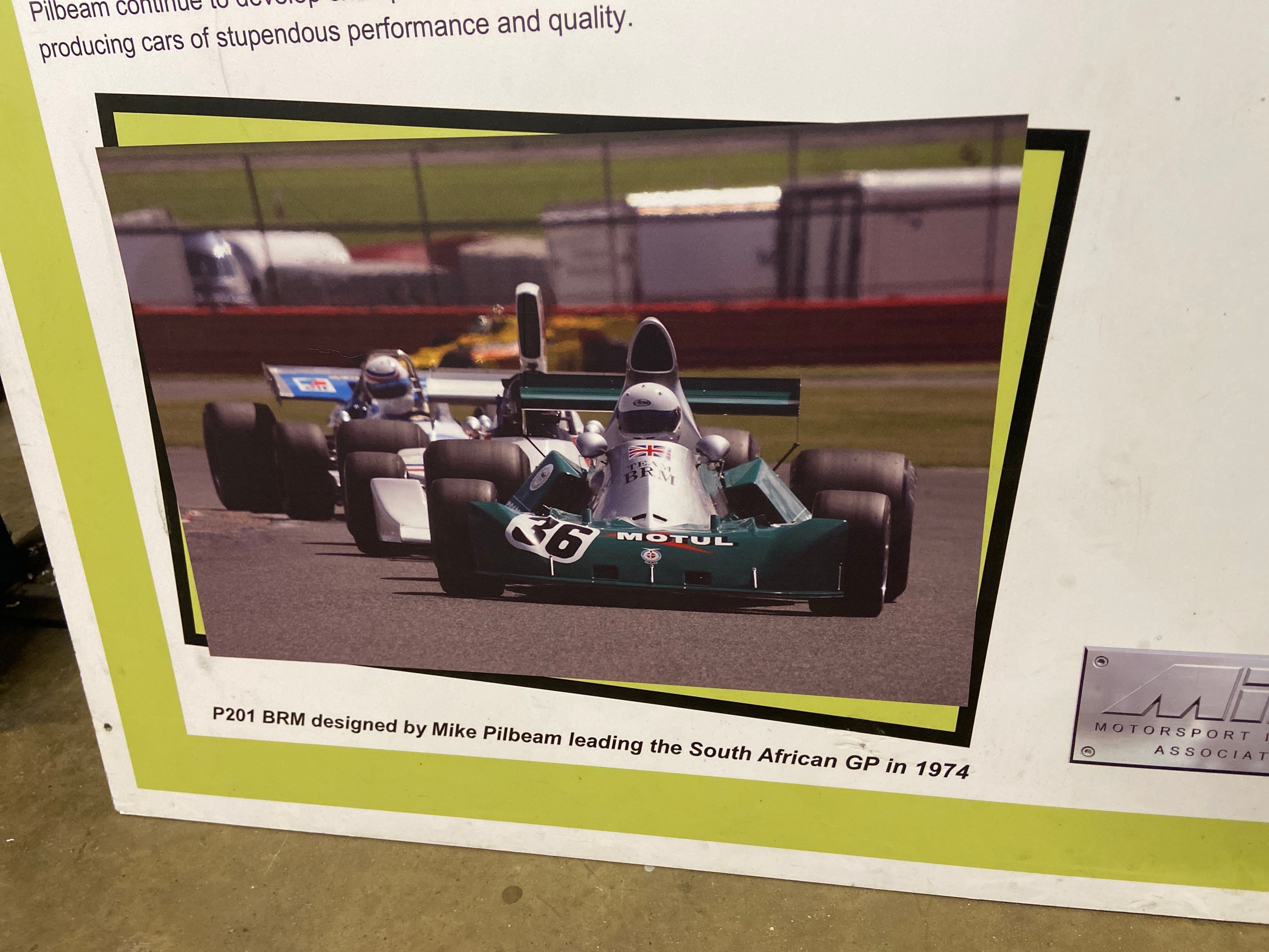 Pilbeam Racing Designs Ltd promotional board - “Innovation + Excellence = The Winning Formula”. Including history on Le Mans, Sportscars and Hillclimb, along with the image of the iconic P201 BRM at the 2009 Silverstone Classic event, during one of the historic F1 races, which was designed by Mike Pilbeam. (Photo taken by Rick Wilson).