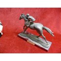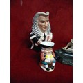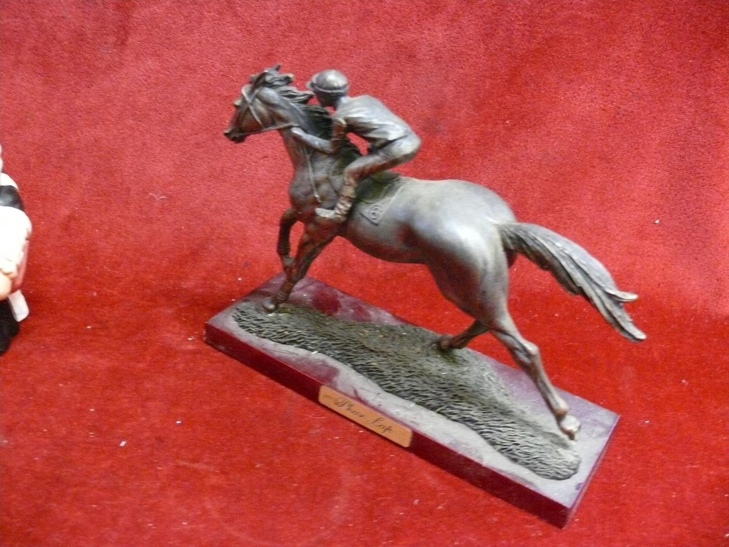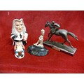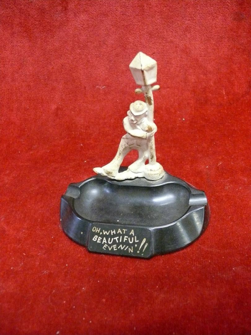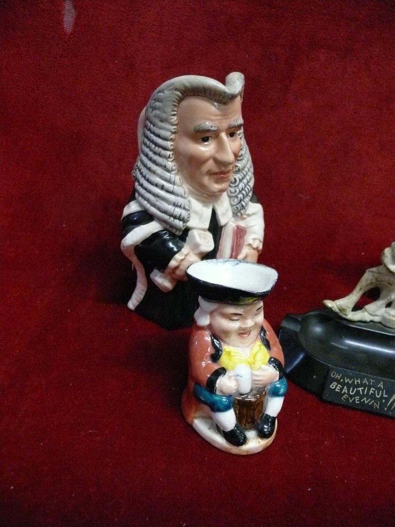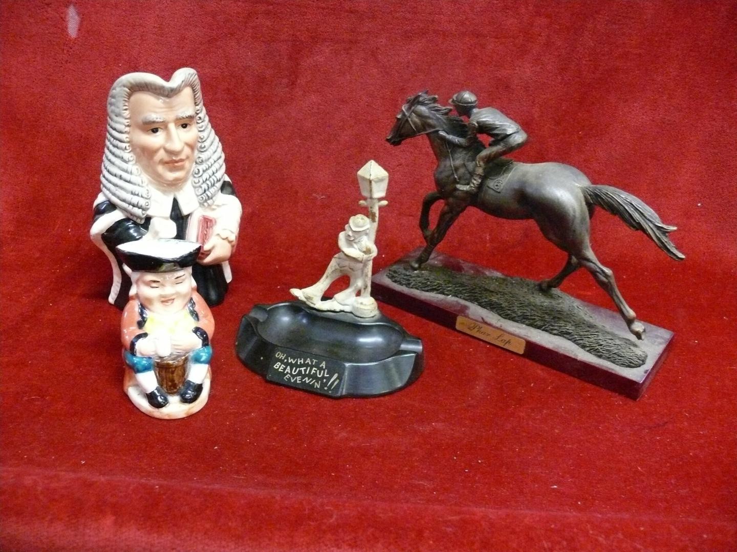 VINTAGE SELCOL "VOGUE" BAKELITE ASHTRAY, WITH A FIGURINE OF A MAN LEANING ON A LAMPPOST AND THE INSCRIPTION "OH, WHAT A BEAUTIFUL EVENIN'!!". TOGETHER WITH SMALL DARTINGTON WARE TOBY JUG, A TOBY JUG MODELLED LIKE A JUDGE AND A GALLOPING RACEHORSE AND JOCKEY RESIN STATUE.