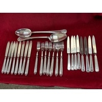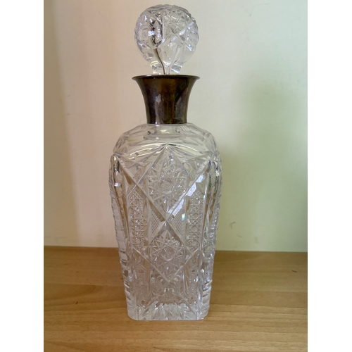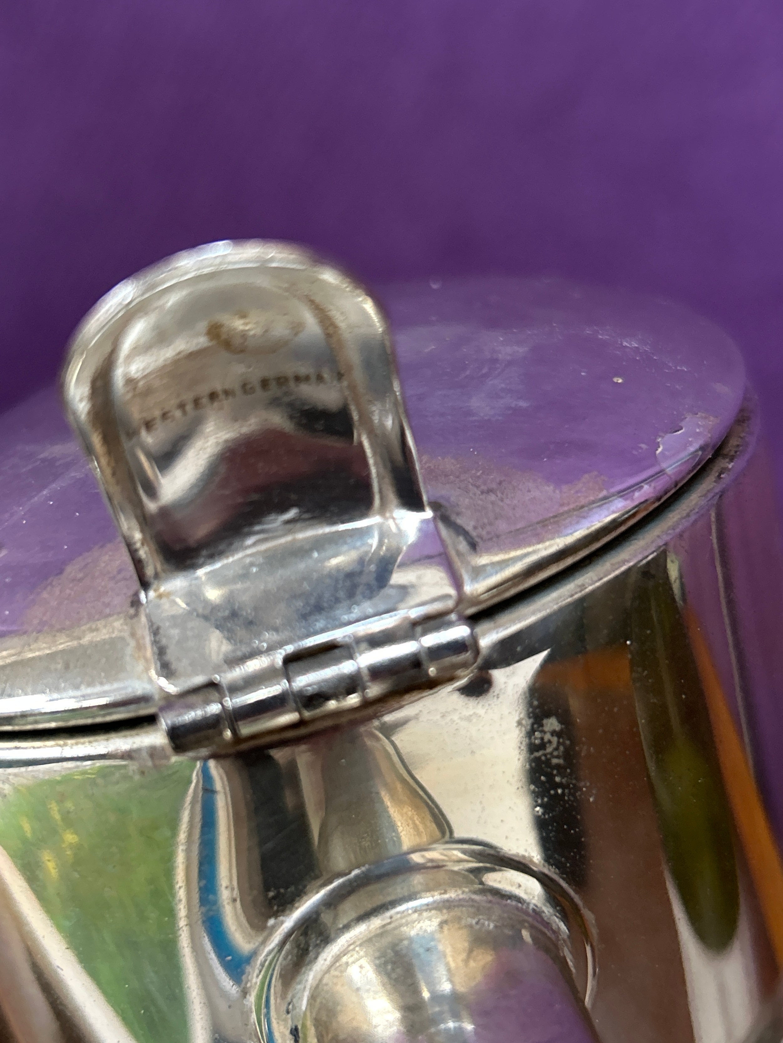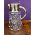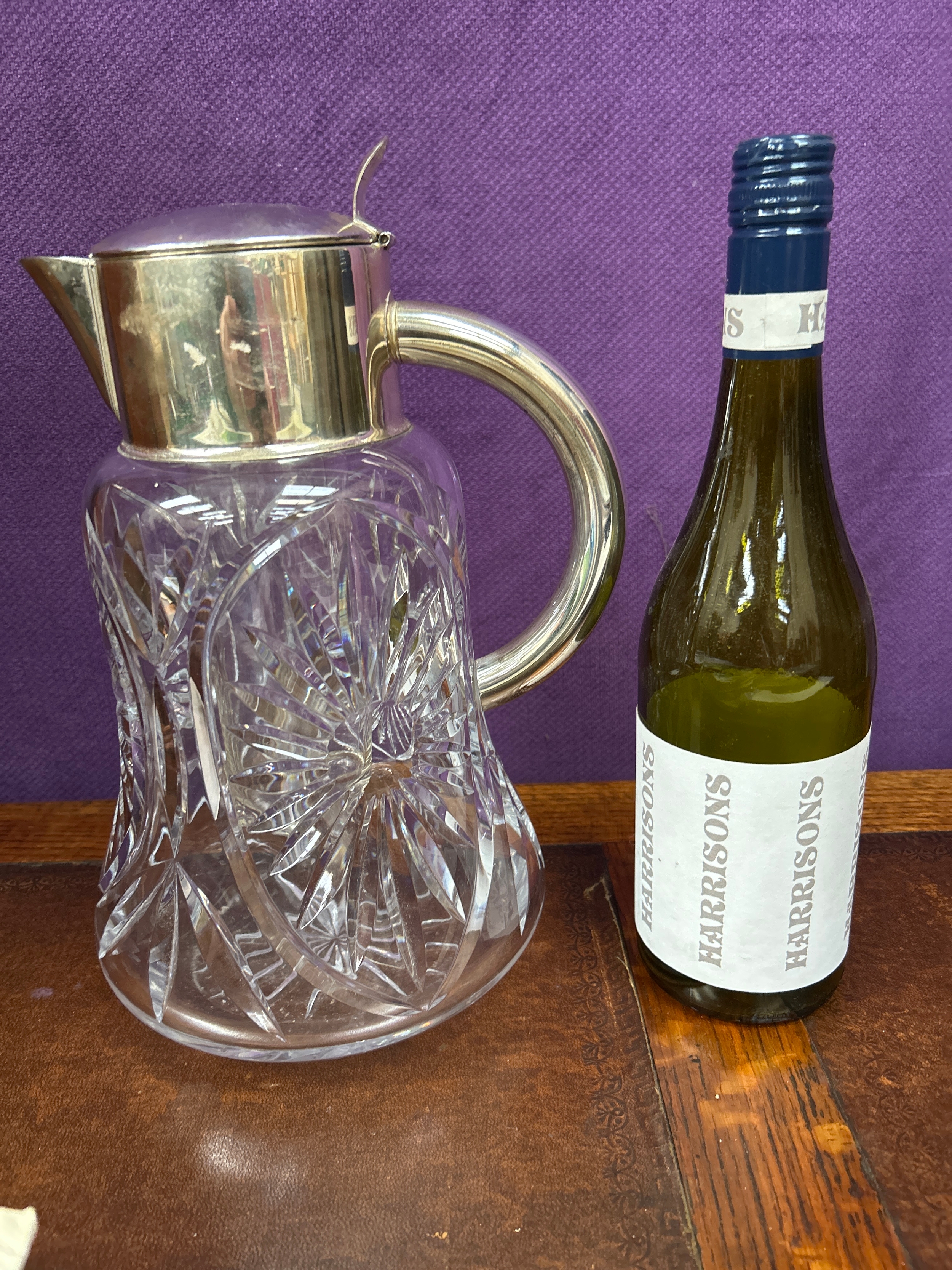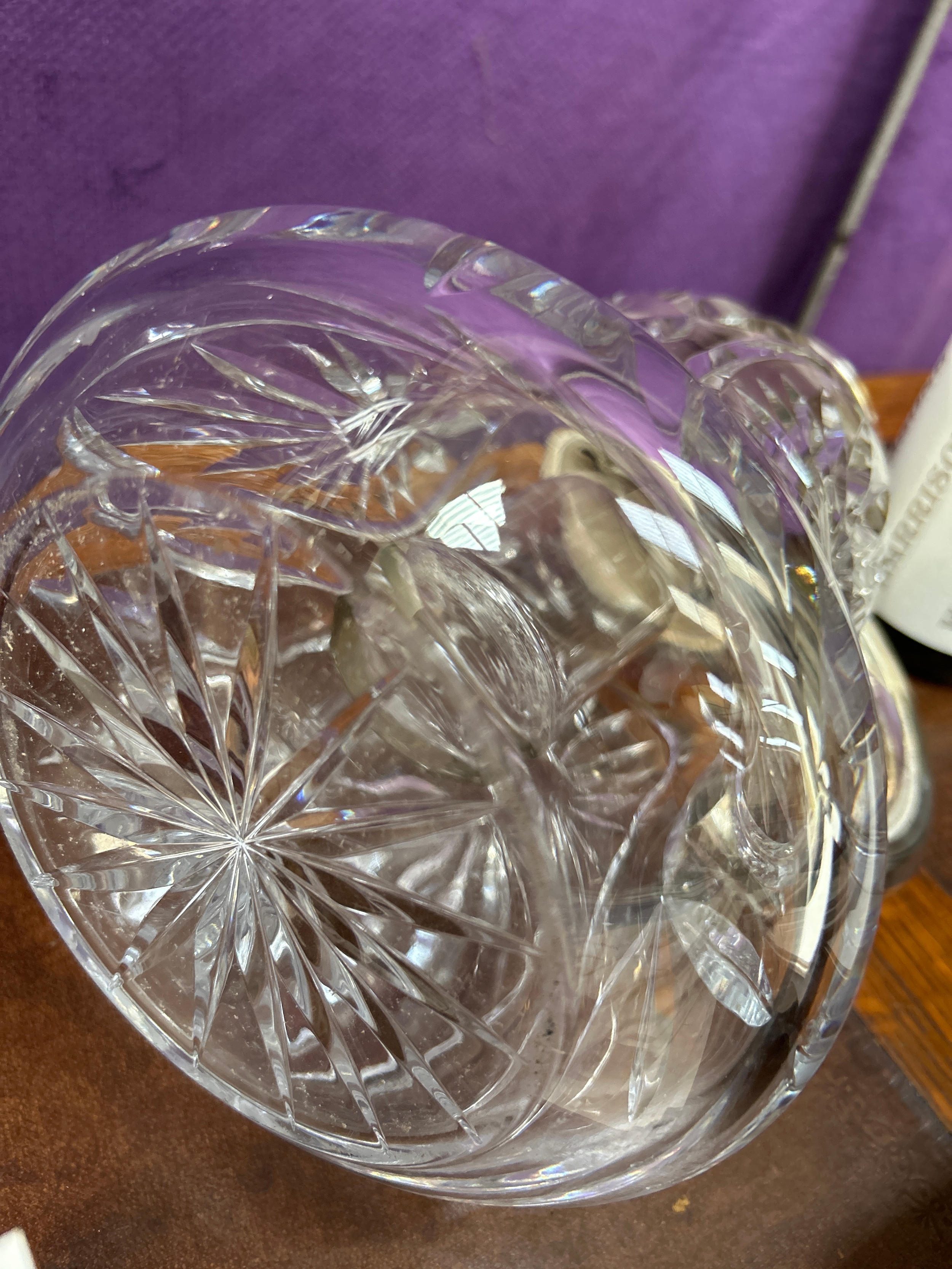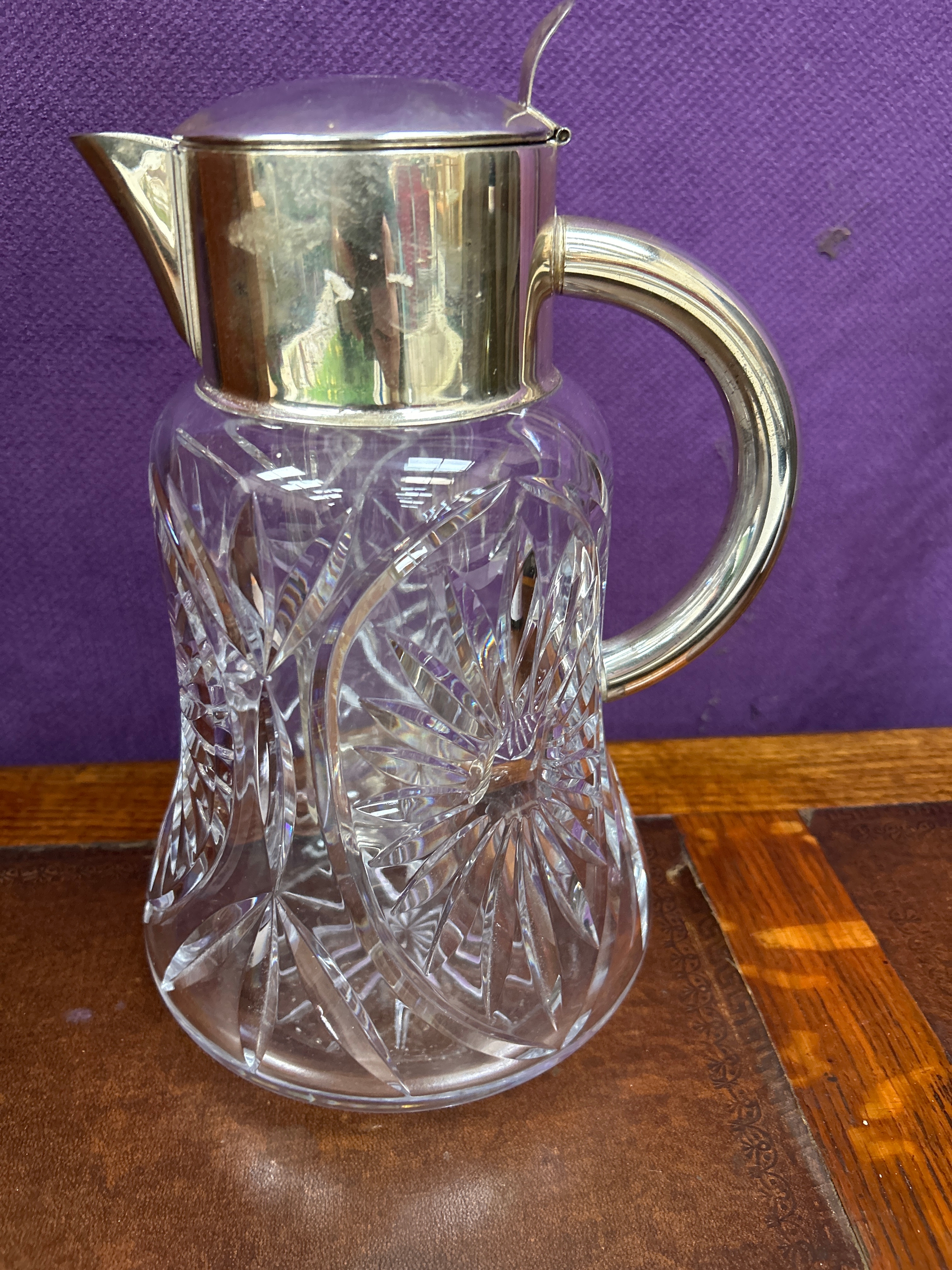 A large & heavy West German cut glass & silver plated wine jug with glass liner for ice. The thumb piece marked “Western Germany”. 29cm h