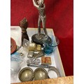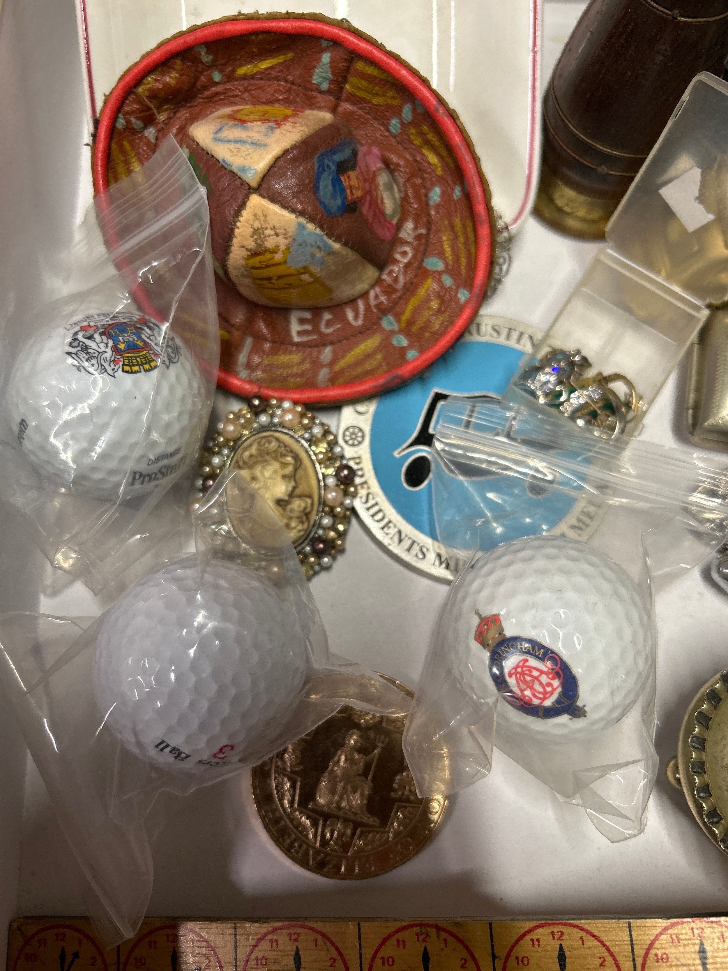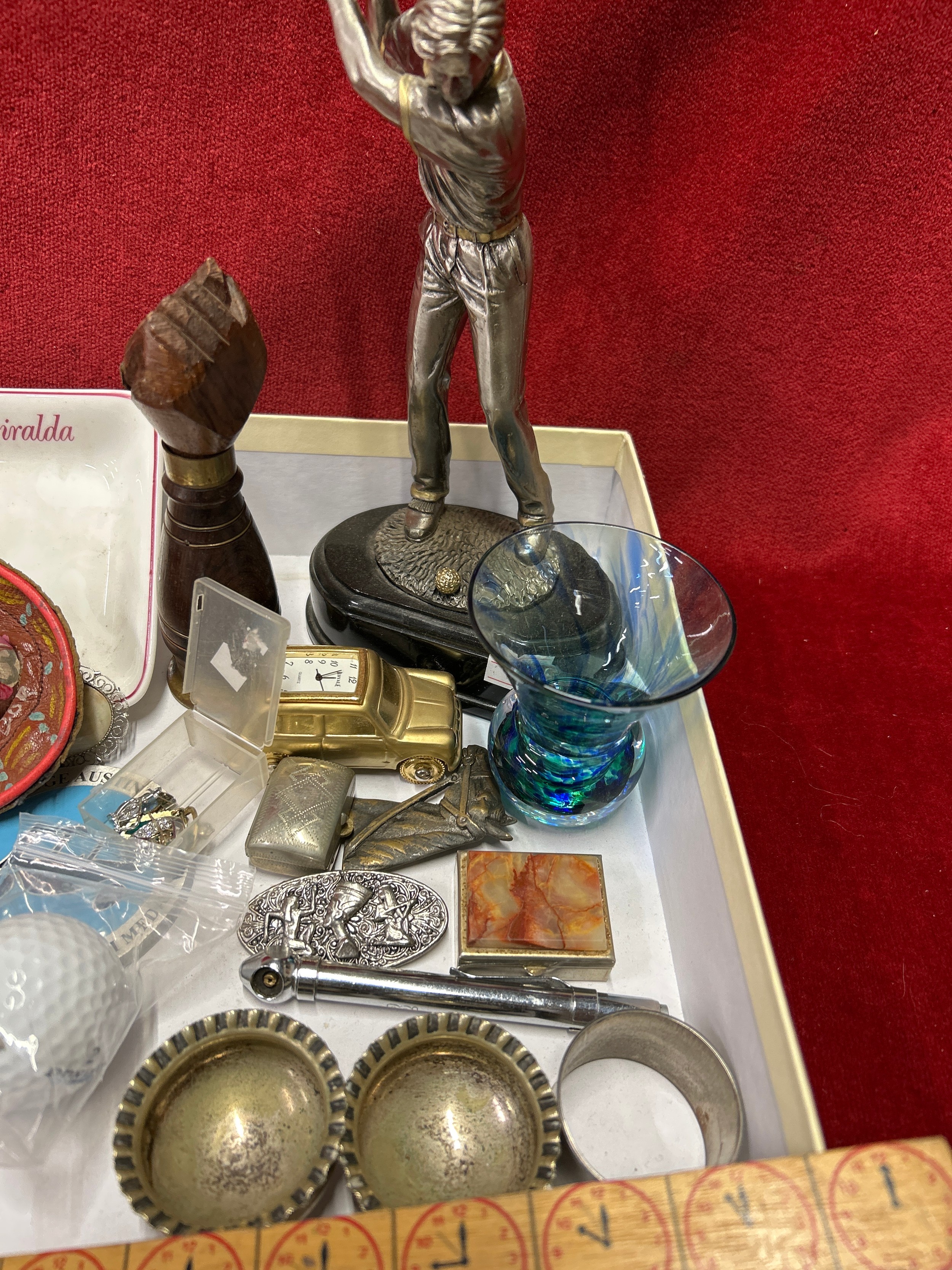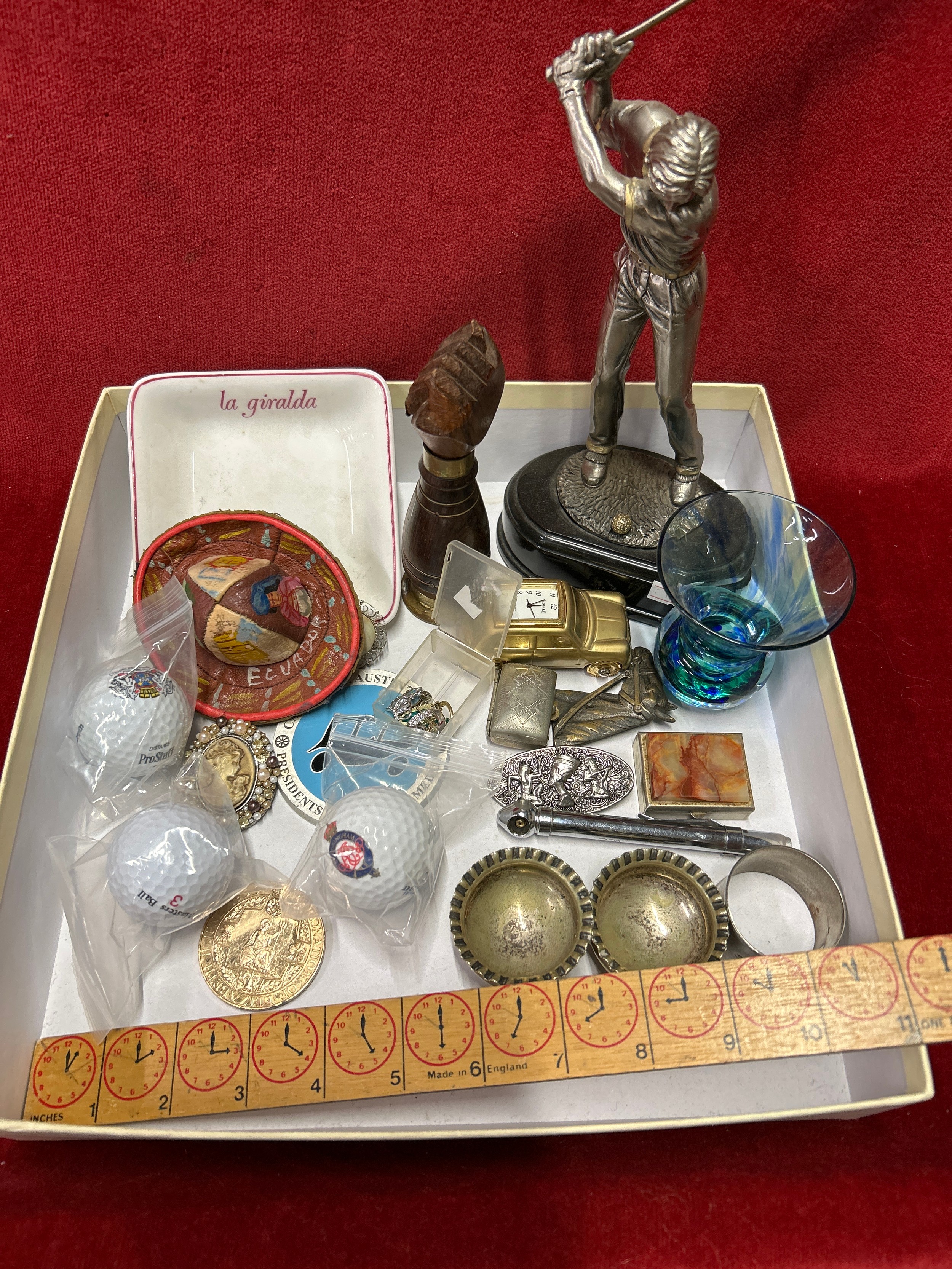 Box of mixed Collectables inc jewellery, pill boxes, golf trophy, golf balls, Victorian salts etc