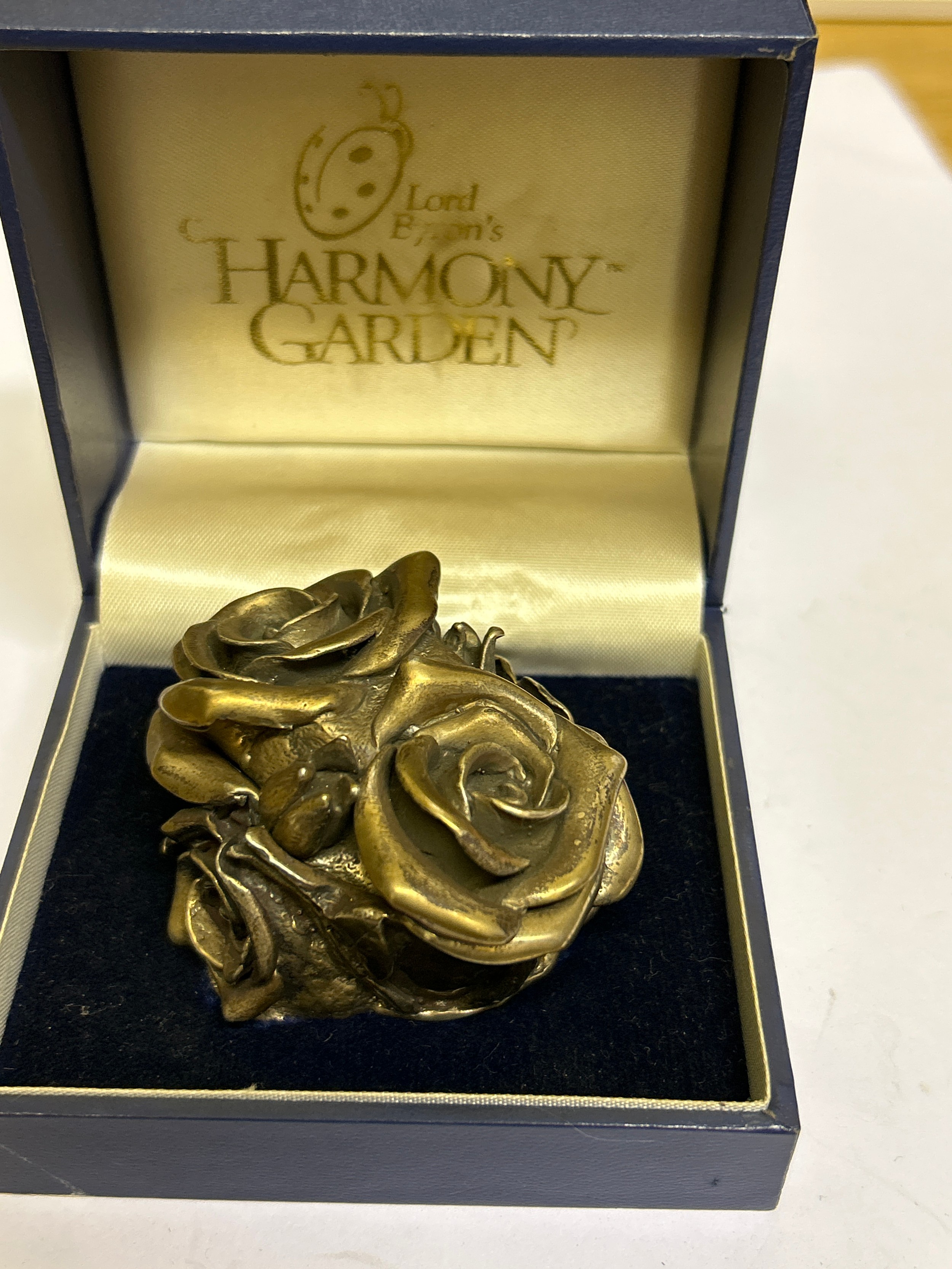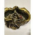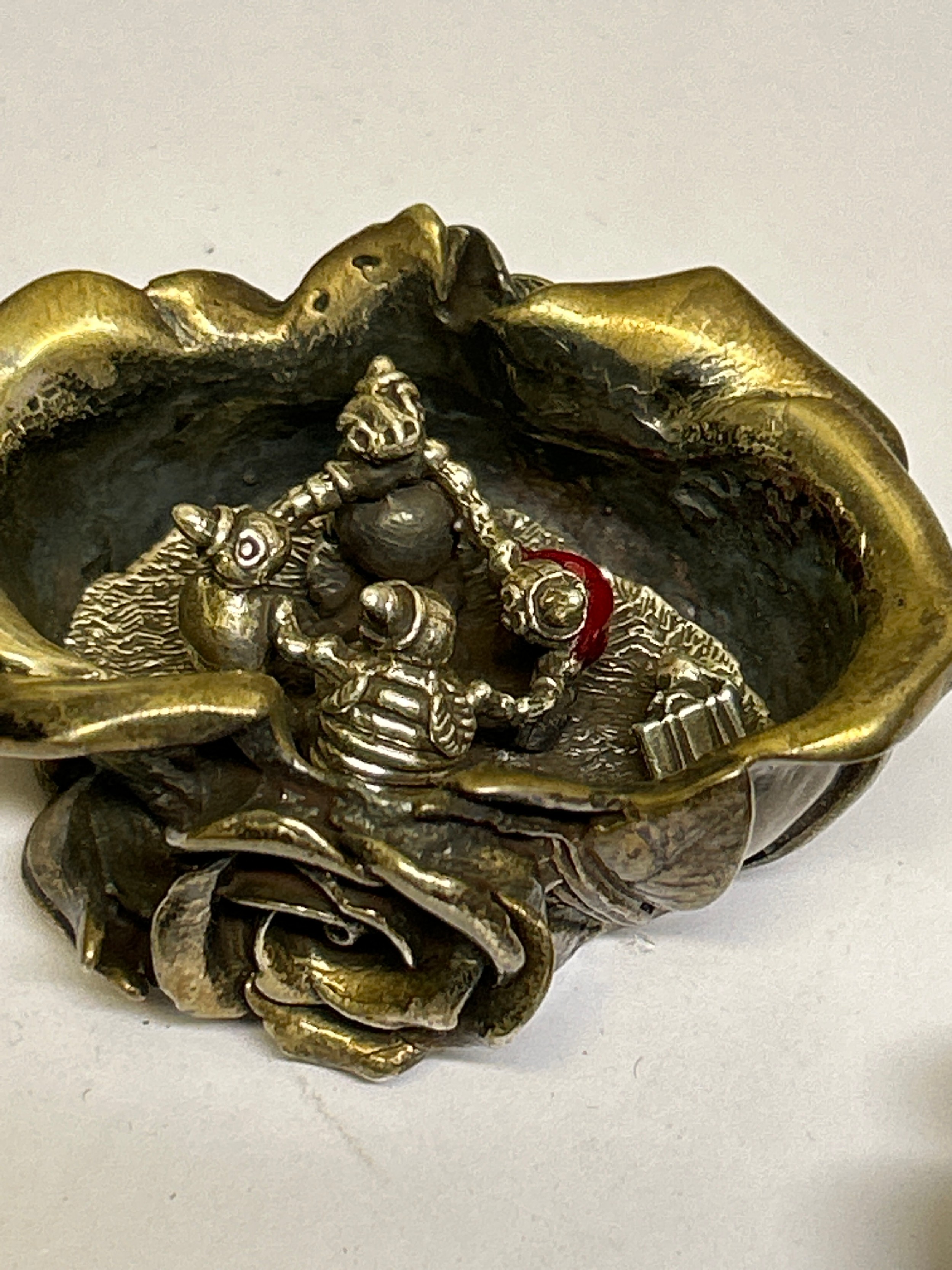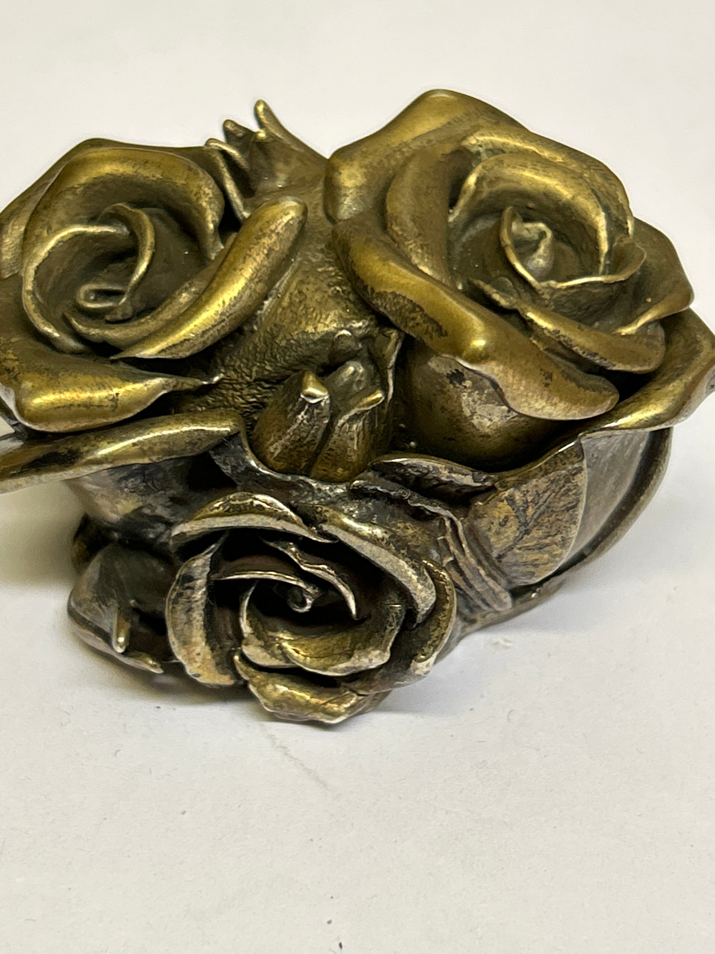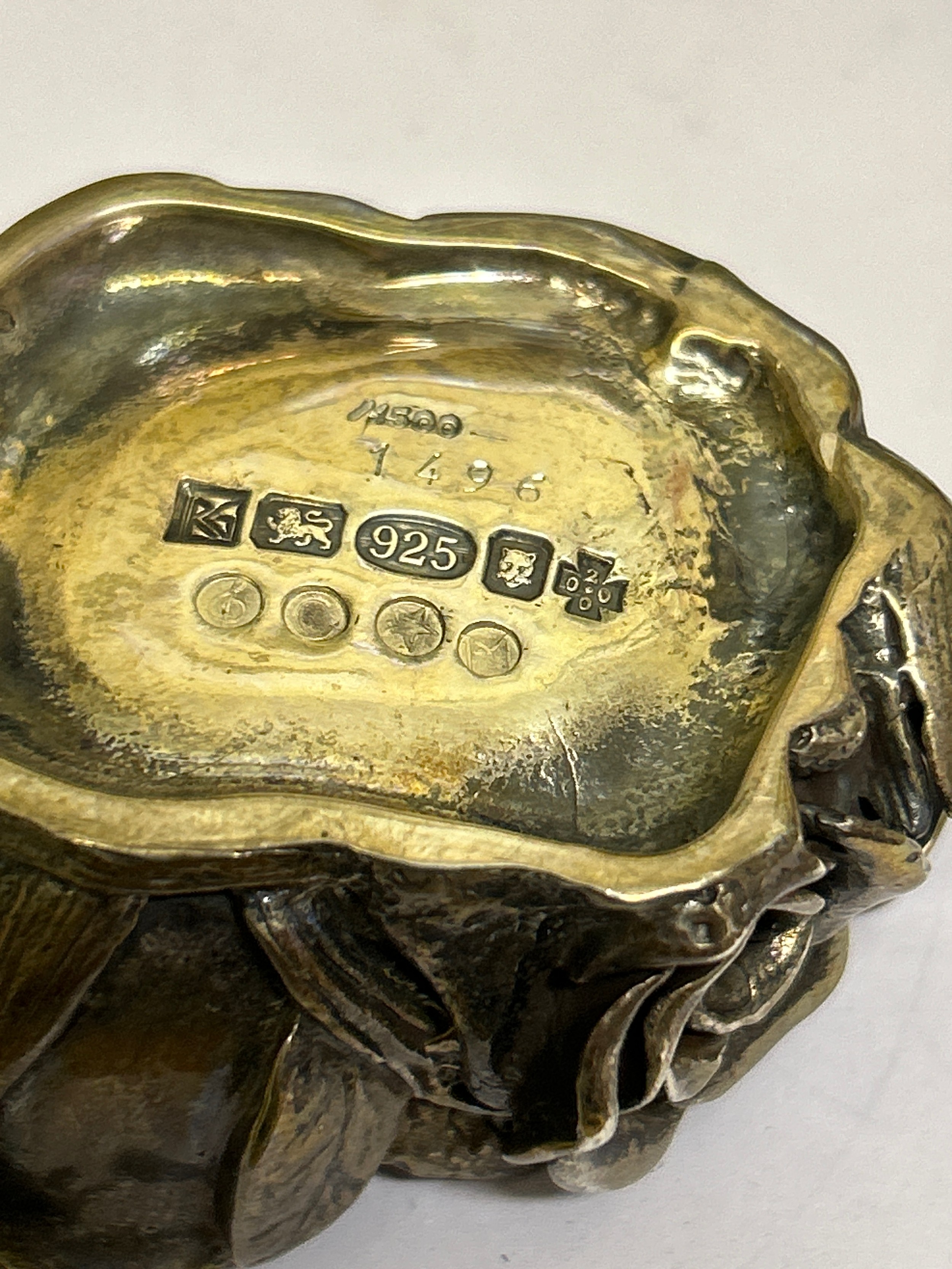 A very heavy Sterling Silver lidded pot in the form of roses, the inside with a miniature group of four creatures dancing around a fire including a ladybird with a red enamelled back. Millenium hallmarks 2000 by designer silversmith Robert Glover. 257 grams