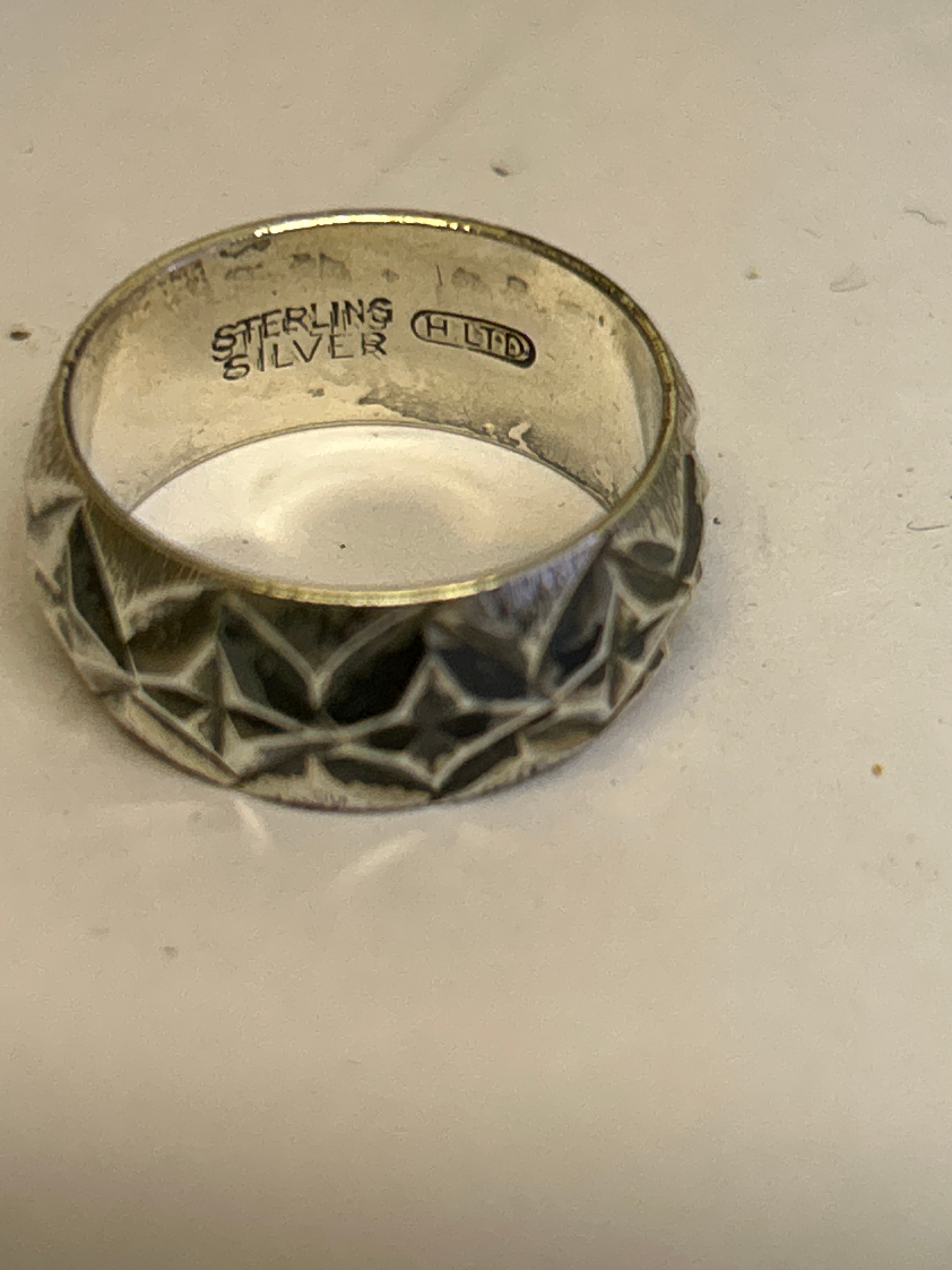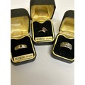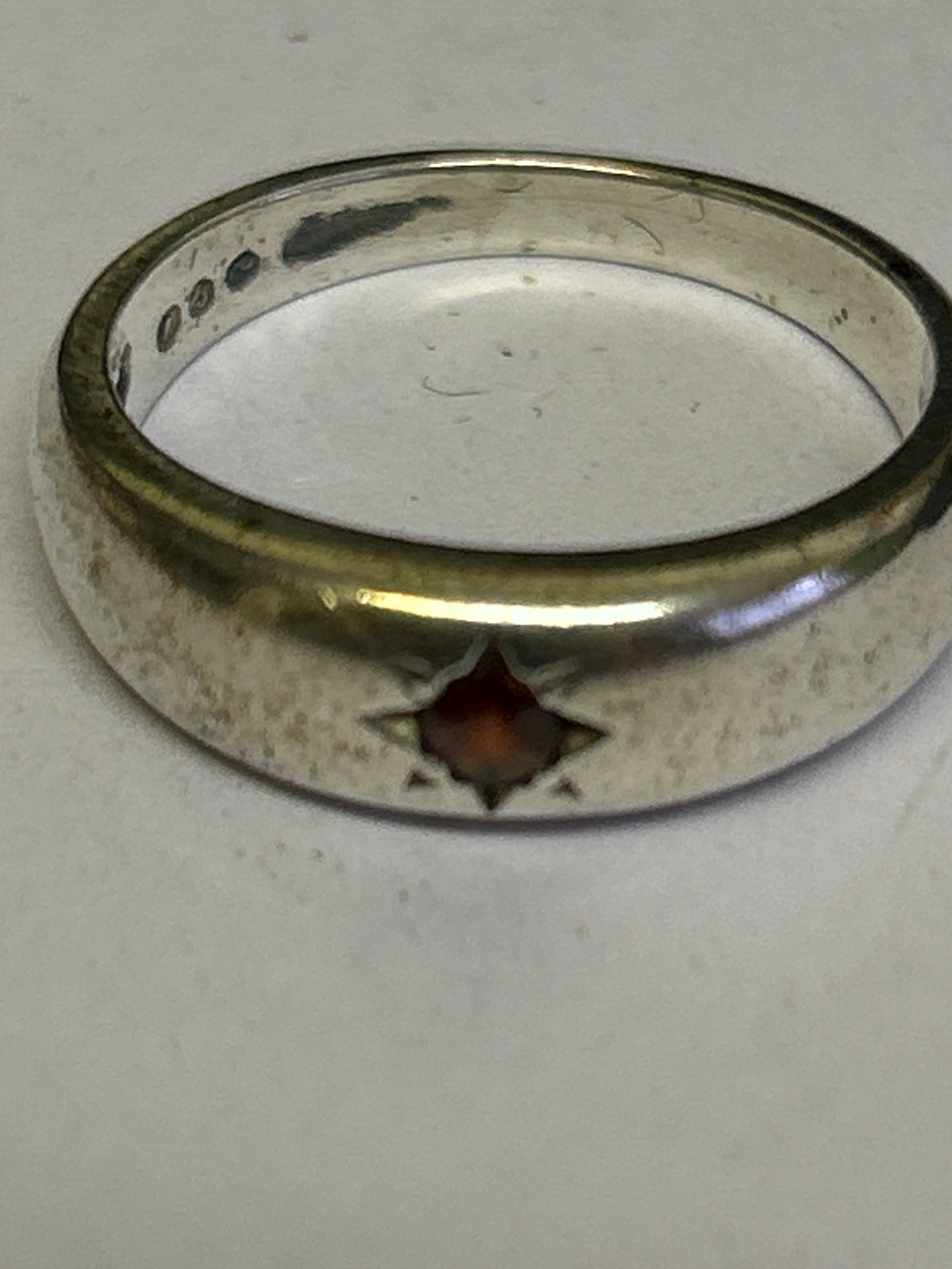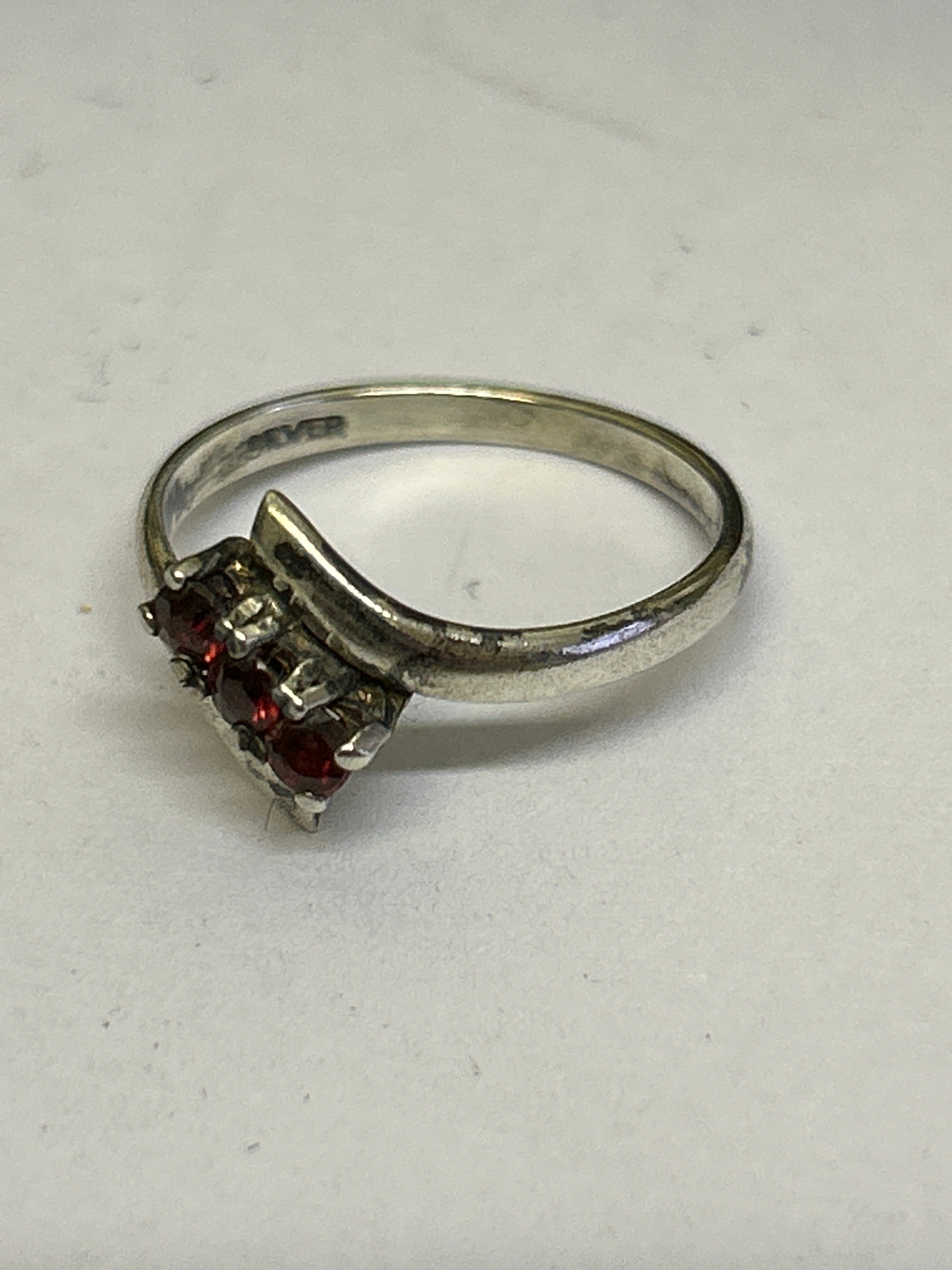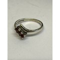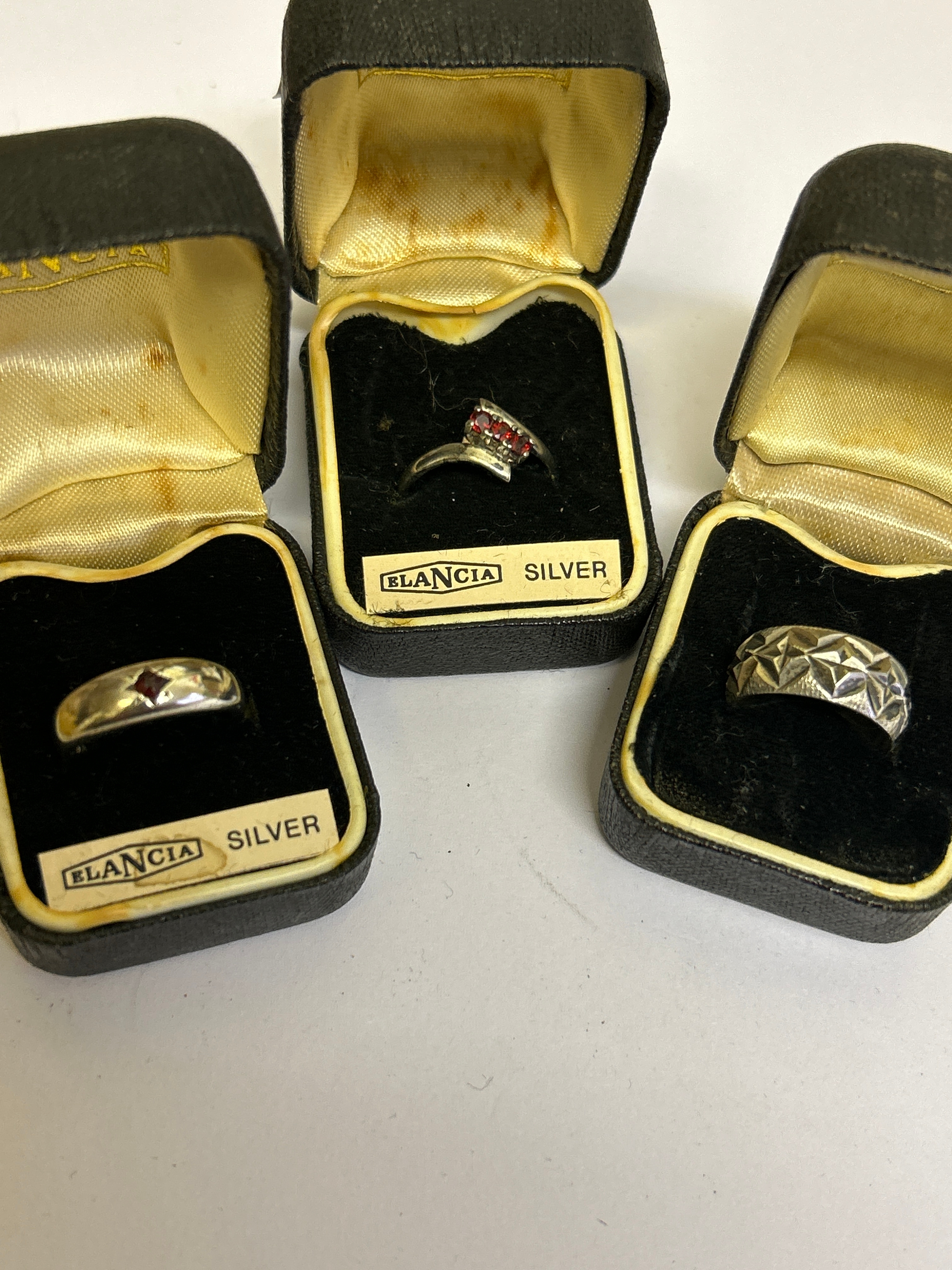 3 Sterling silver vintage rings, including a flush mounted ring with garnet (size L) a crossover ring with 3 red stones (size L) and a wide band ring with star design (size K)